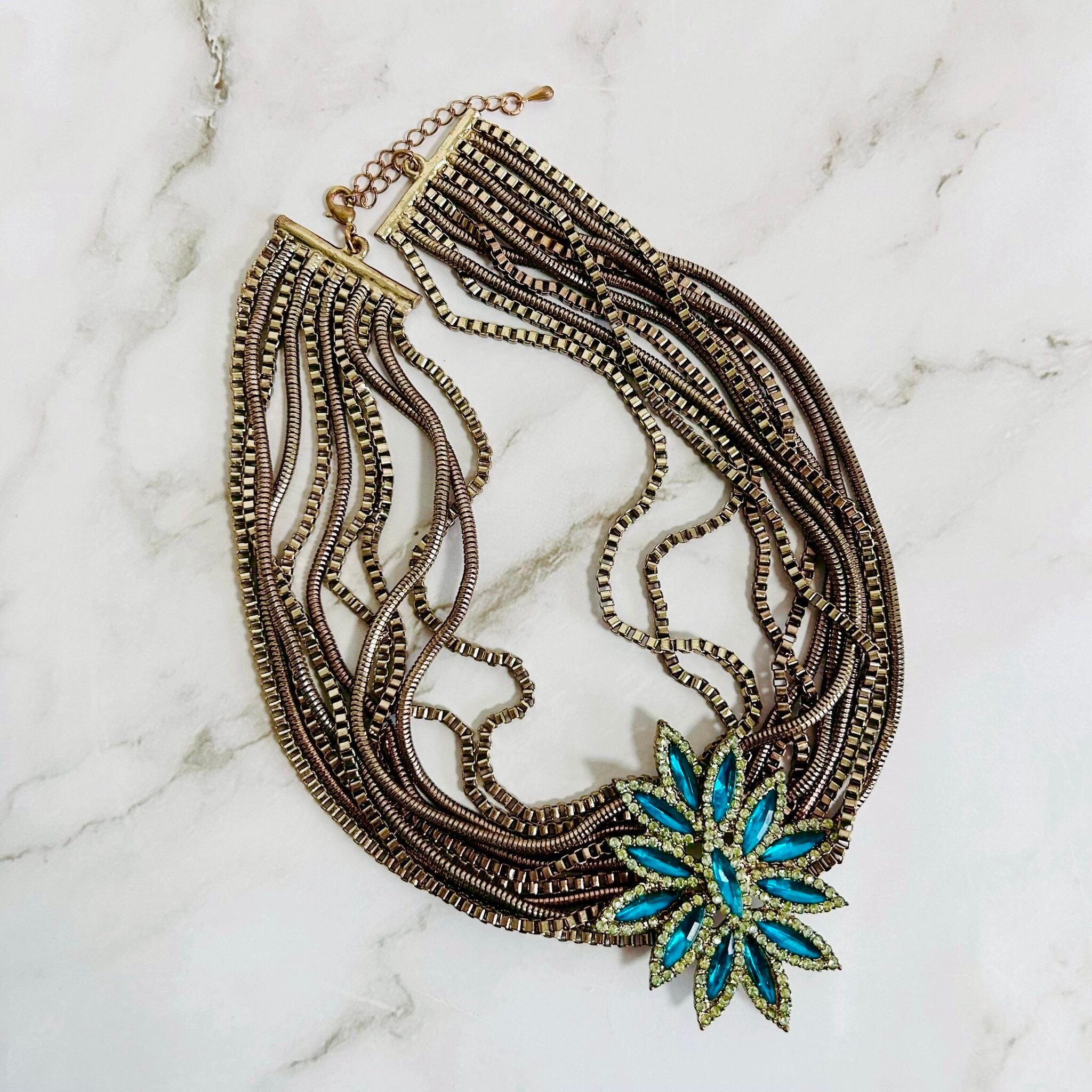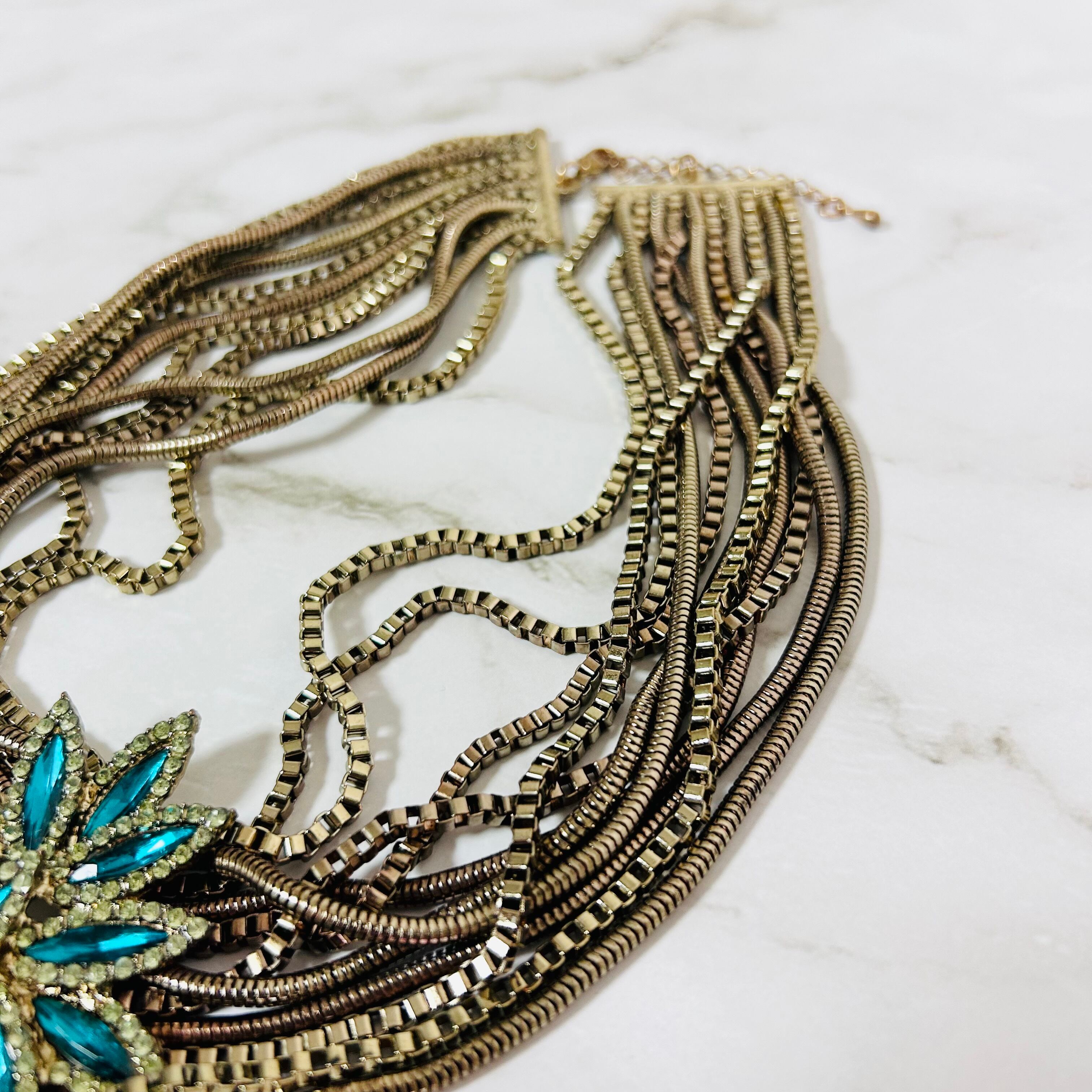 アンティーク調のメタルチェーンを幾重にも重ね、胸元に豊かな動きを生み出したネックレスです。