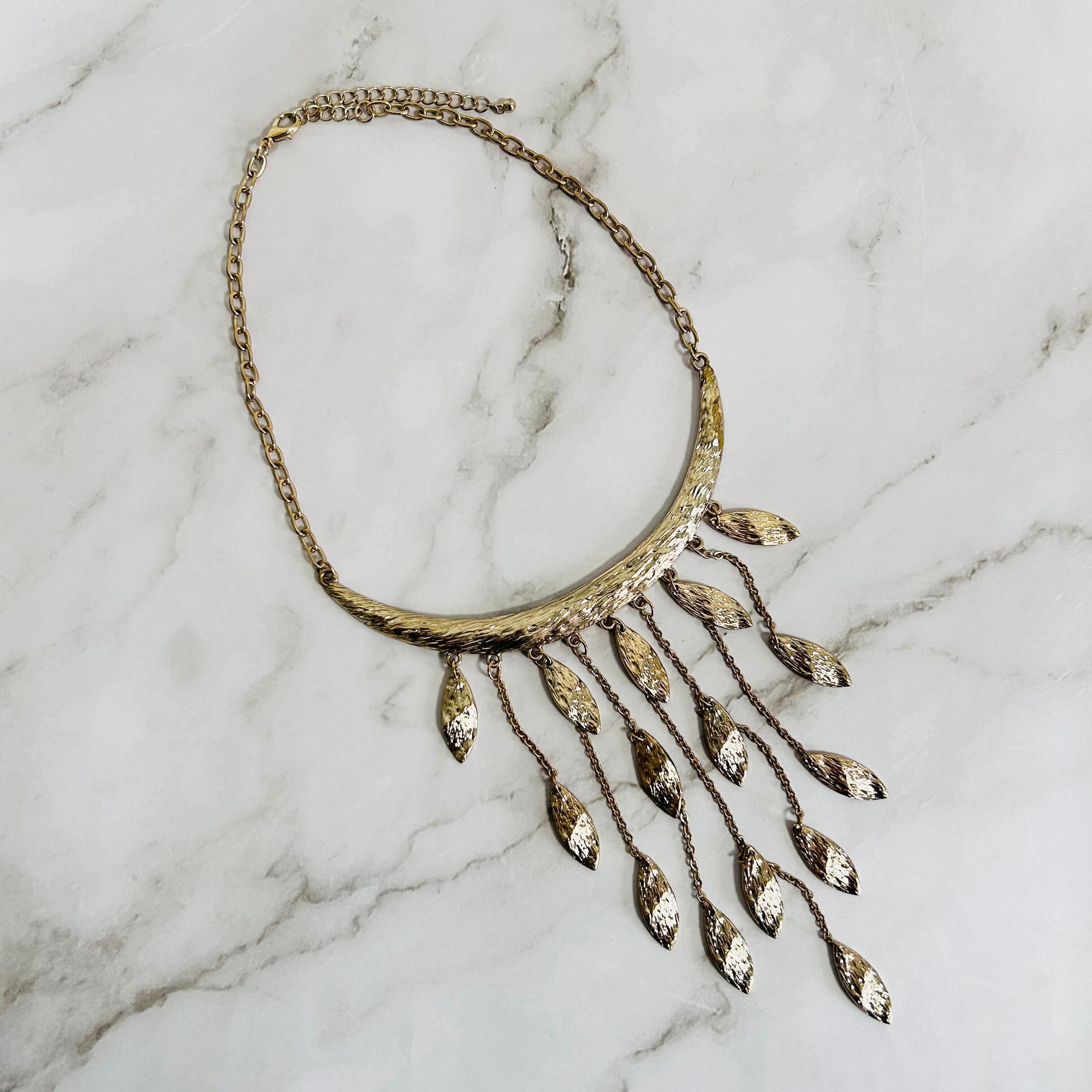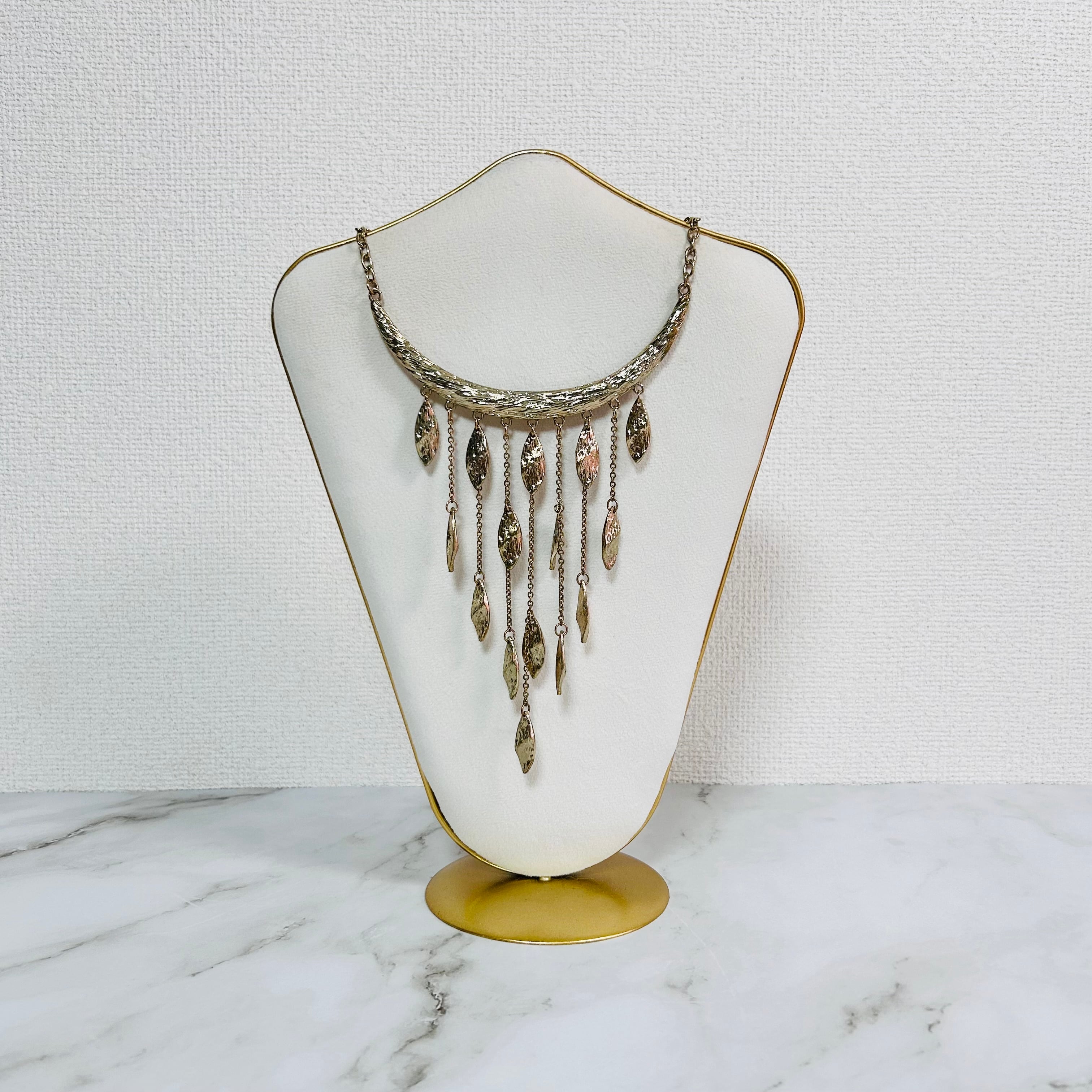 艶やかなゴールドトーンのメタルをベースに、リーフモチーフを連ねた印象的なフリンジネックレスです。