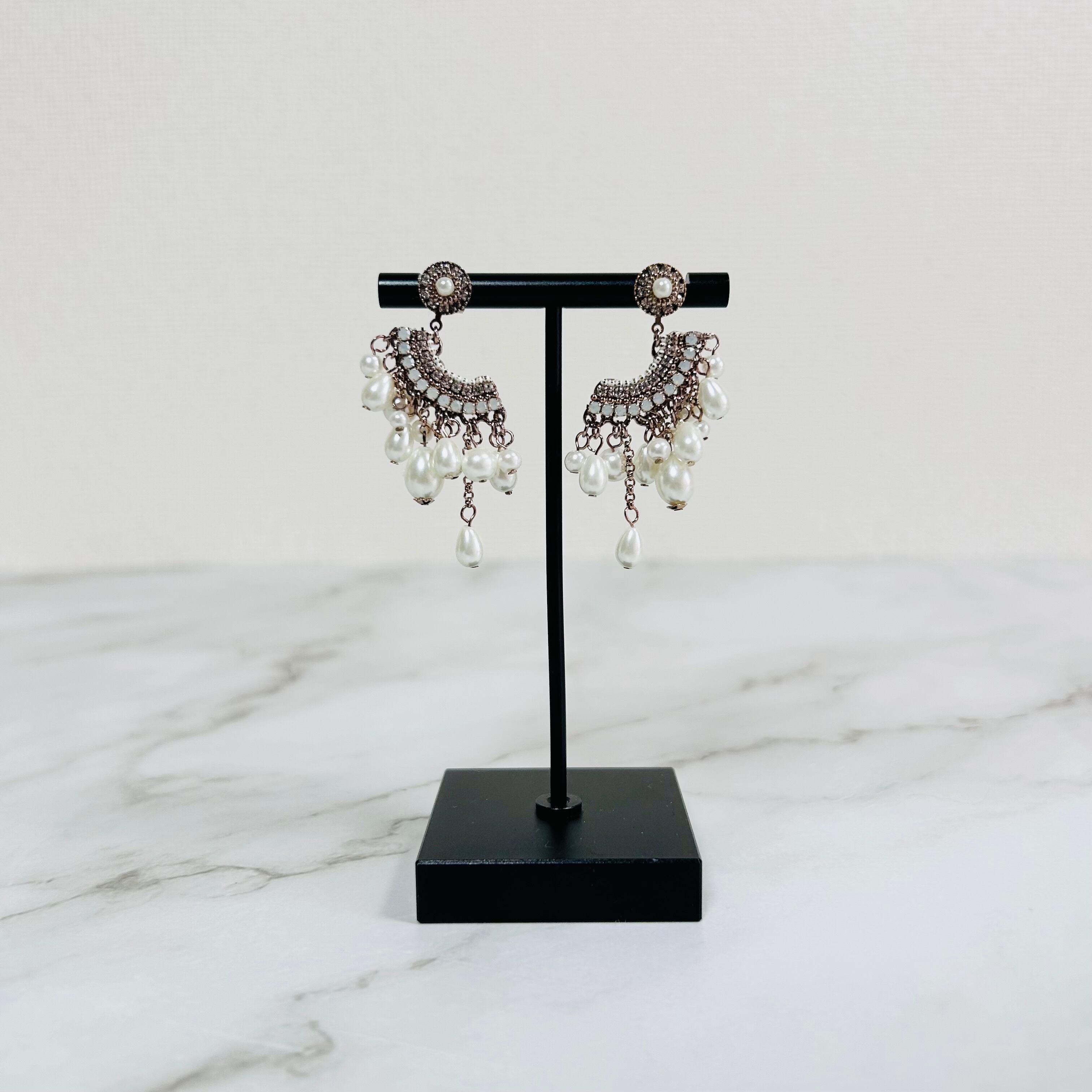 クラシカルなパールの上品さに、アンティーク調のメタルカラーが重なり、甘さを抑えた大人のバランスに。
