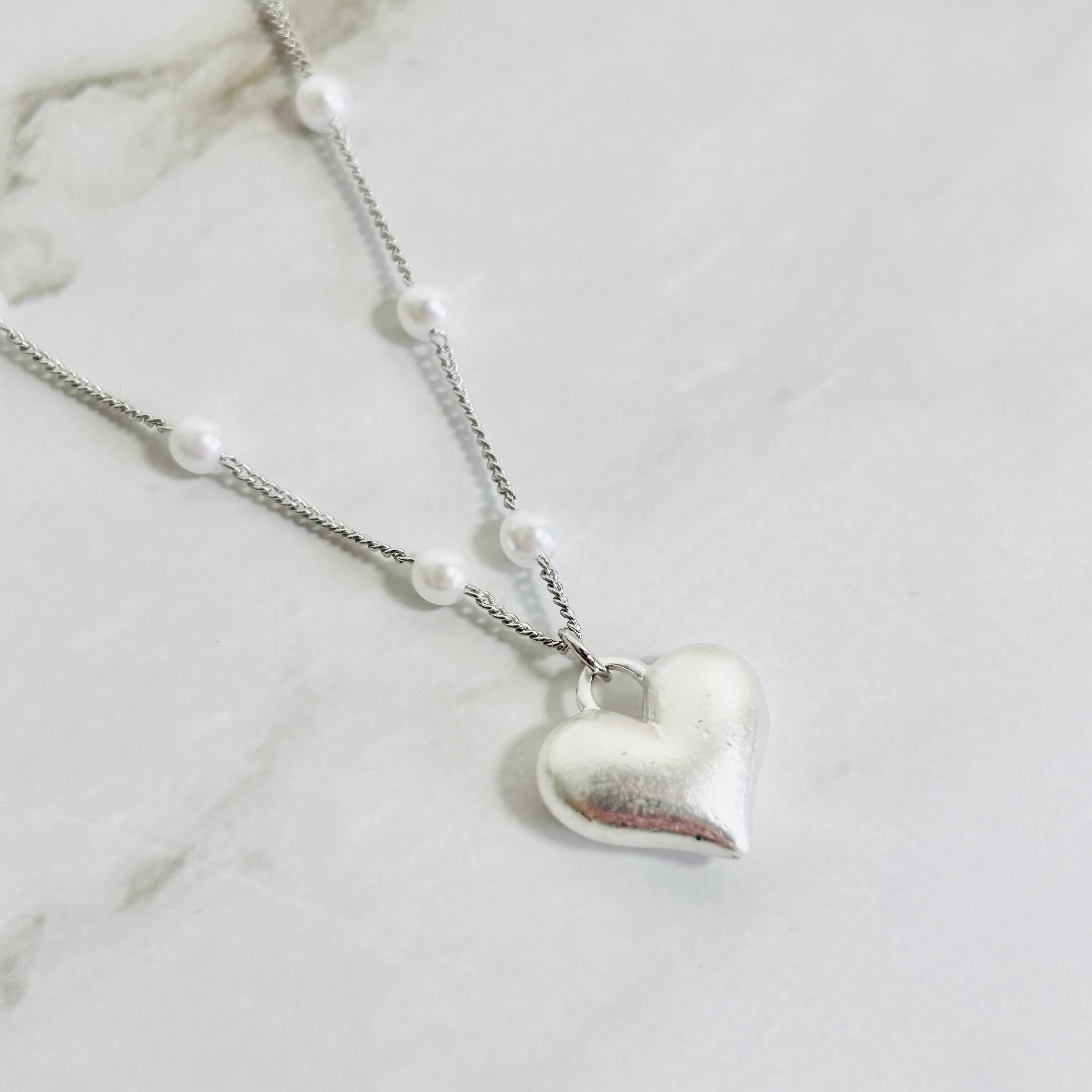 小さなパールをリズミカルにあしらったチェーンに、ぷっくりとしたハートモチーフを添えたネックレスです。