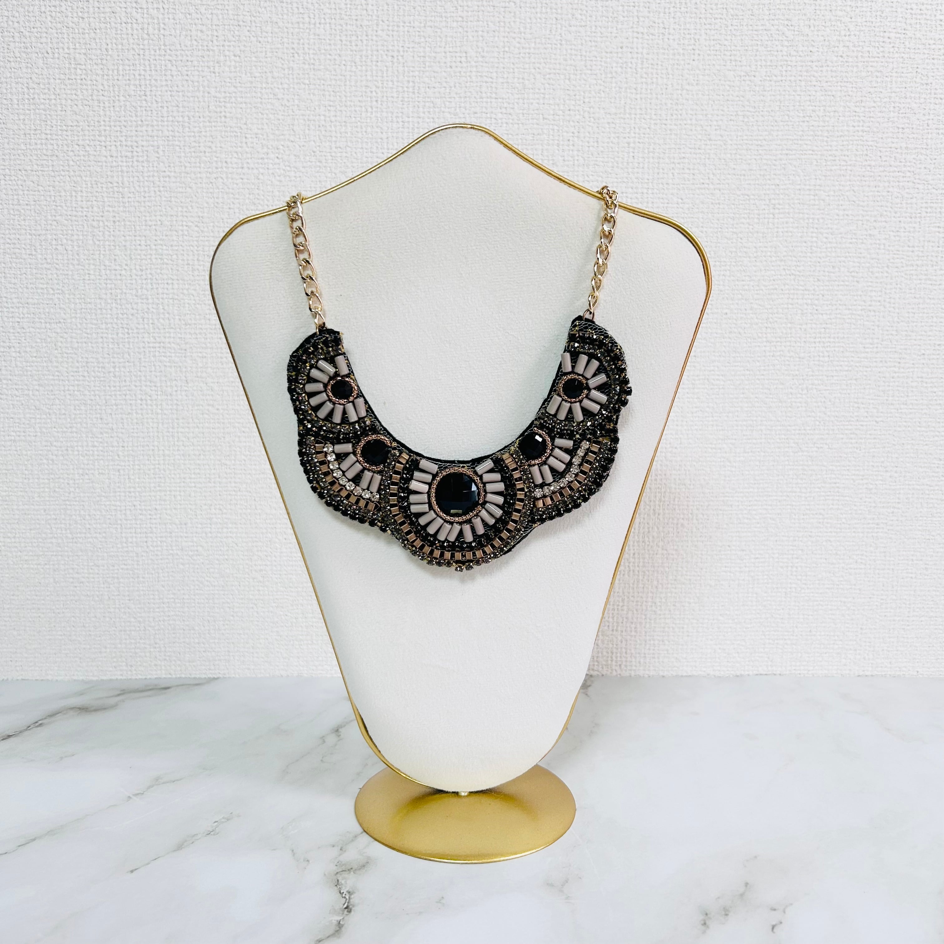 ブラックを基調にしたビジュー、繊細なビーズ、アンティークゴールドトーンのチェーンを重ね合わせたモチーフの存在感あるネックレスです。