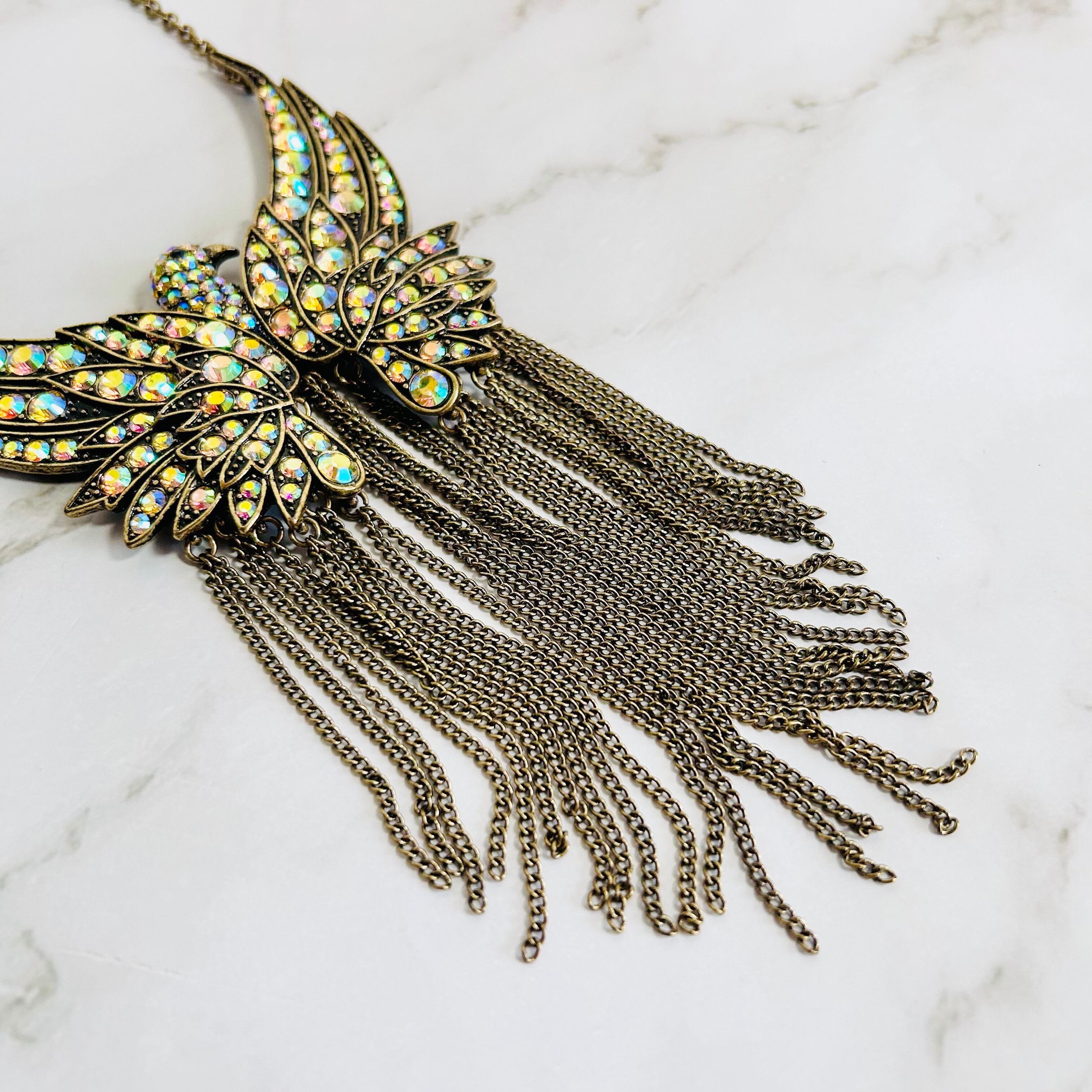 鳥をモチーフにした立体的なメタルパーツに、オーロラ調のイエロー系ビジューと繊細なチェーンフリンジを組み合わせた、存在感のあるネックレスです。