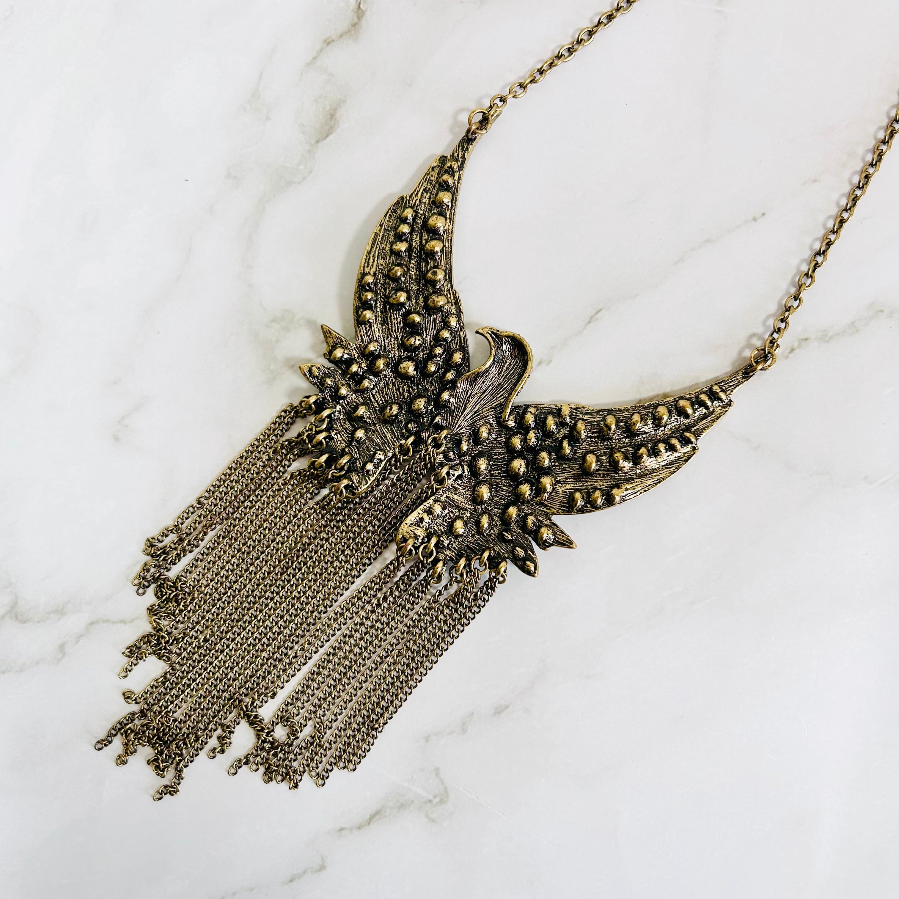 翼を大きく広げたような鳥のシルエットは、首元にゴージャスな動きと華やかさを添え、シンプルな装いでも一気に印象的なスタイルに仕上げてくれます。