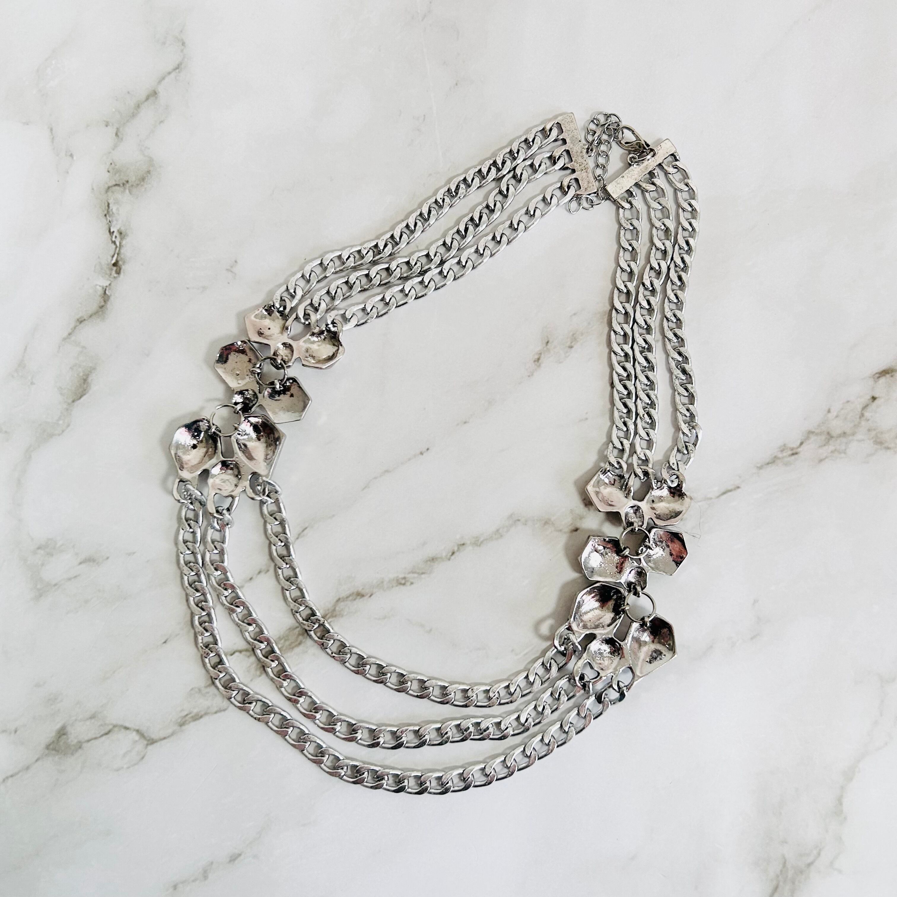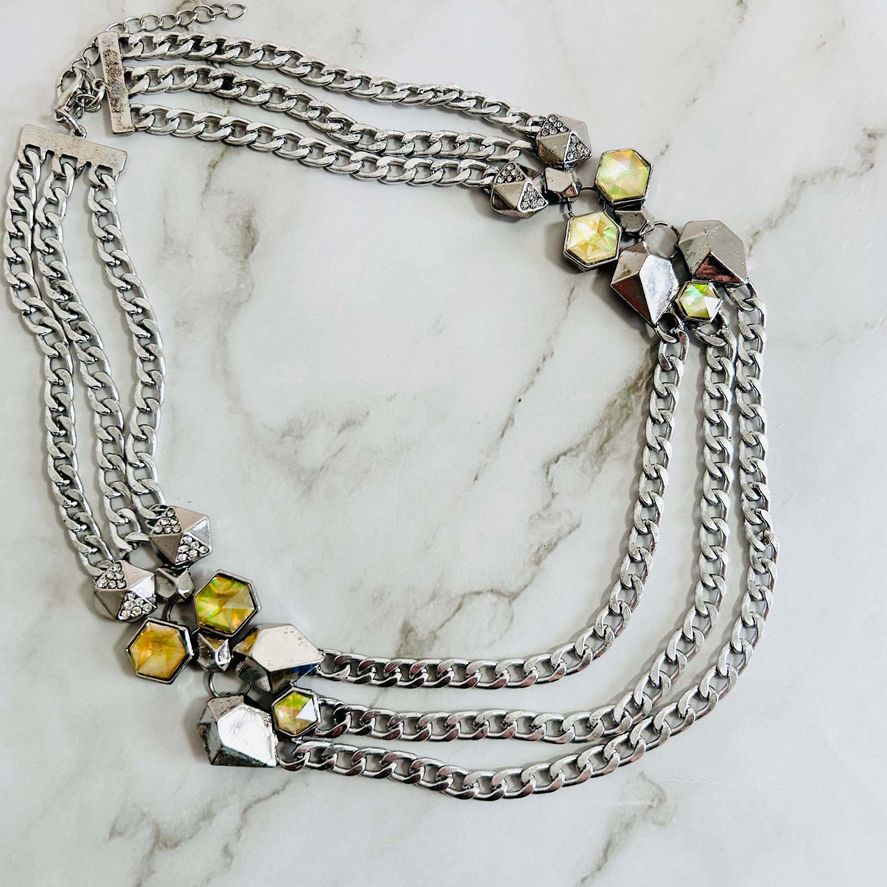 重厚感のあるシルバーカラーのチャンキーチェーンを重ね、美しいカットなカットのメタルパーツと、光を受けて表情を変えるイエロートーンのビジューをリズミカルに配したネックレスです。