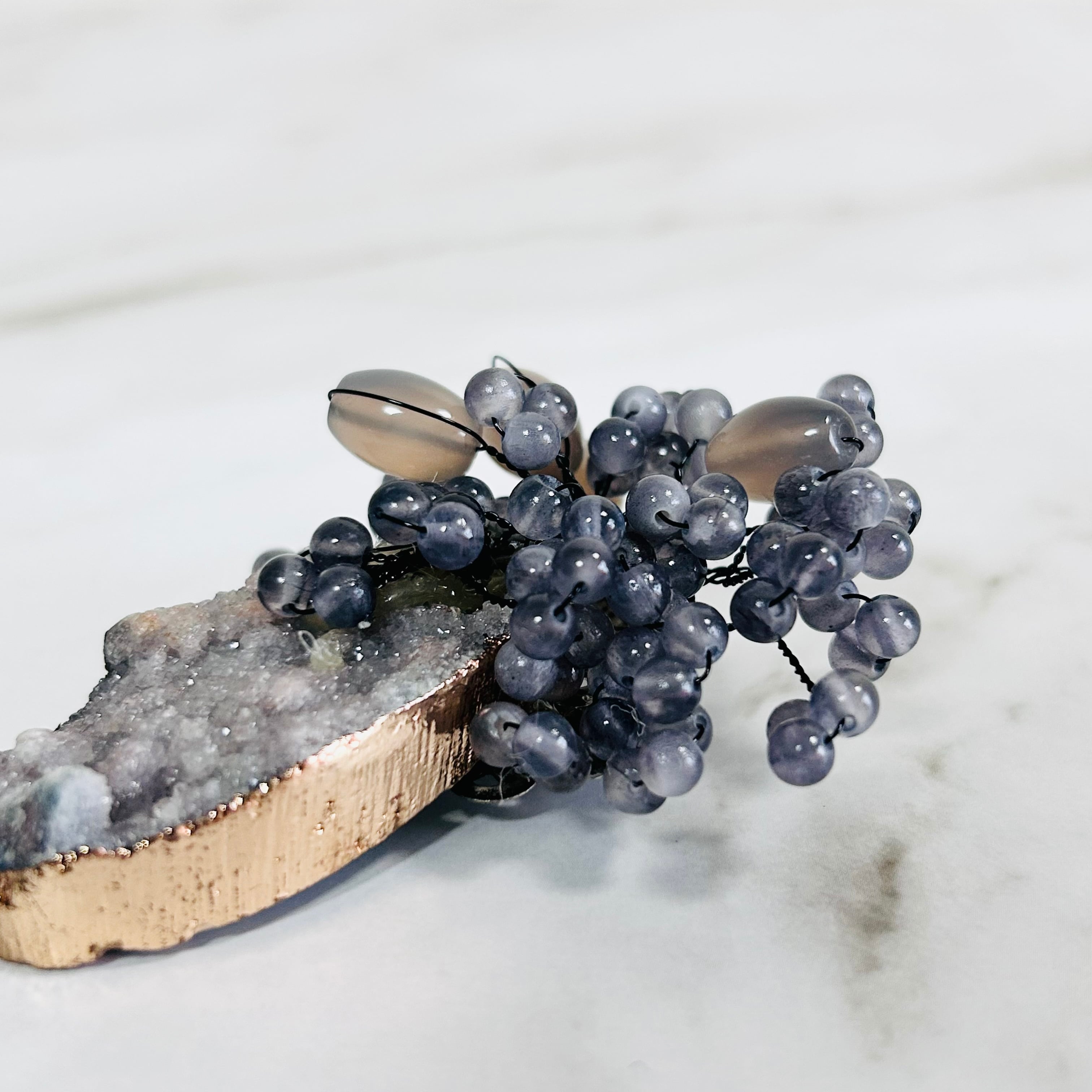 自然が生み出した表情豊かなストーンを主役に、透明感のあるグレイッシュトーンのストーンビーズを花束のようにあしらい、奥行きのある立体感に仕上げています。