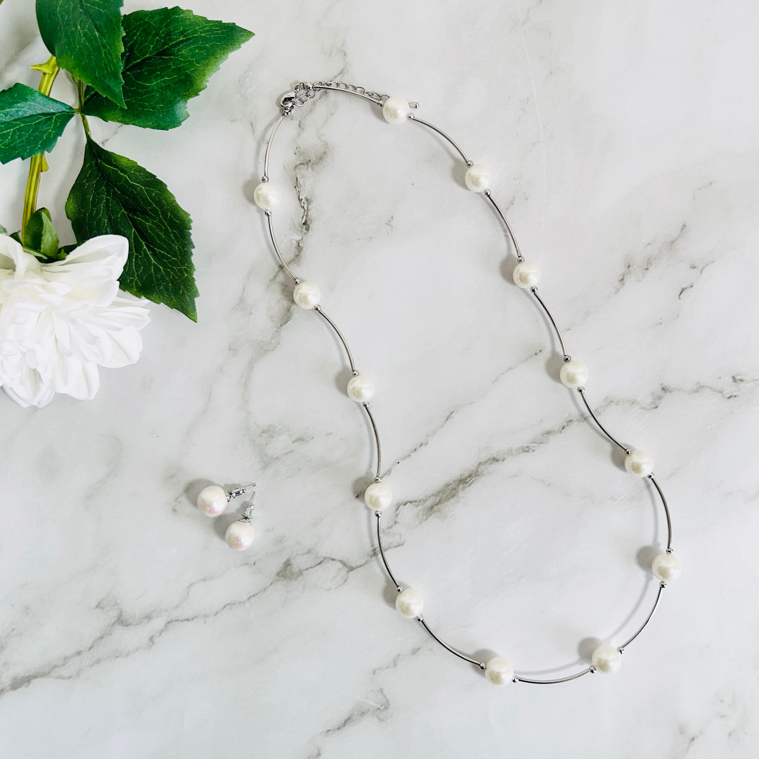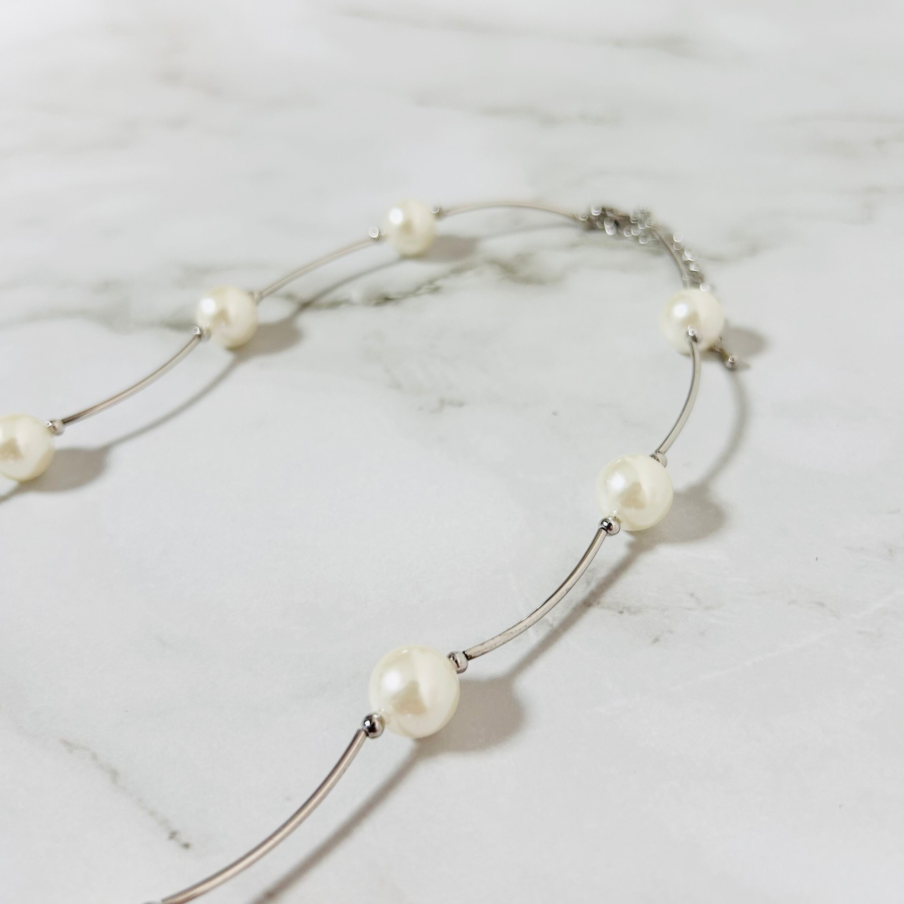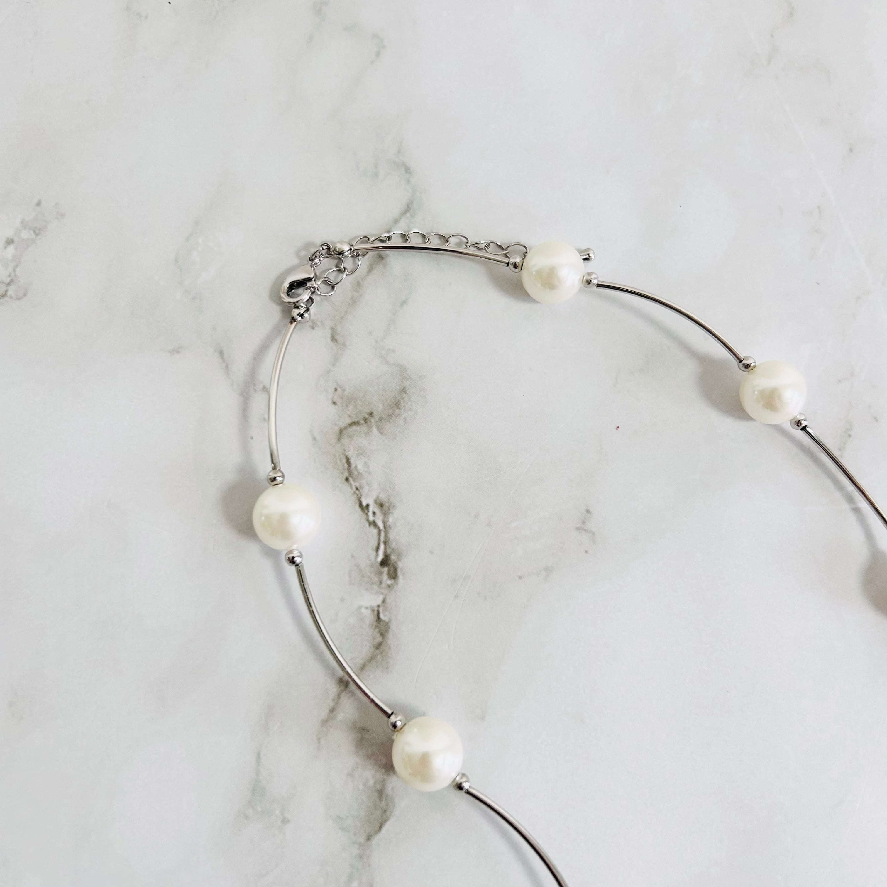 一粒ずつ表情のあるパールのやさしい光沢と、メタルの凛とした輝きがほどよいコントラストを生み、軽やかで洗練された印象に仕上がっています。