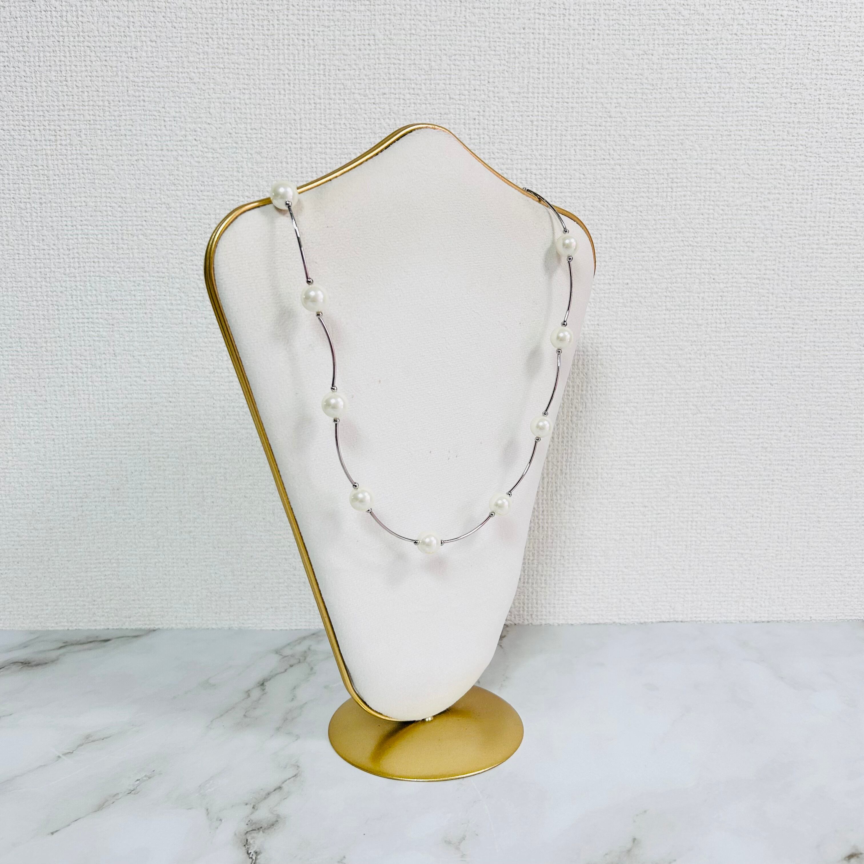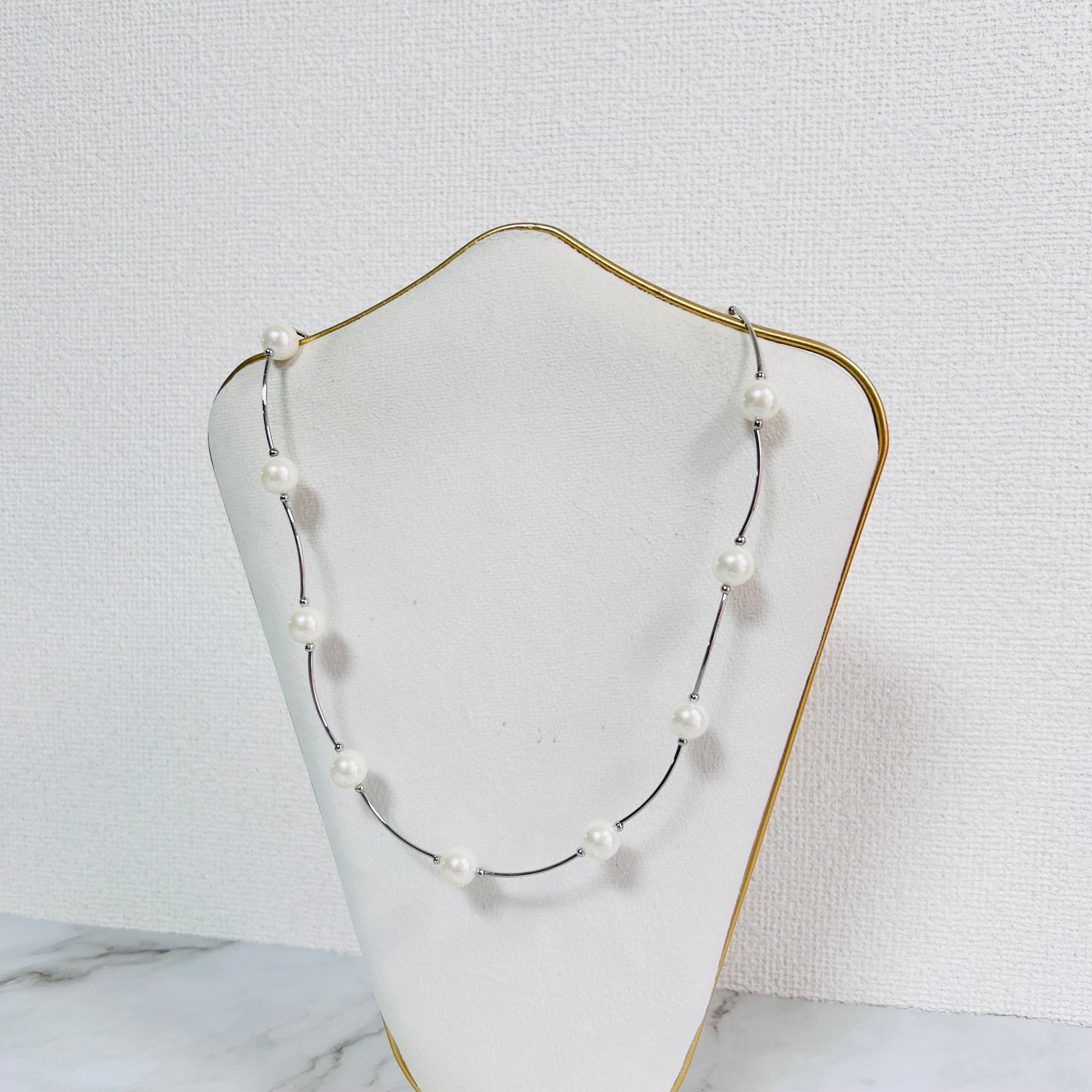 艶やかなファッションパールと、しなやかな曲線を描くシルバーカラーのメタルパーツをリズミカルに繋いだロングネックレスです。
