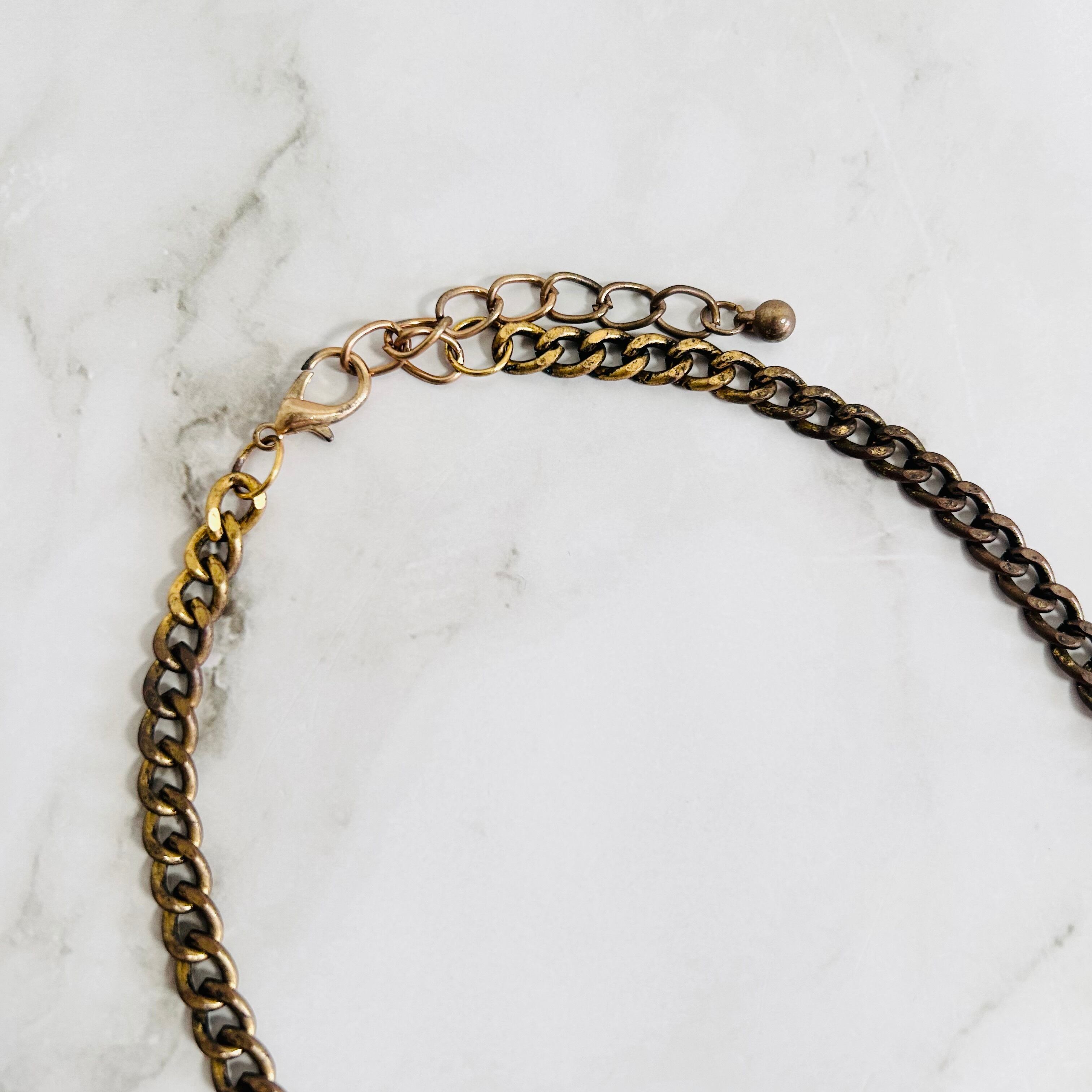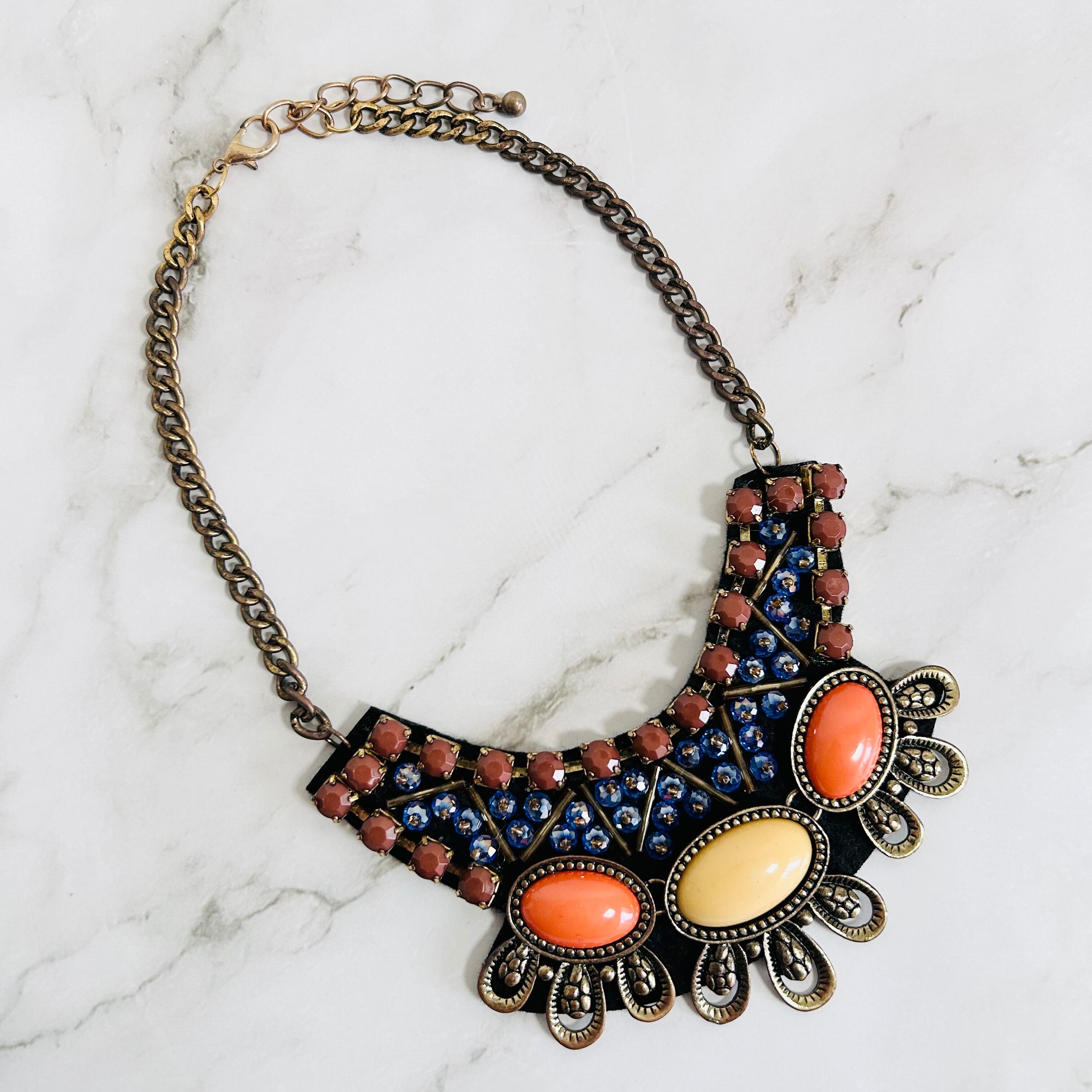 深みのあるブルーとブラウンのビジューをベースに、オレンジとイエロートーンのカボションパーツをアクセントとして配した、存在感あふれるモチーフネックレスです。