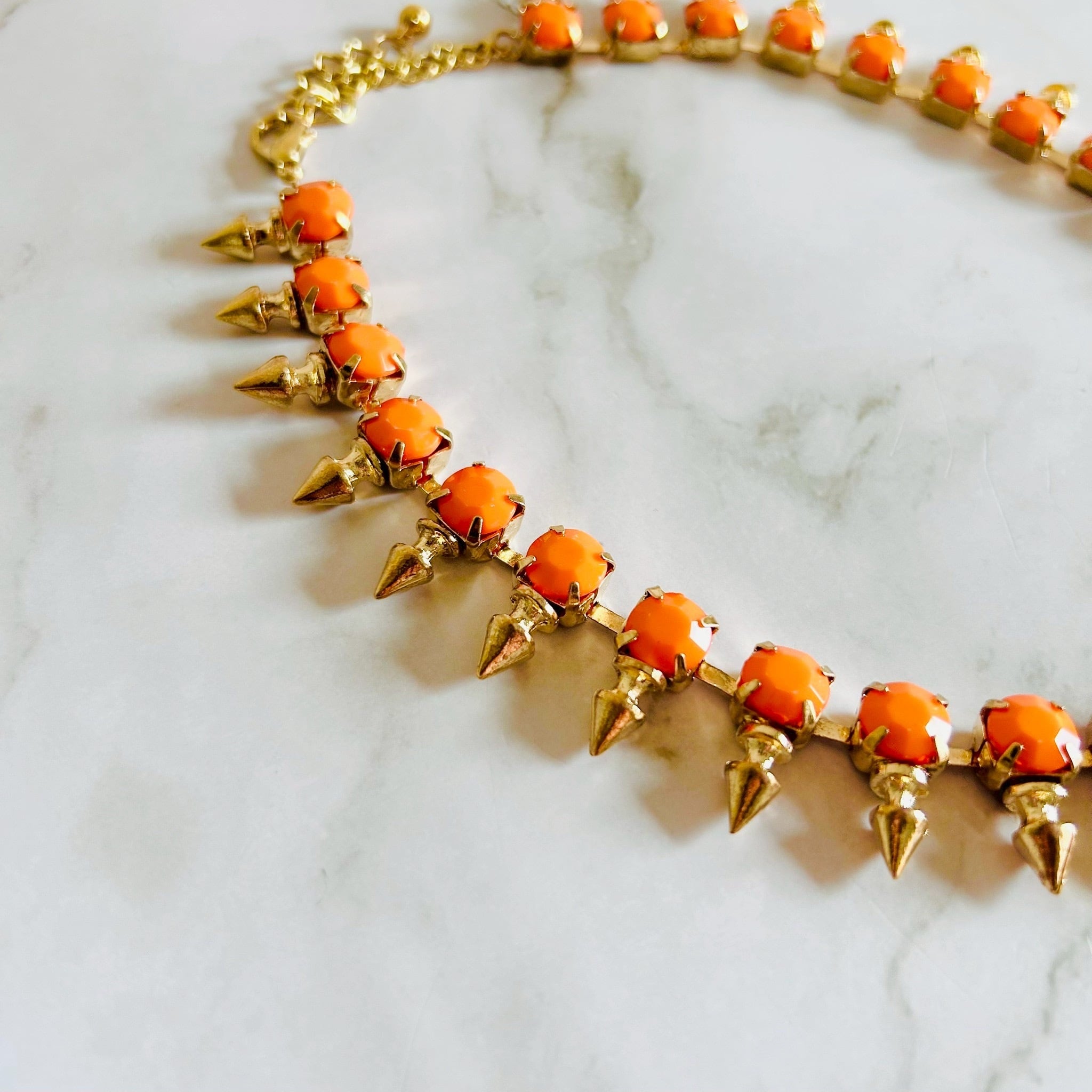 鮮やかなオレンジカラーが印象的なパーツを連ね、ゴールドトーンのスパイクモチーフをアクセントに効かせたモード感のあるネックレスです。