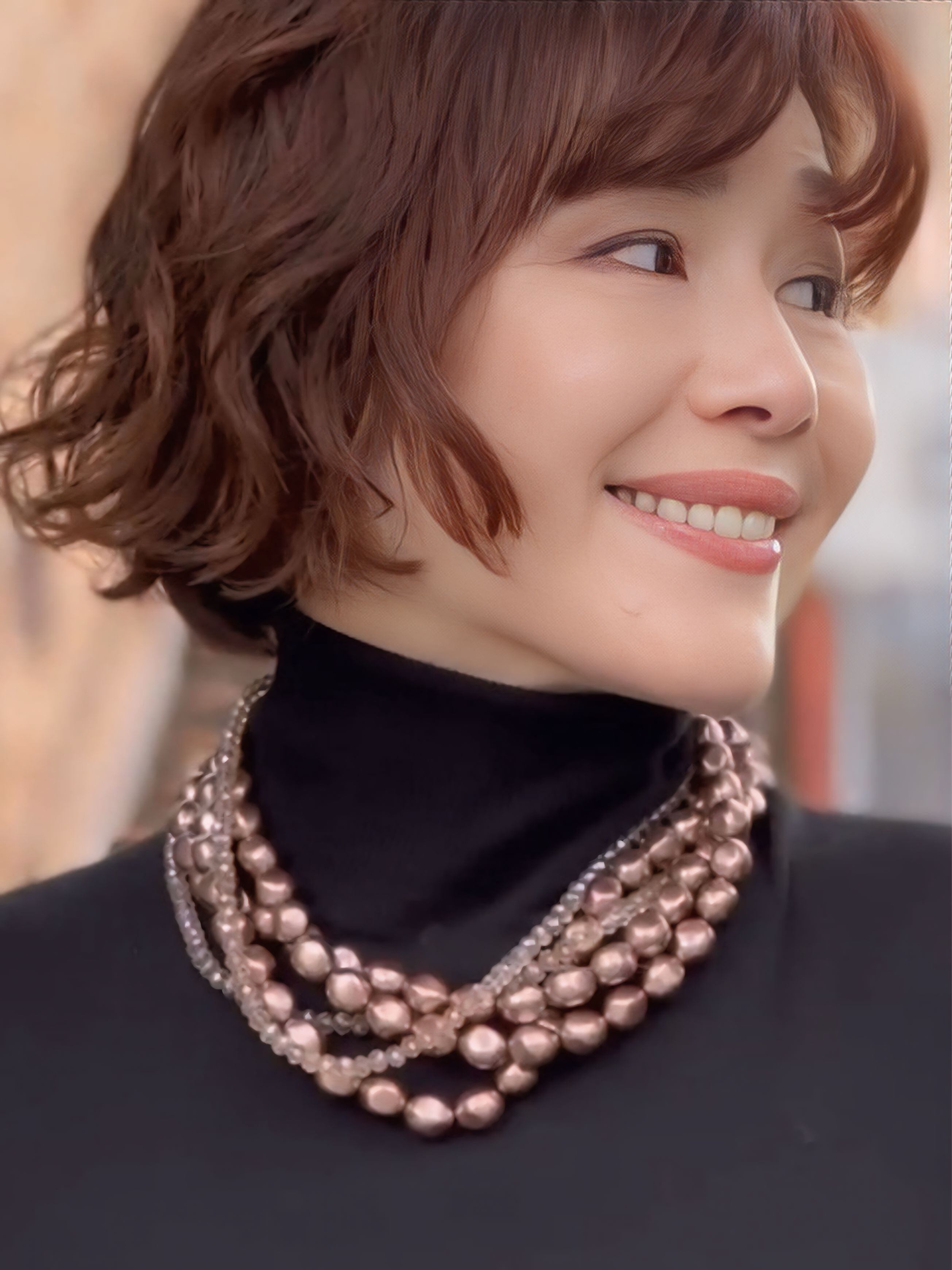 艶やかなブロンズパールと、繊細なカットが施されたクリスタルビーズを組み合わせることで、落ち着きの中にさりげない華やかさを感じさせます。