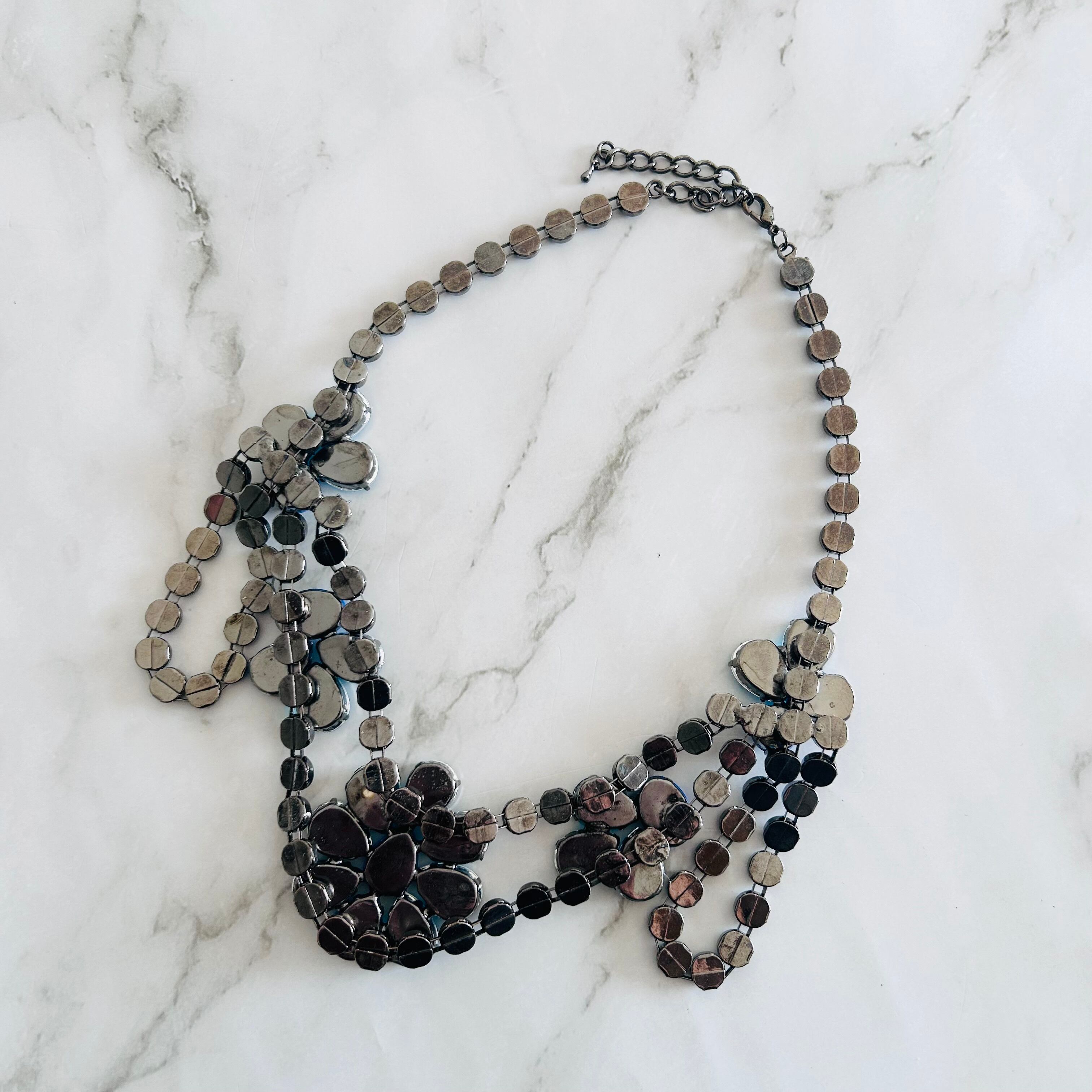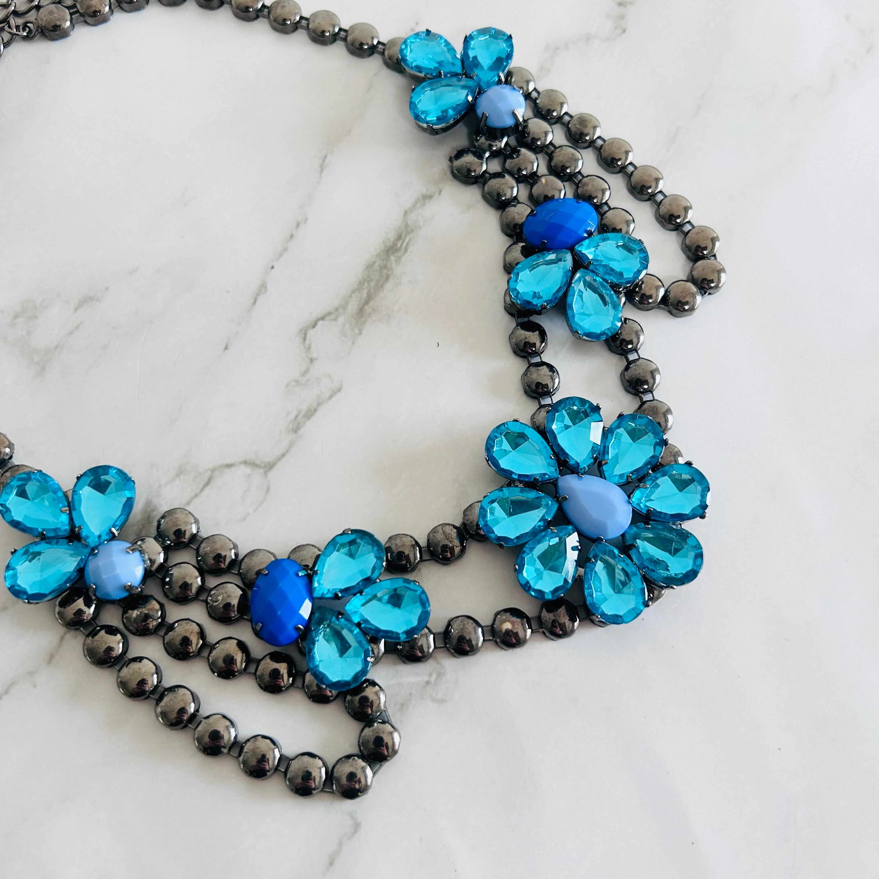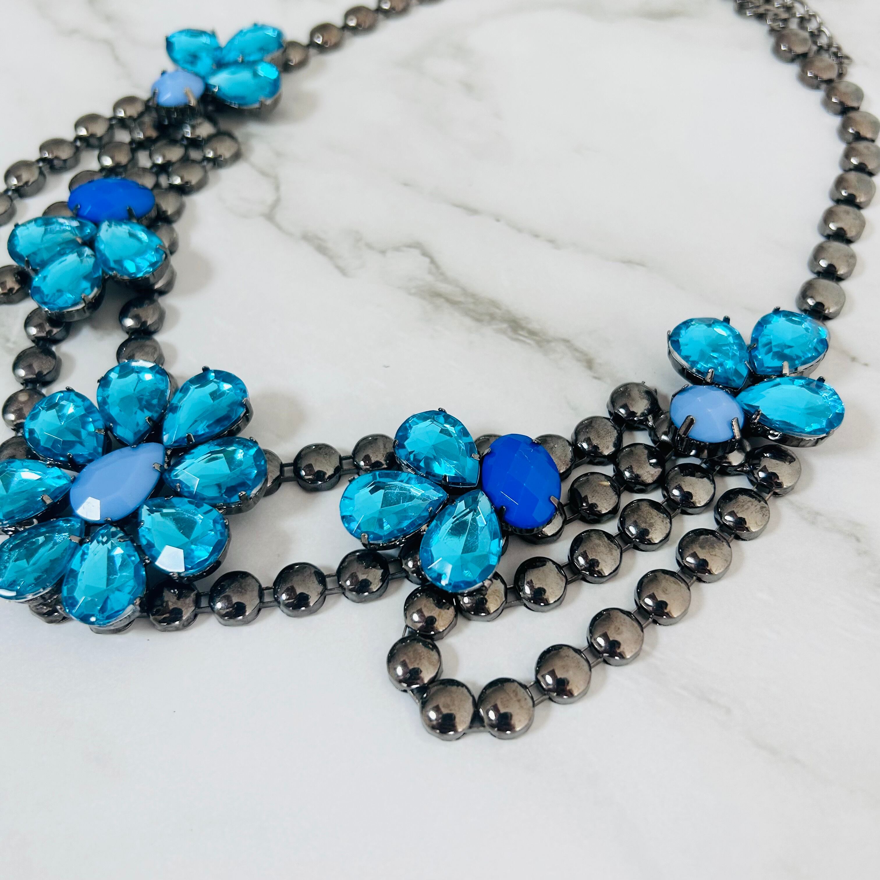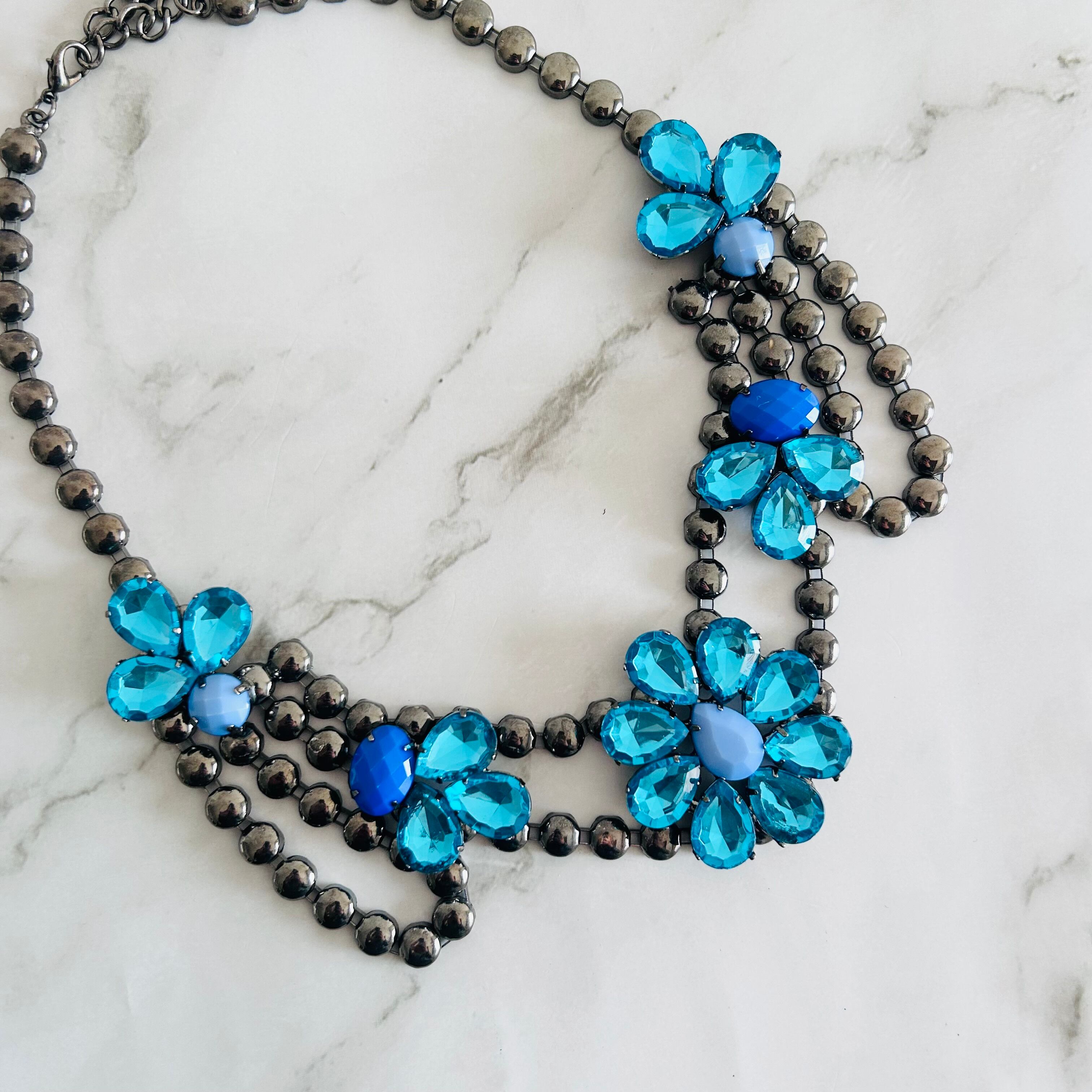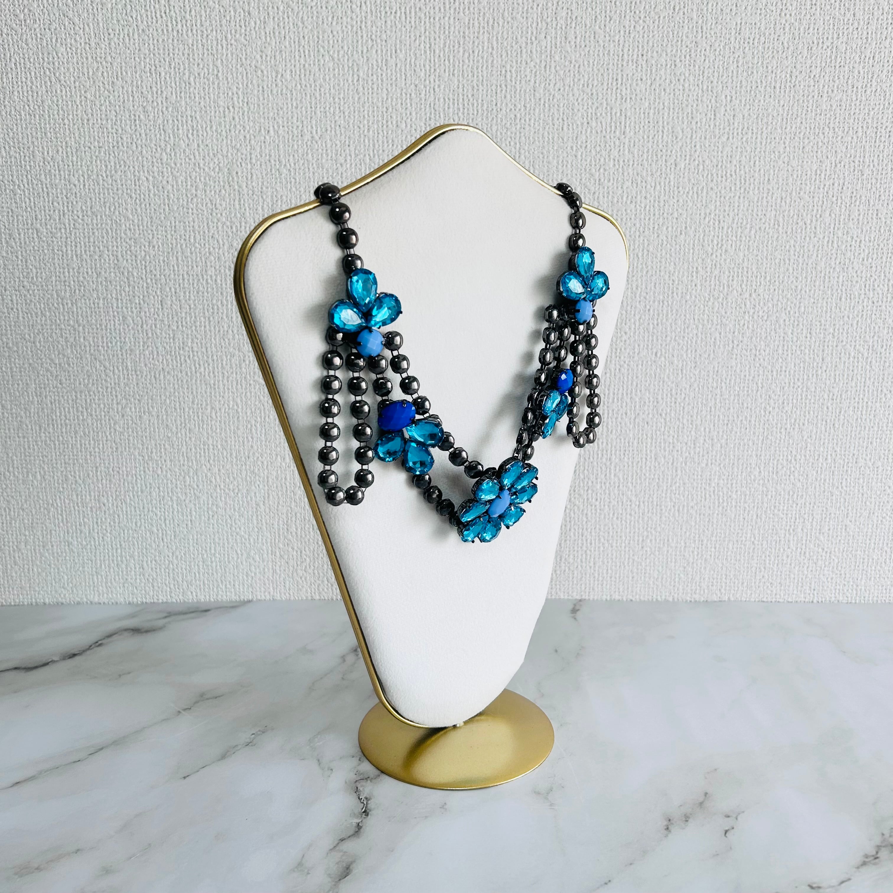 鮮やかなブルーのビジューをフラワーモチーフに仕立て、ガンメタルカラーのボールチェーンと組み合わせた、印象的なネックレスです。