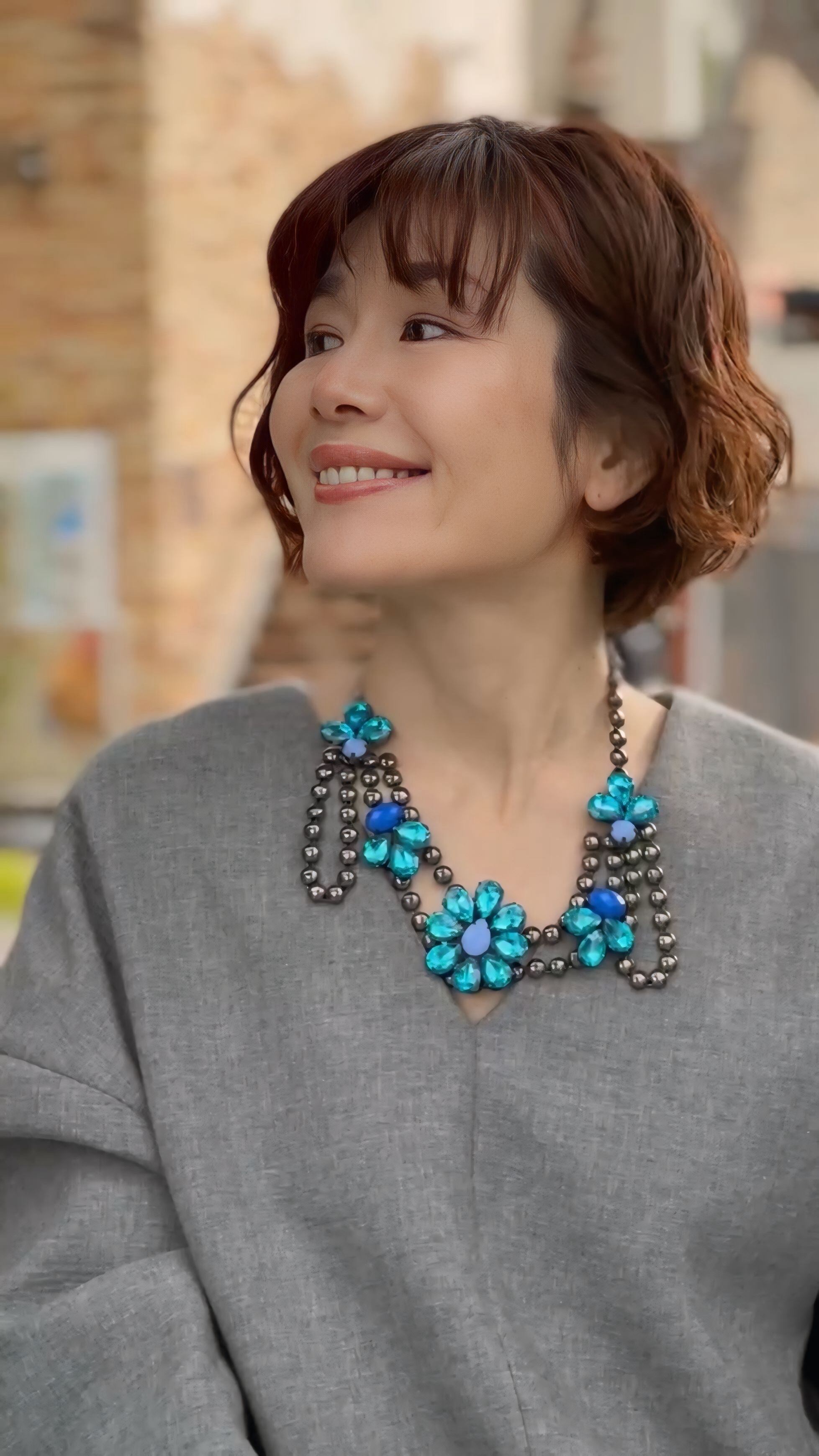 視線を惹きつけながらも品よくまとまる、大人のためのフラワーネックレスです。
