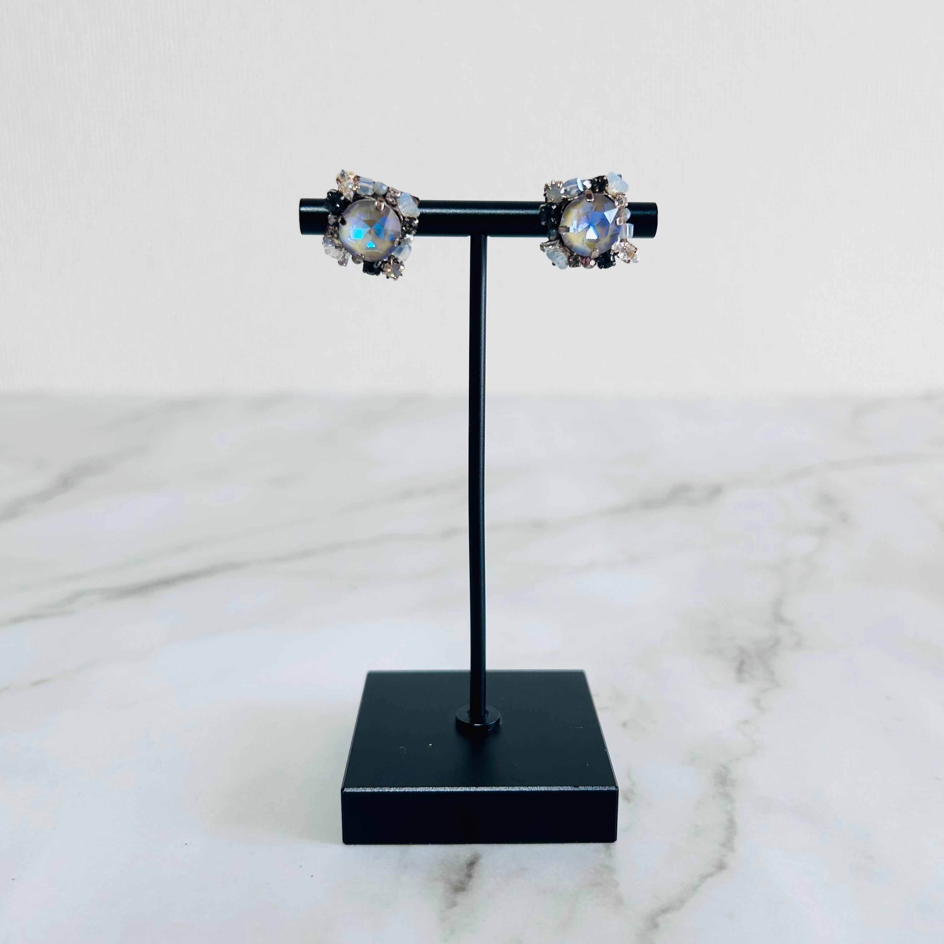 ブルーグレーやクリア、ダークカラーのクリスタルストーンを繊細に重ねた、美しく輝くピアス・イヤリングです。