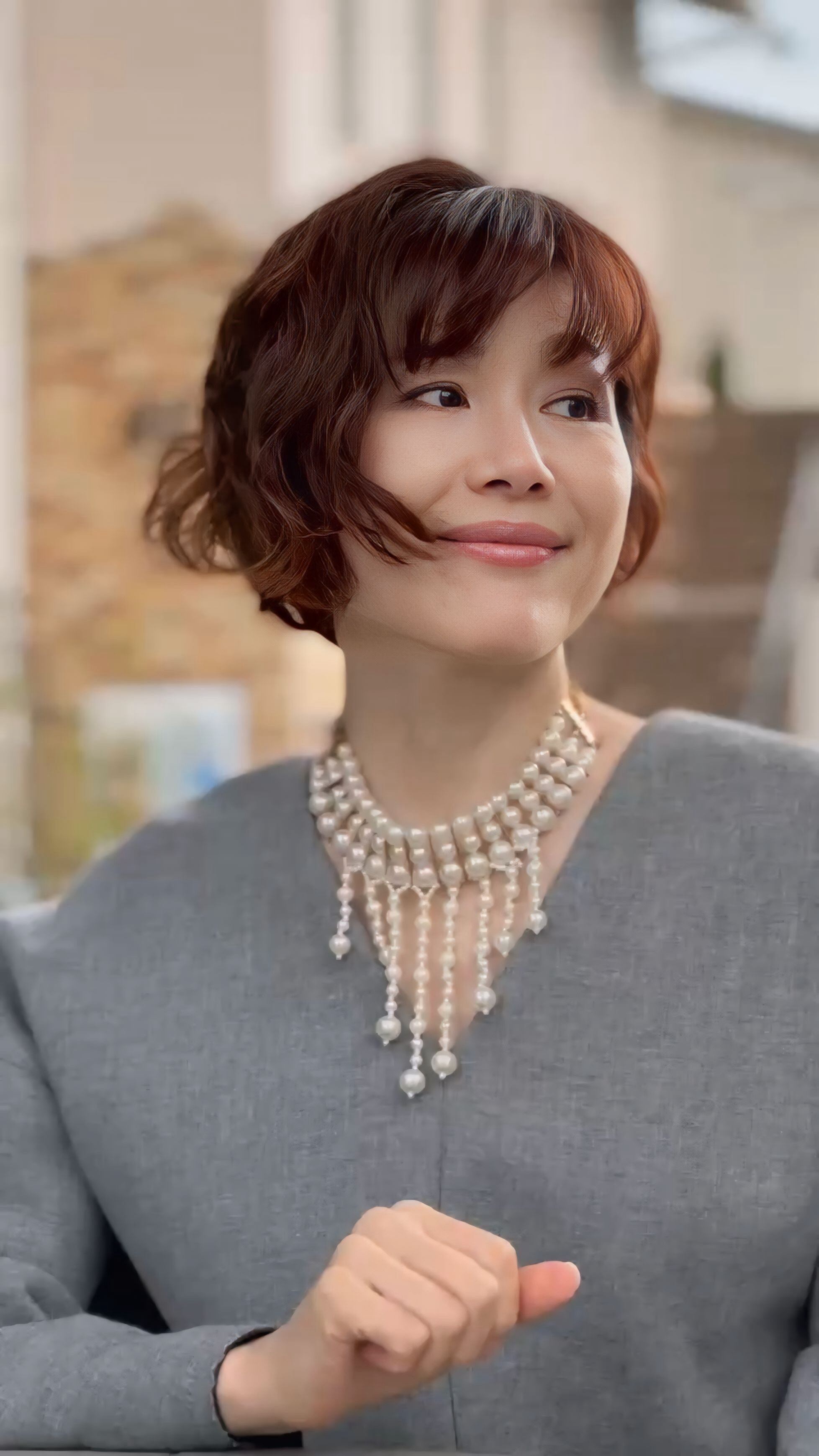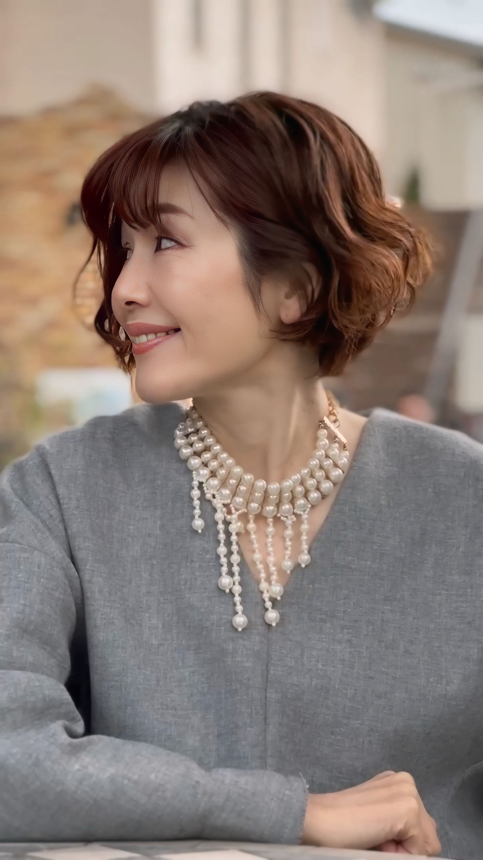 大小のパールをリズミカルに配置し、動くたびにやさしく揺れる表情が、首元に華やぎを添えます。