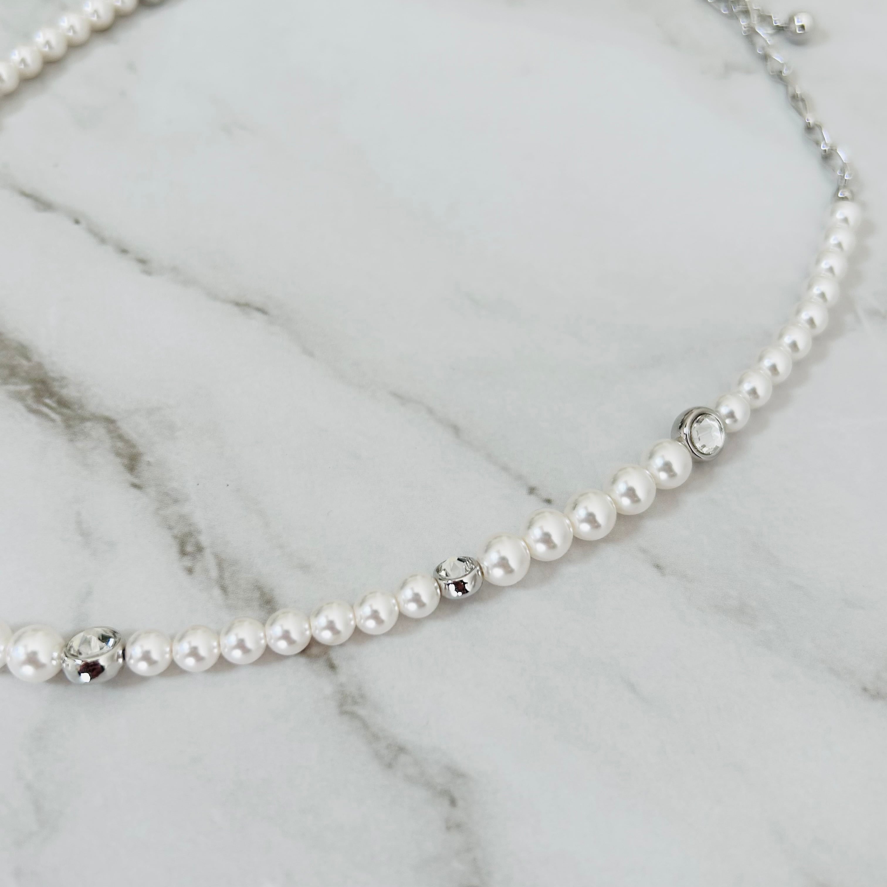 大小異なる大きさを連ねた、きめ細やかな艶をまとったパールが首元にやさしく寄り添い、