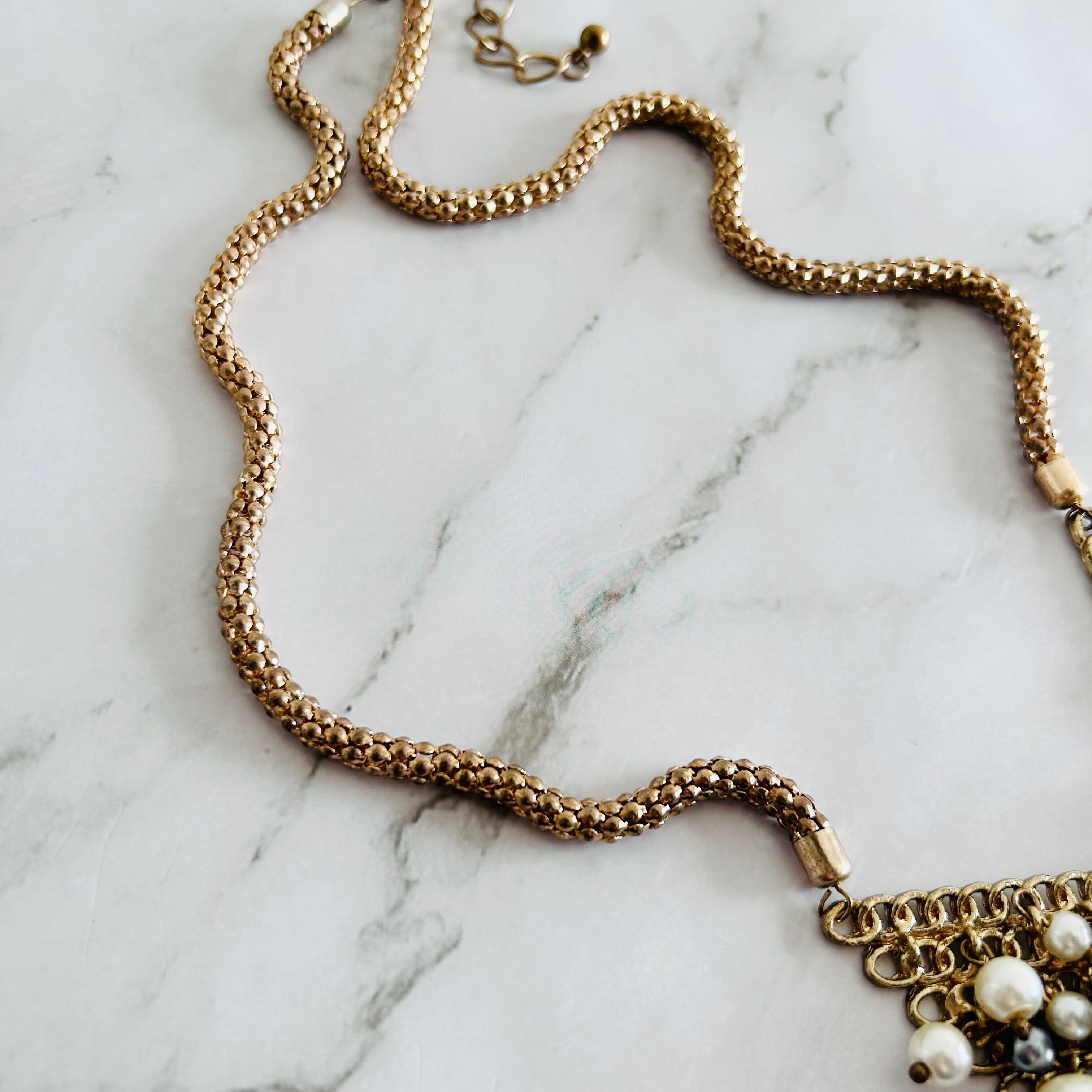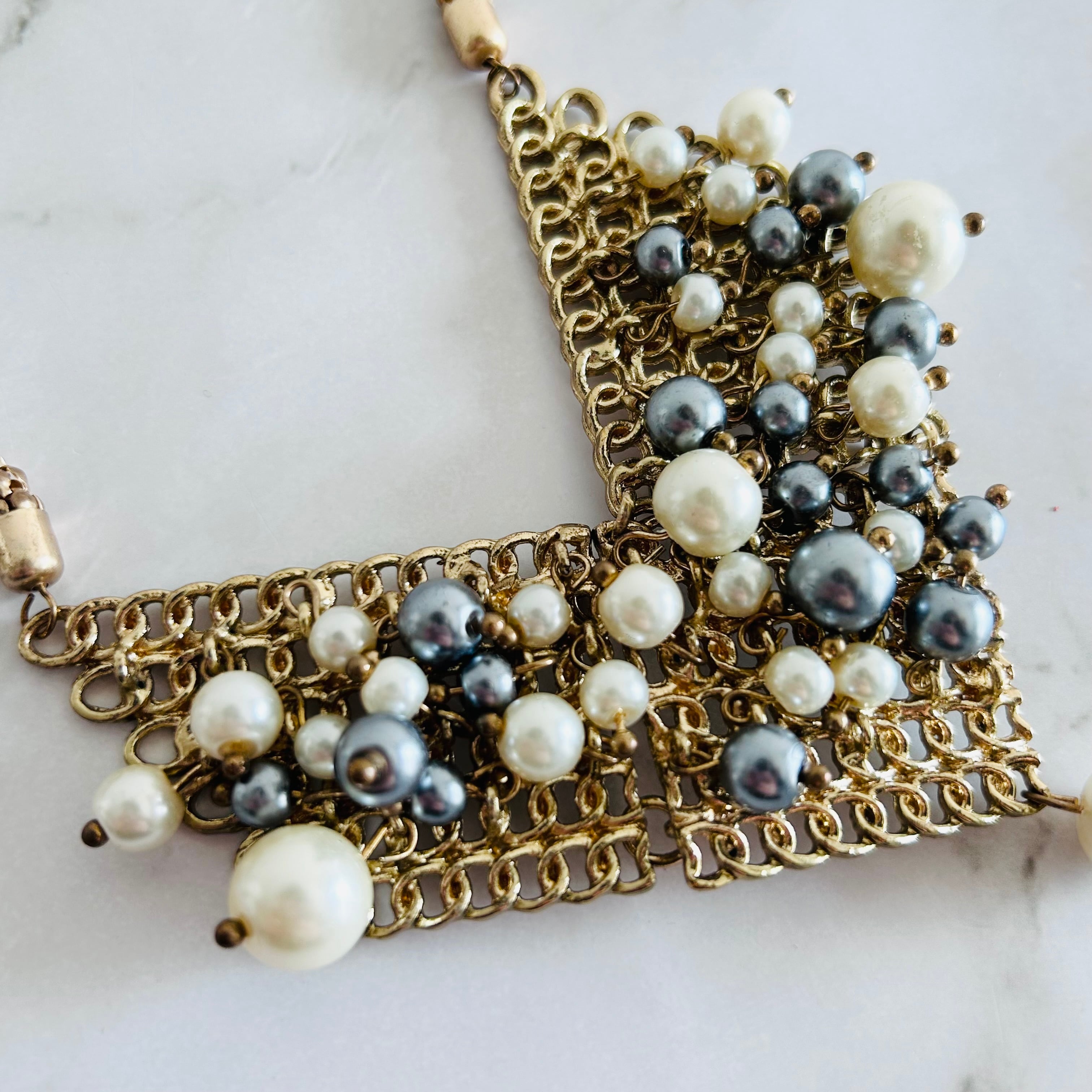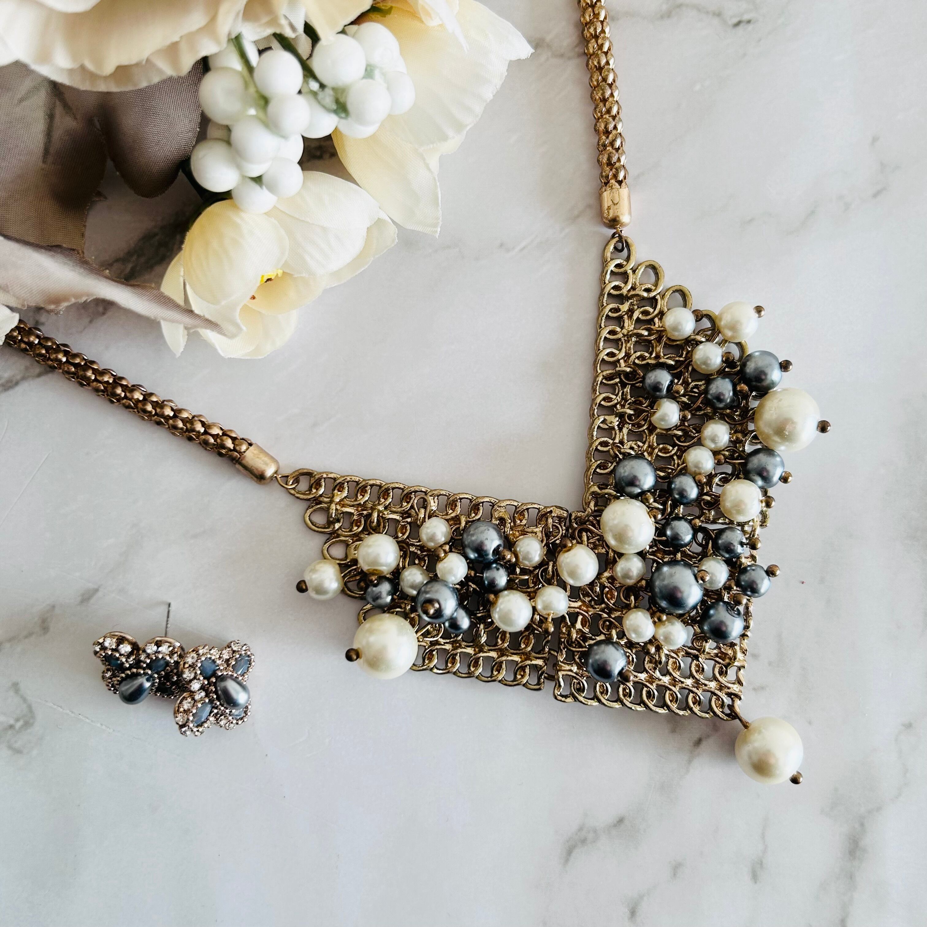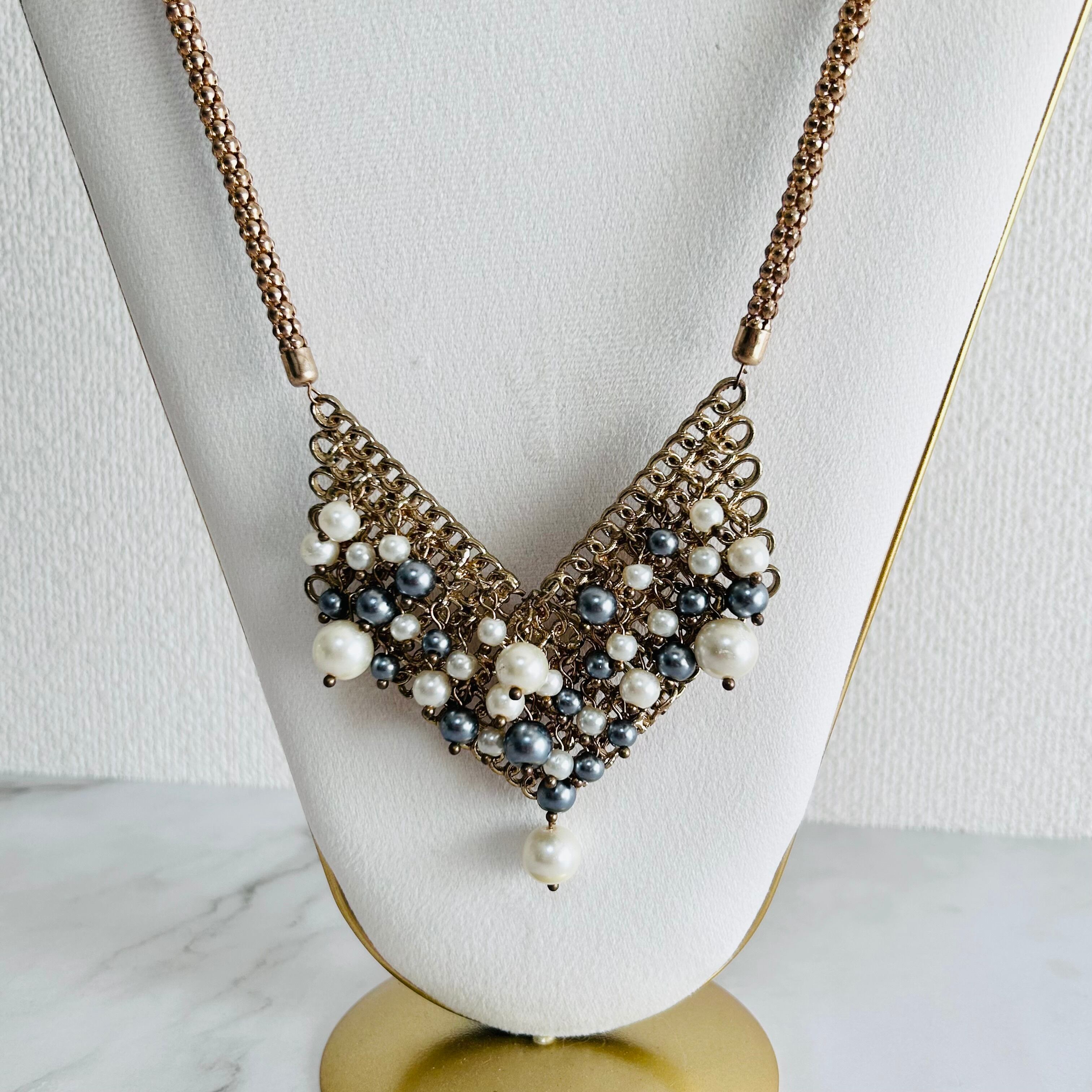しなやかに揺れるアンティークゴールドトーンのチェーンに、大小のパールとシルバーカラーのビーズを重ねた、