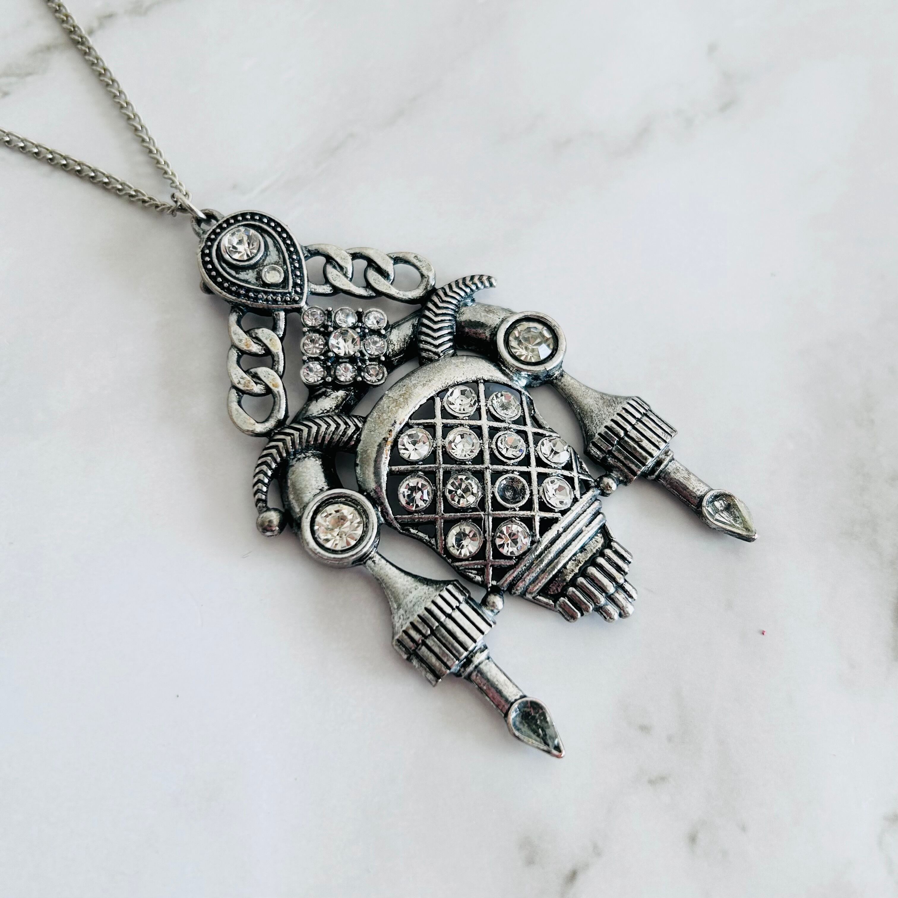 アンティークシルバートーンのメタルをベースに、クリスタルを贅沢に散りばめた、存在感のあるモチーフが特徴的なロングネックレスです。