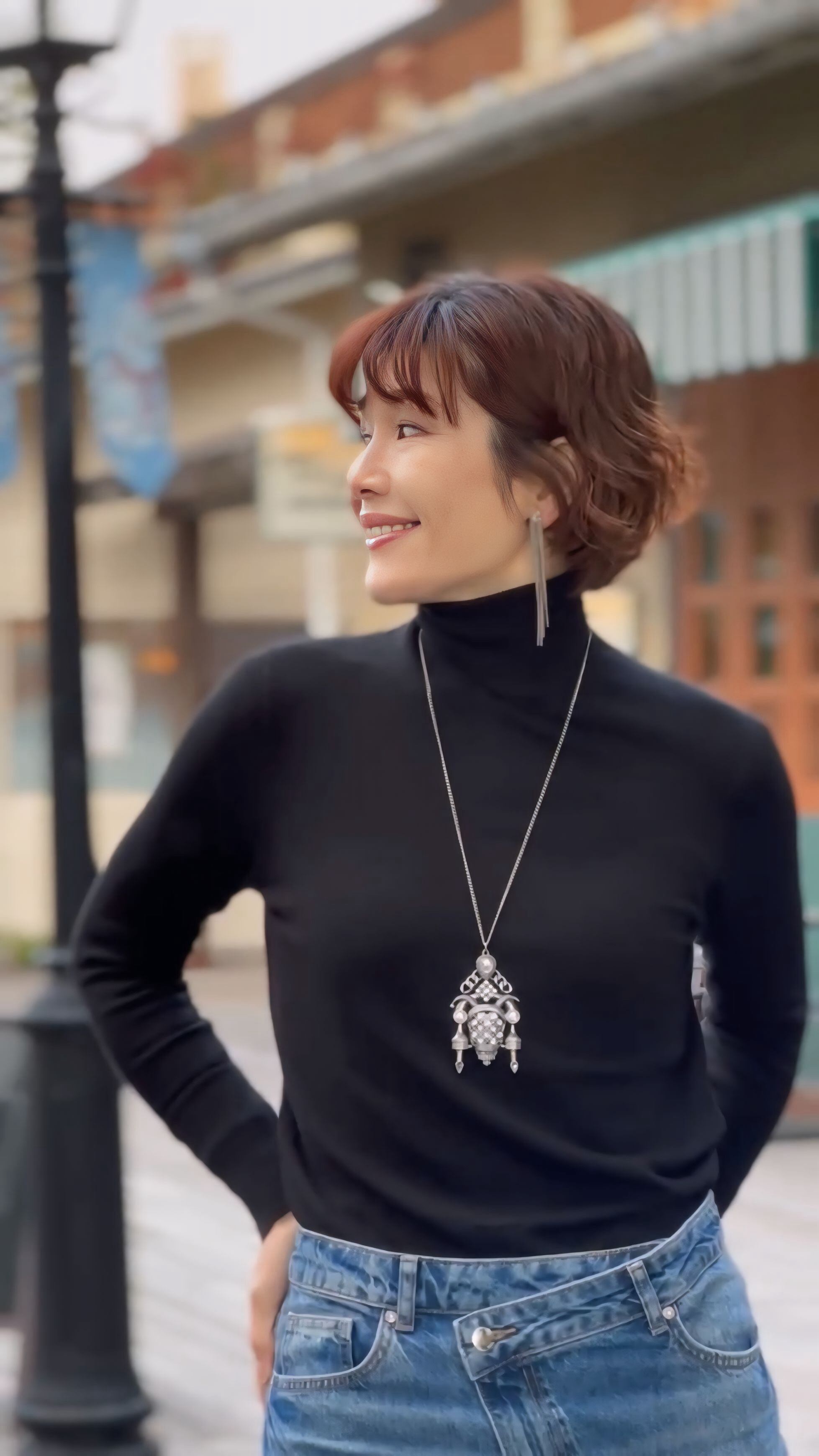 シンプルなブラックやグレーのトップスに合わせれば、ネックレスの存在感が引き立ち、洗練されたモードスタイルに!