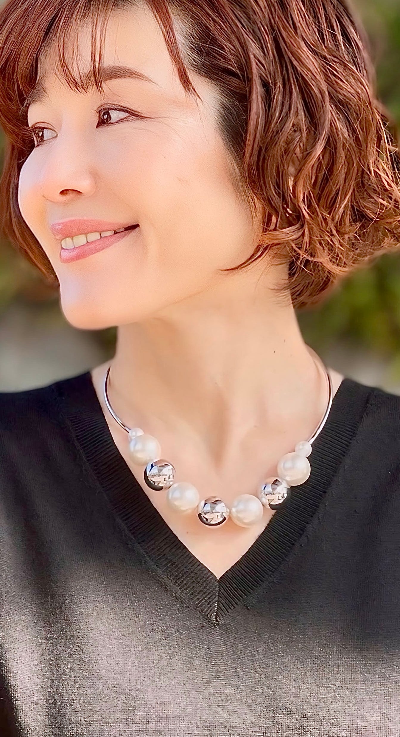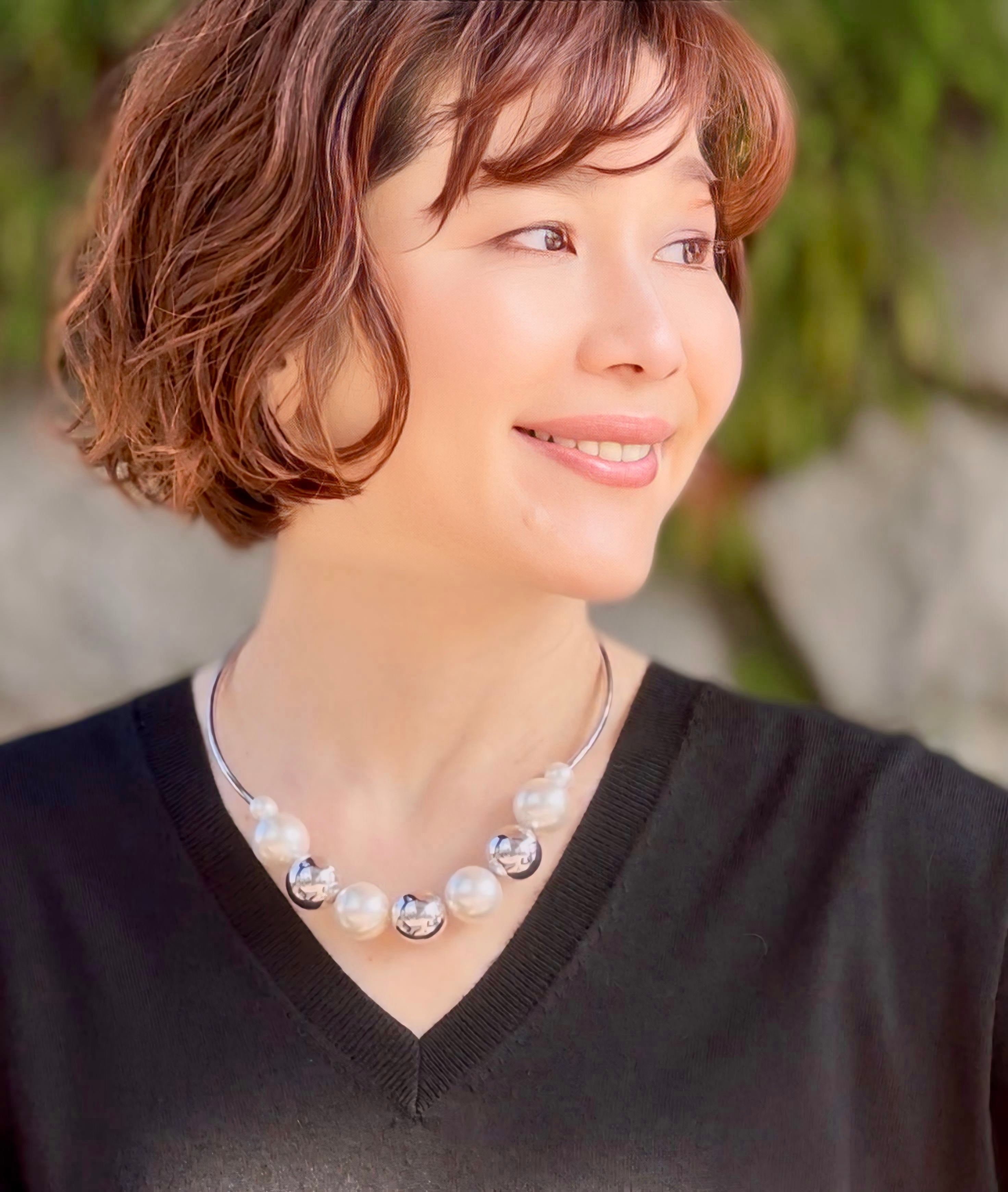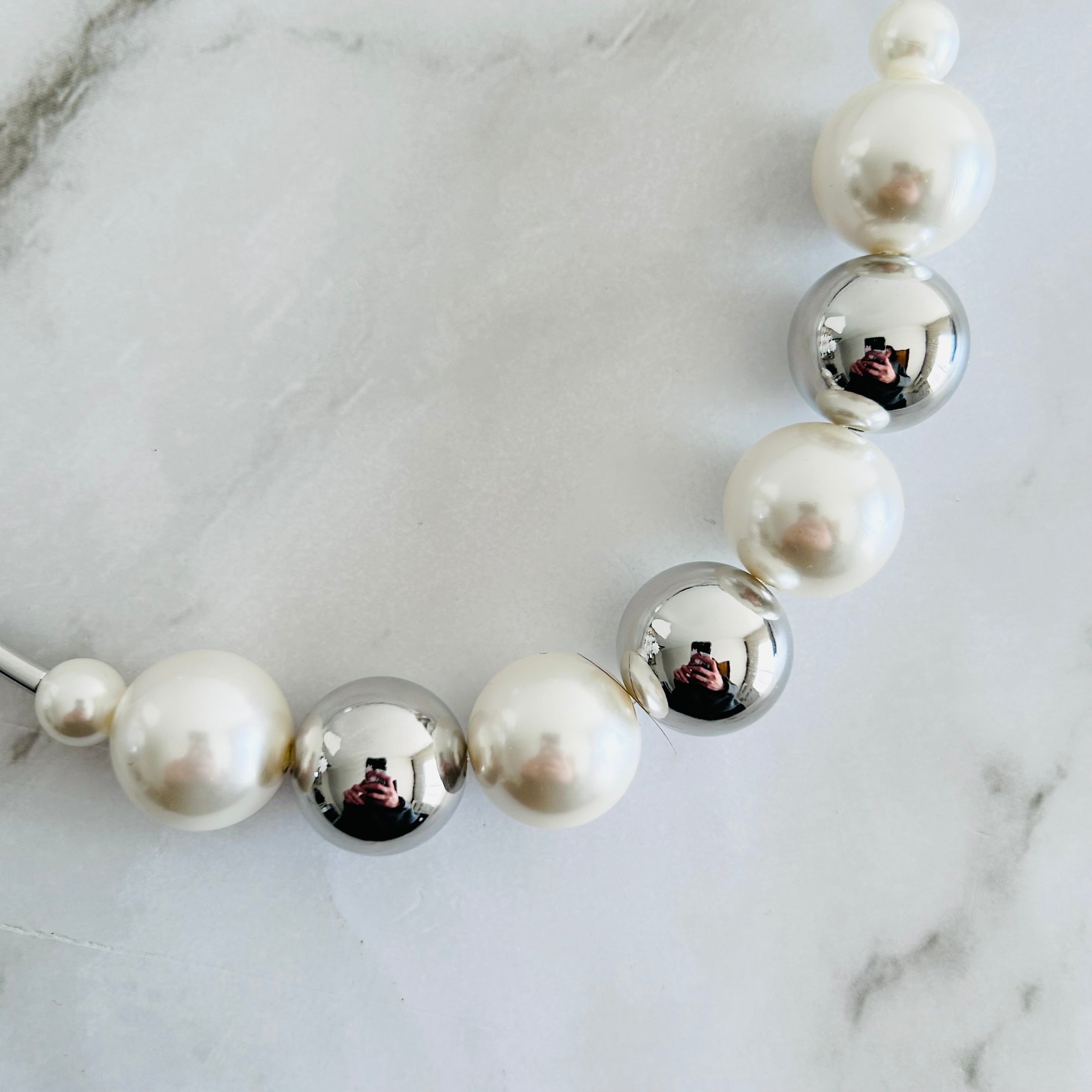 大小のパールと輝くシルバーボールをバランスよく配したチョーカーネックレスです。