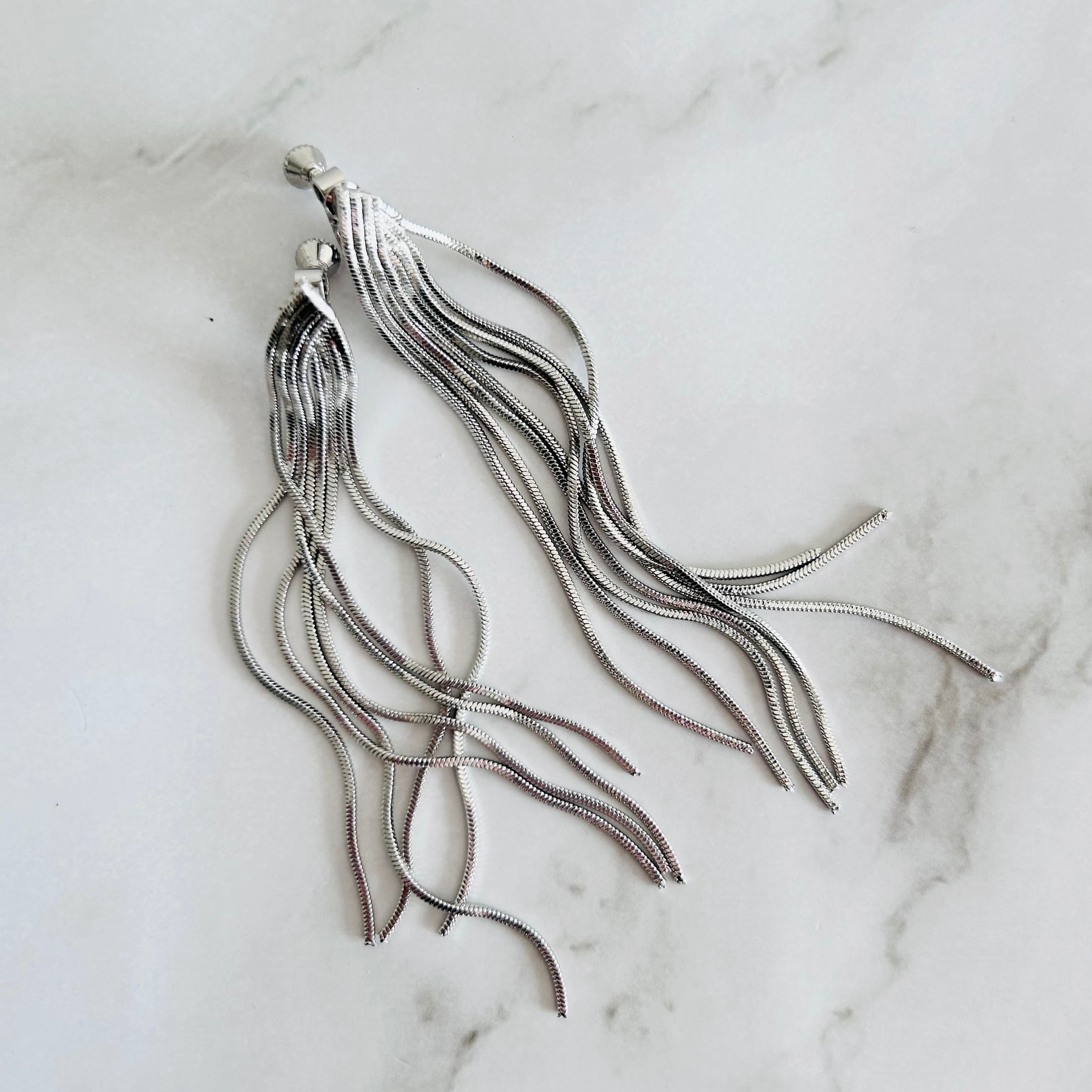 繊細なシルバーチェーンを幾重にも束ねた、軽やかなフリンジデザインのイヤリングです。
