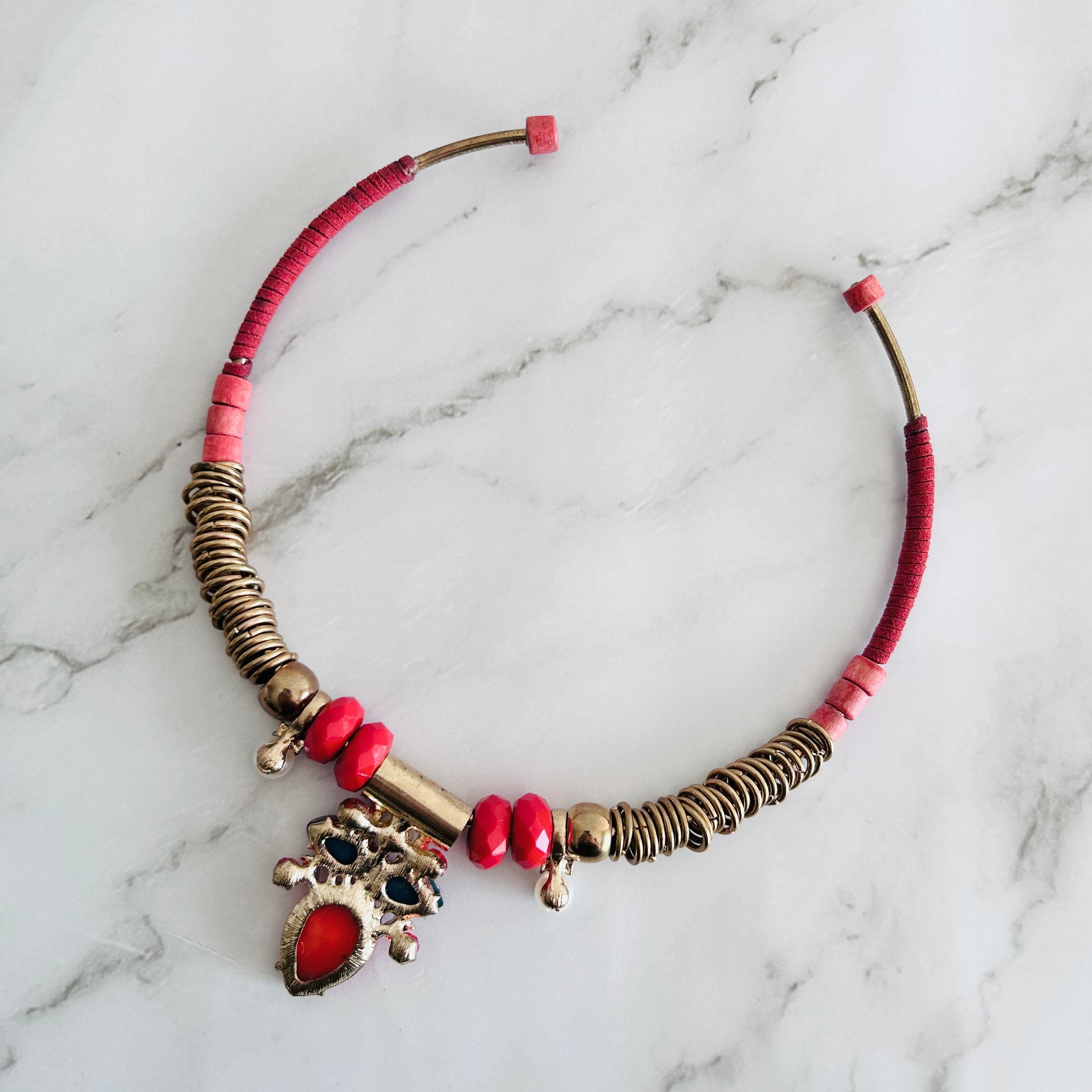 深みのあるレッドコードと、アンティーク調のゴールドパーツを組み合わせた、存在感のあるチョーカーネックレスです。