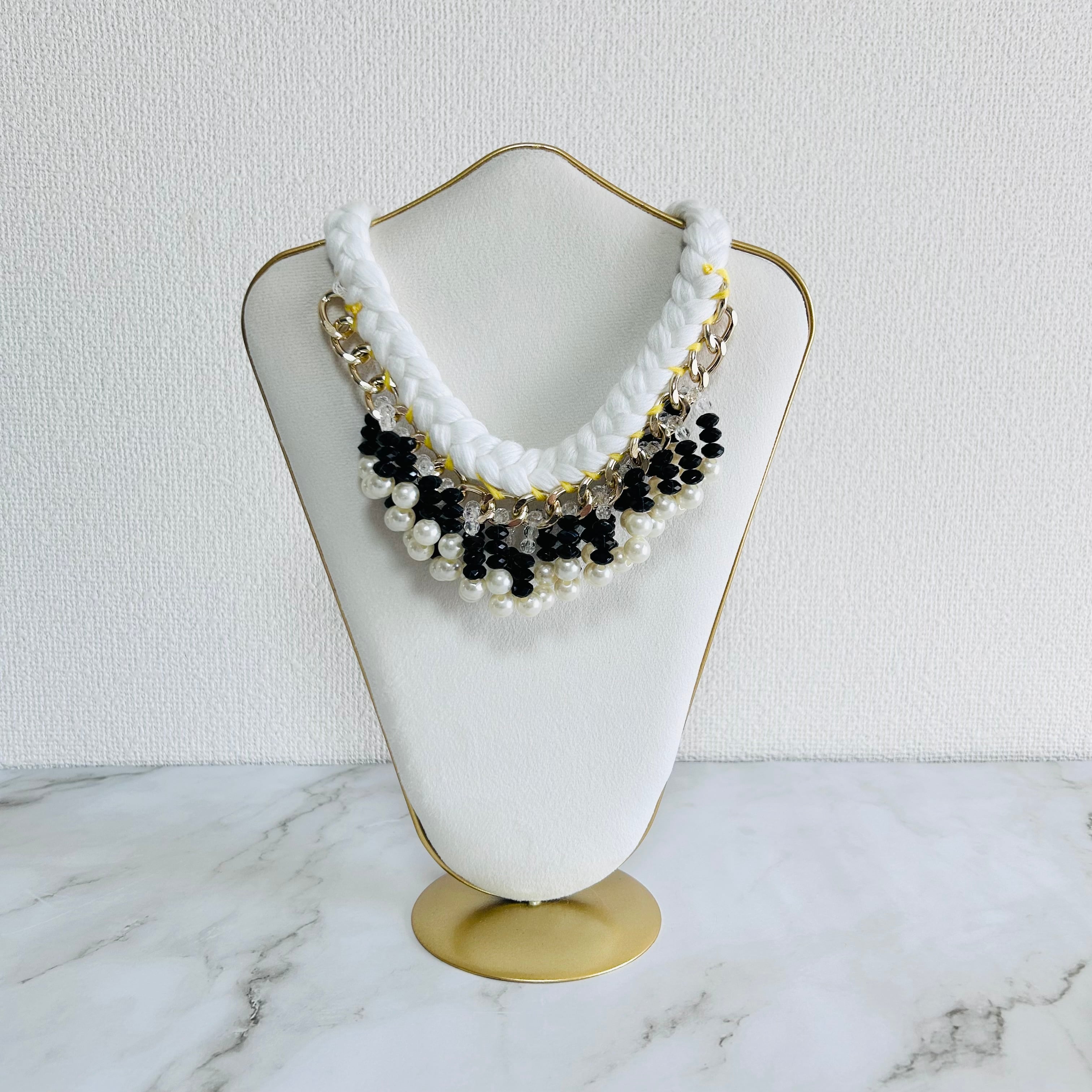 しなやかに編み込まれたホワイトコードに、パールとブラックとクリアカラーのビーズを重ねた、印象的で遊び心あふれるネックレスです。