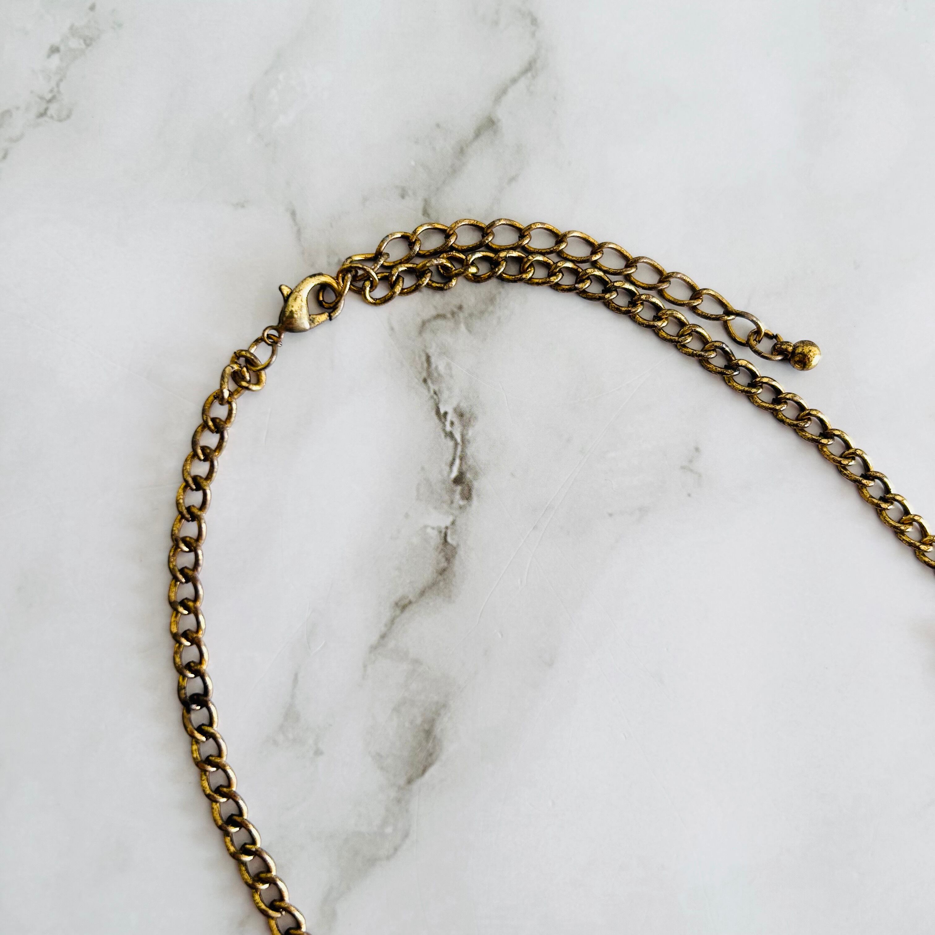 アンティークゴールドのチェーンと、奥行きのある色彩の組み合わせが、どこか物語を感じさせる佇まいに。