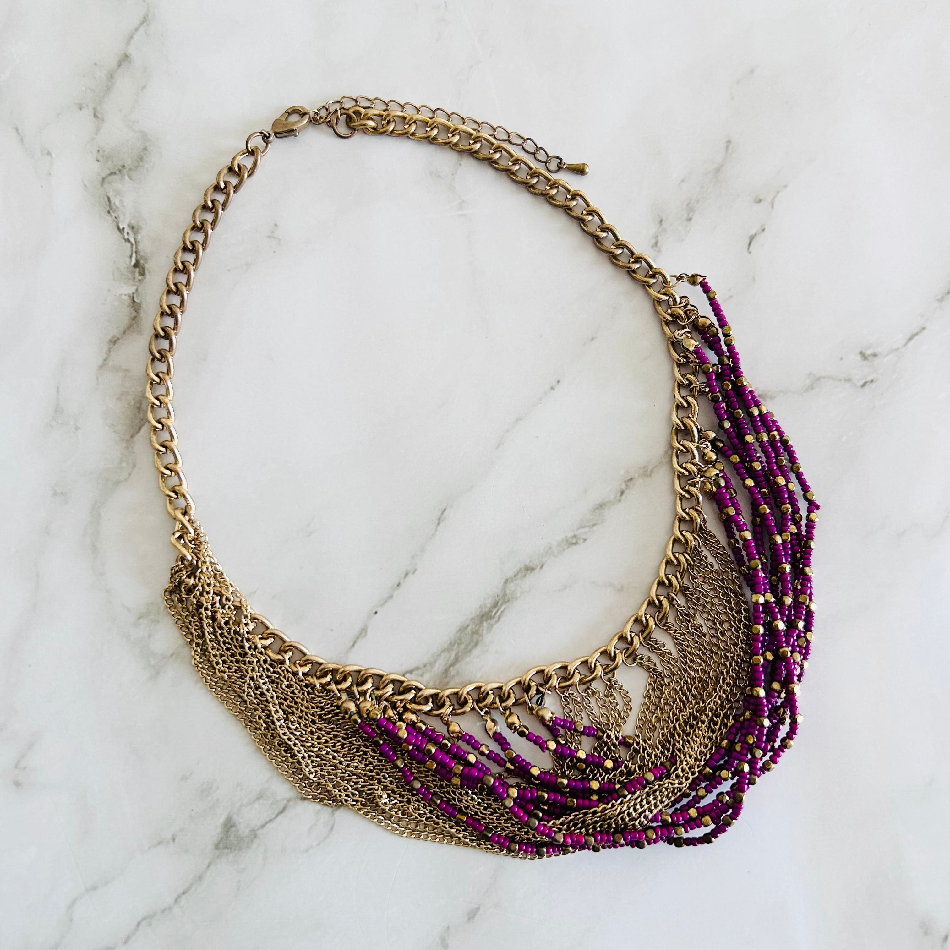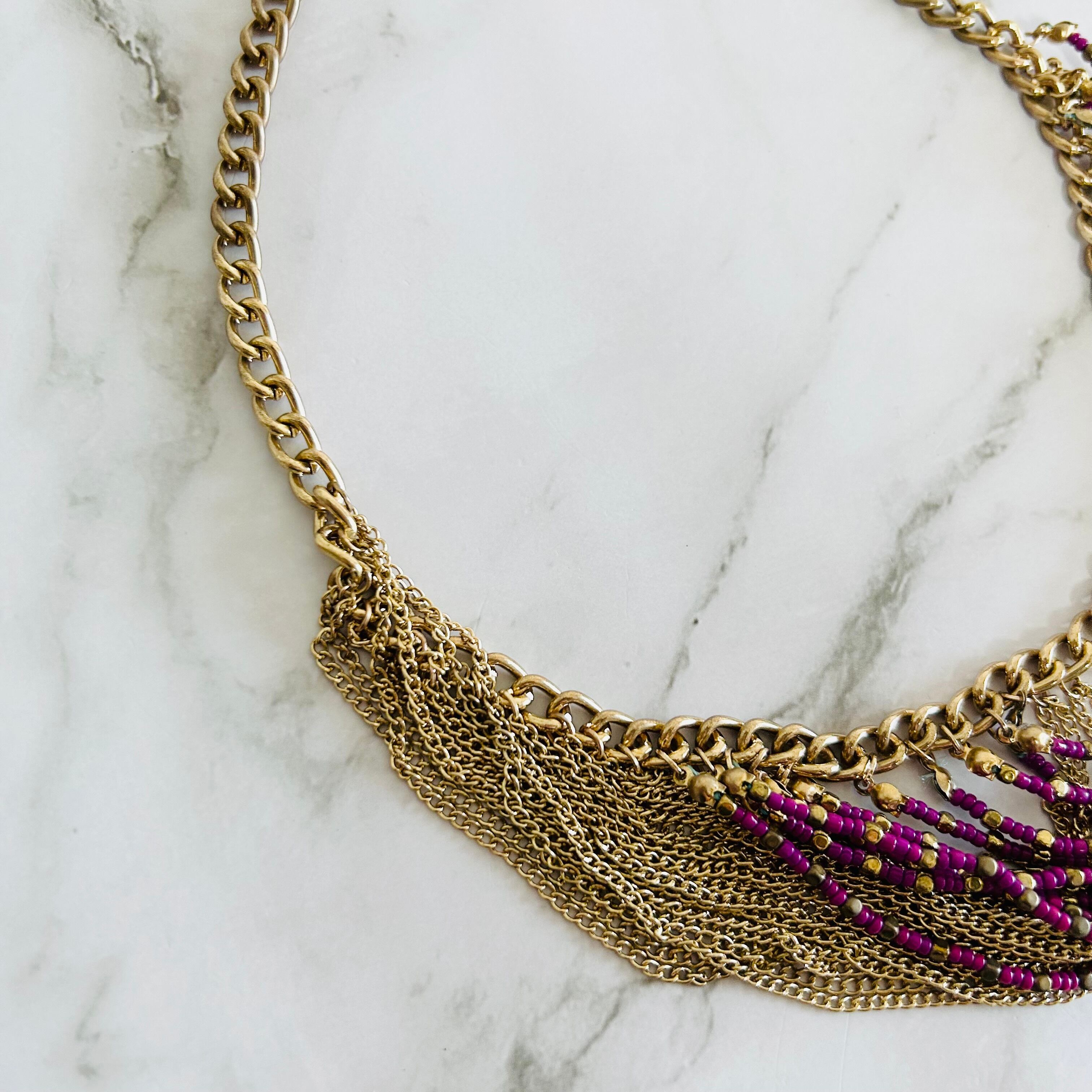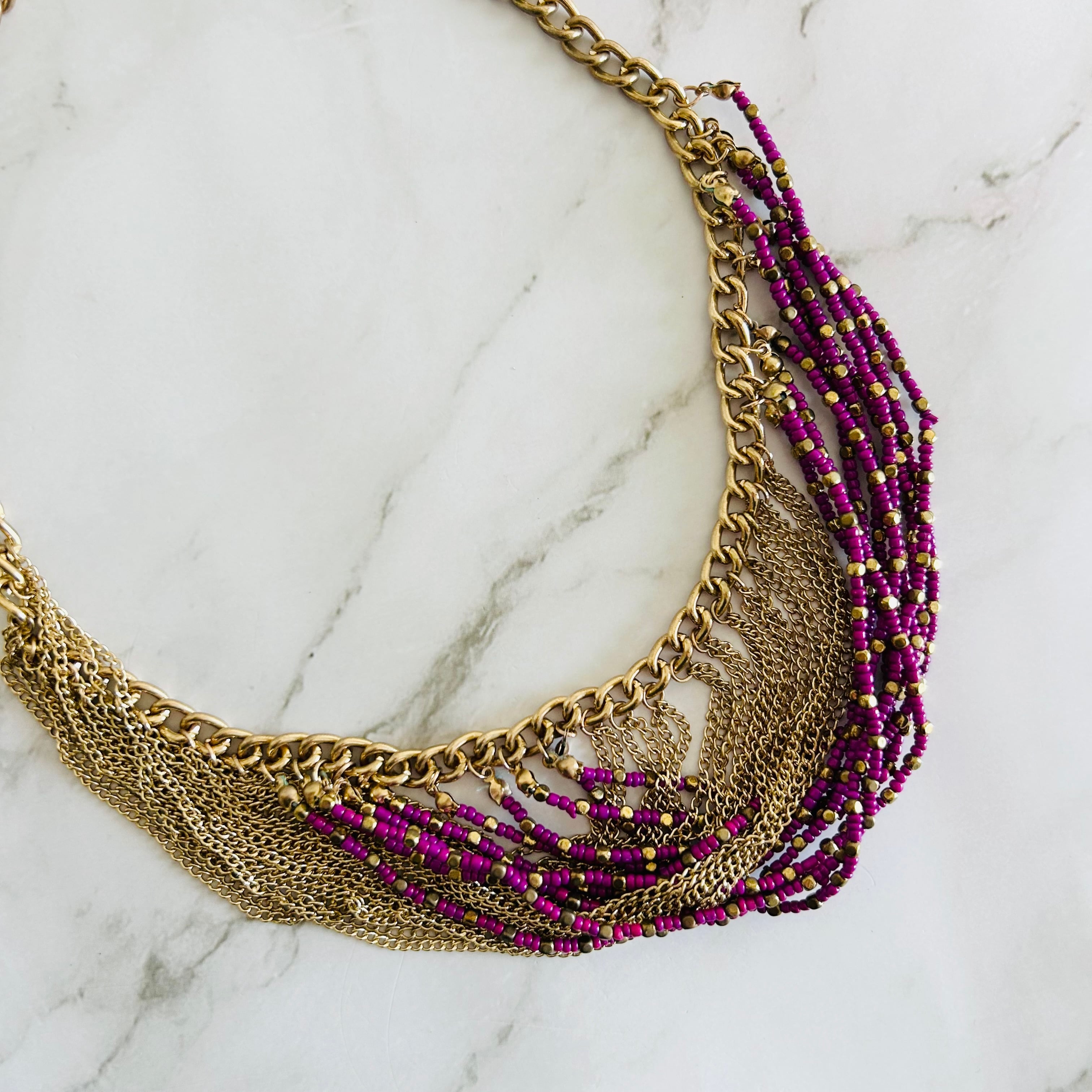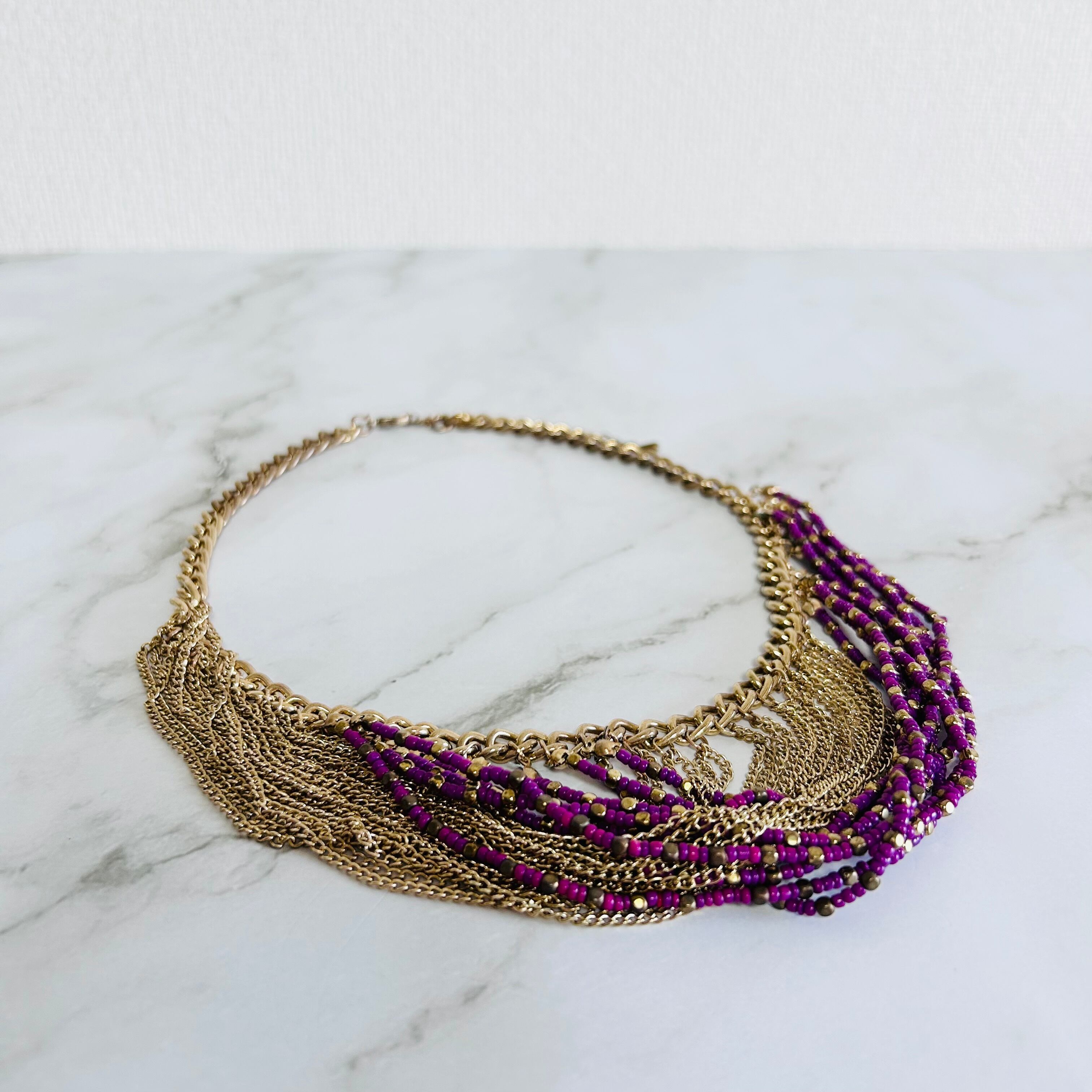 ゴールドチェーンに、深みのあるマゼンタカラーのビーズを繊細に編み込んだ、レースのような表情が印象的なネックレスです。
