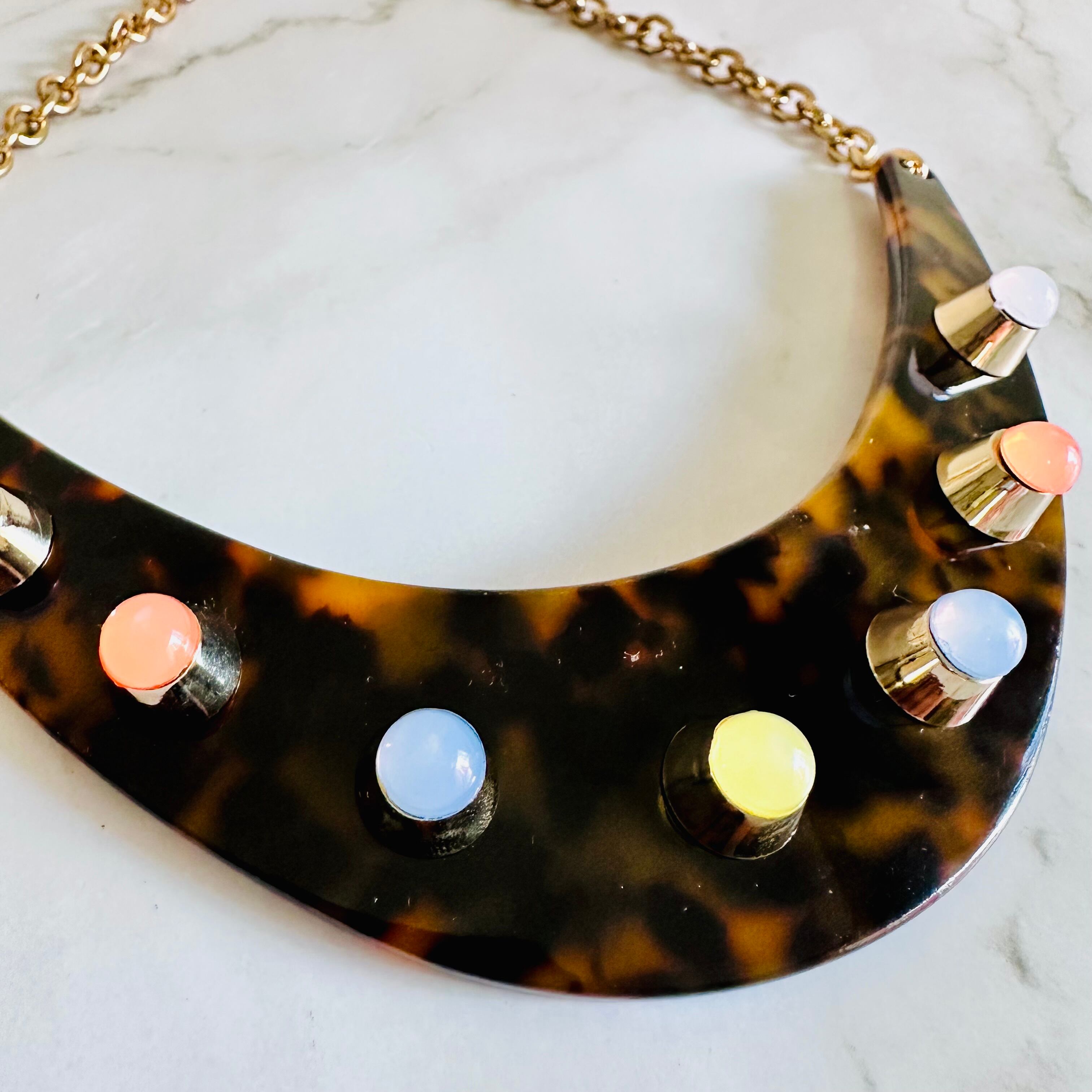 レオパード柄のような表情をもつべっ甲調トーンのパーツに、やさしいカラーのドットモチーフをあしらった、ユニークなデザインのネックレスです。