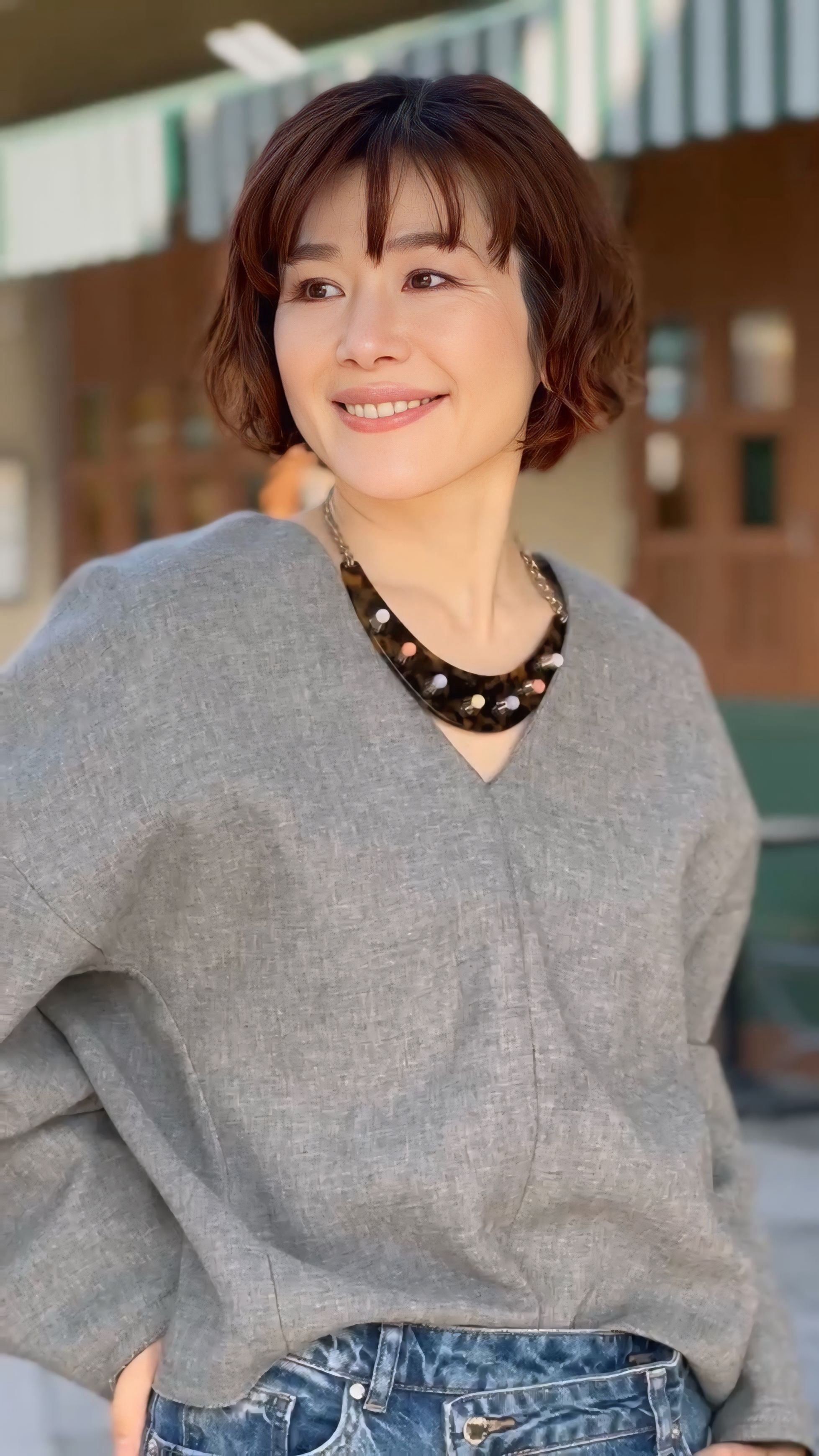 ネックレスの個性がほどよいアクセントとなり、装い全体を洗練された印象へ導いてくれます。