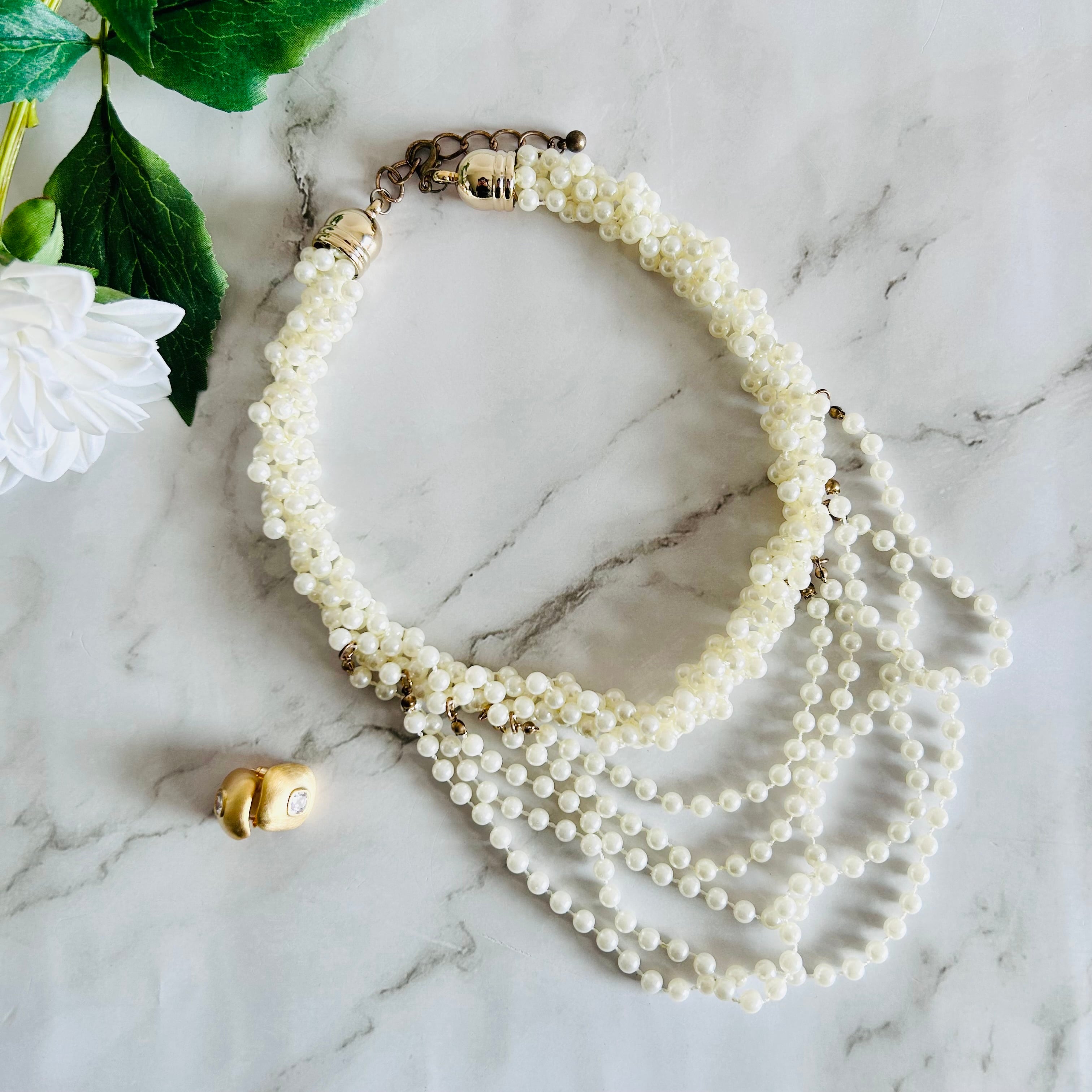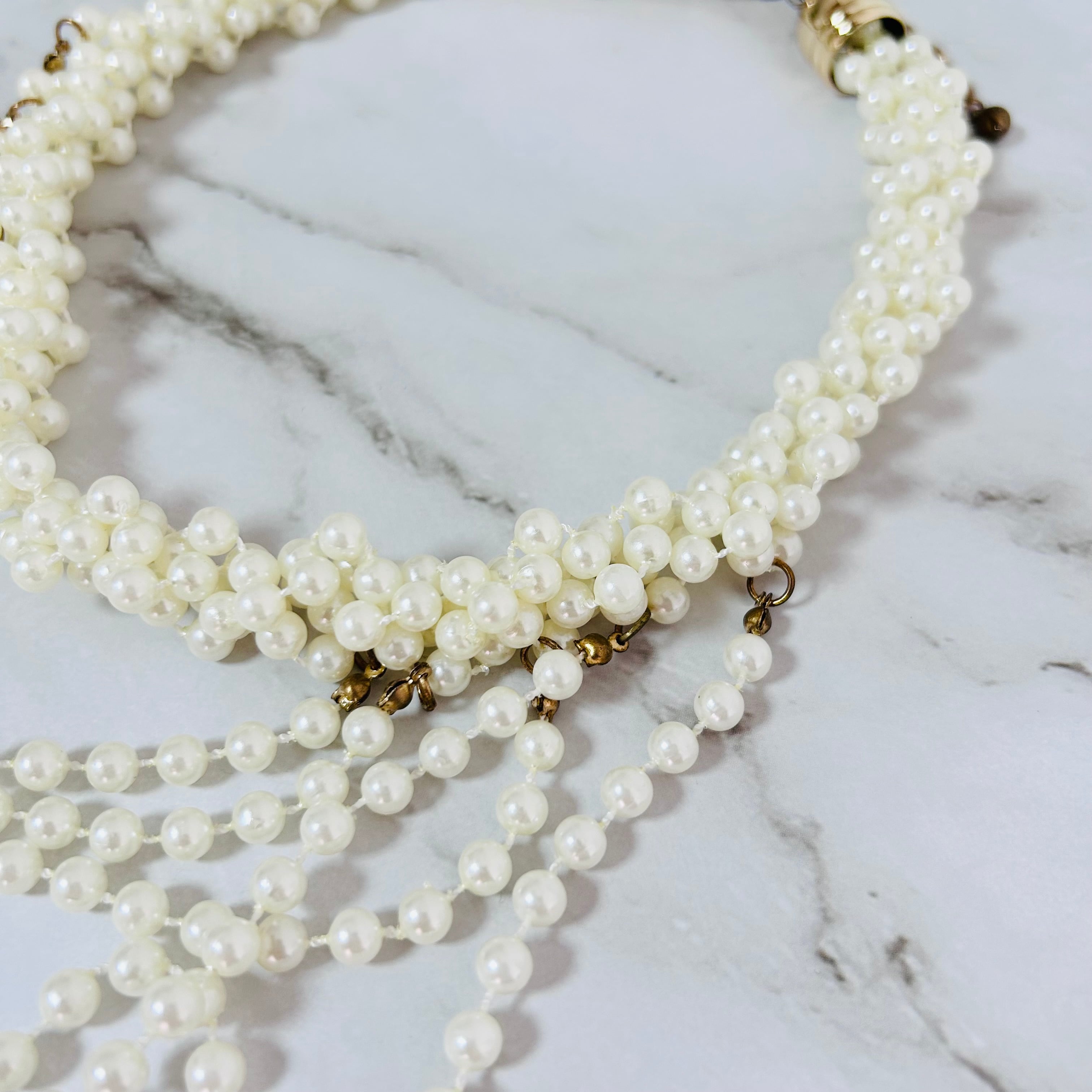 小粒のファッションパールを幾重にも重ねてレースのように連ねた、ボリューム感のある多連デザインのネックレスです。