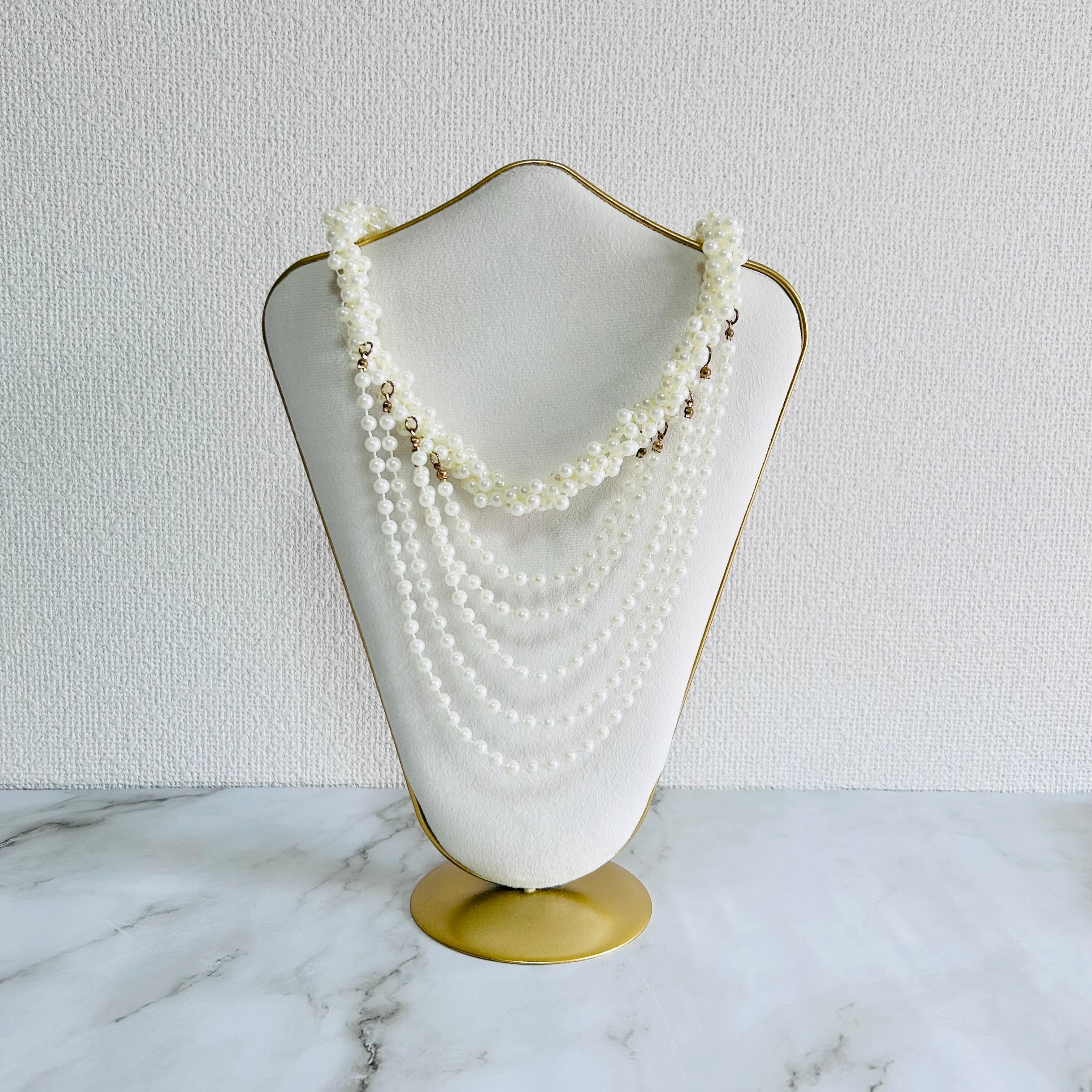 繊細なサイズ感のパールがリズミカルに重なり合い、流れるような美しいドレープを描きます。