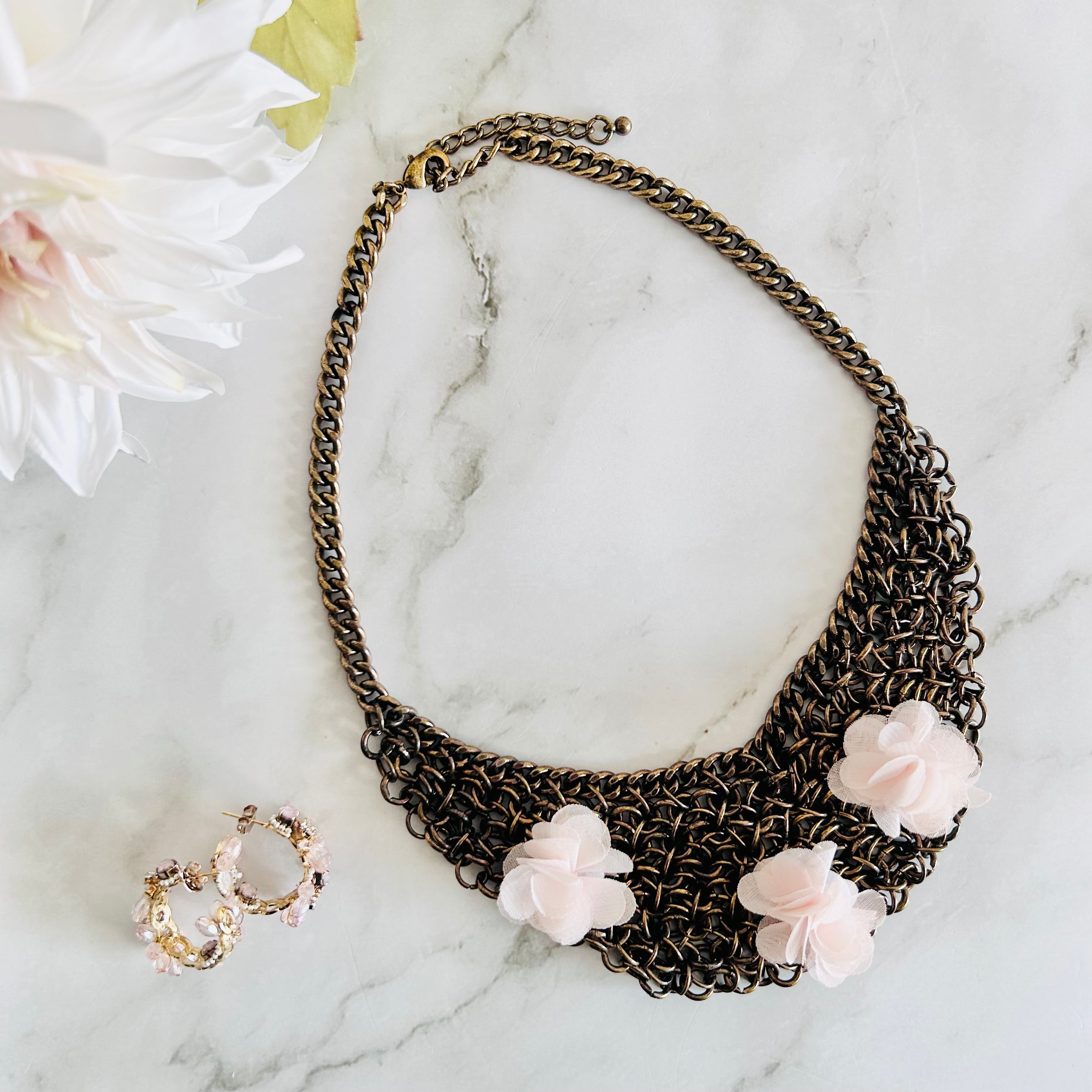 重なり合うチェーンが生み出す立体感と、淡く透けるお花のコントラストが印象的で、モダンな中にほのかな可憐さを感じさせます。