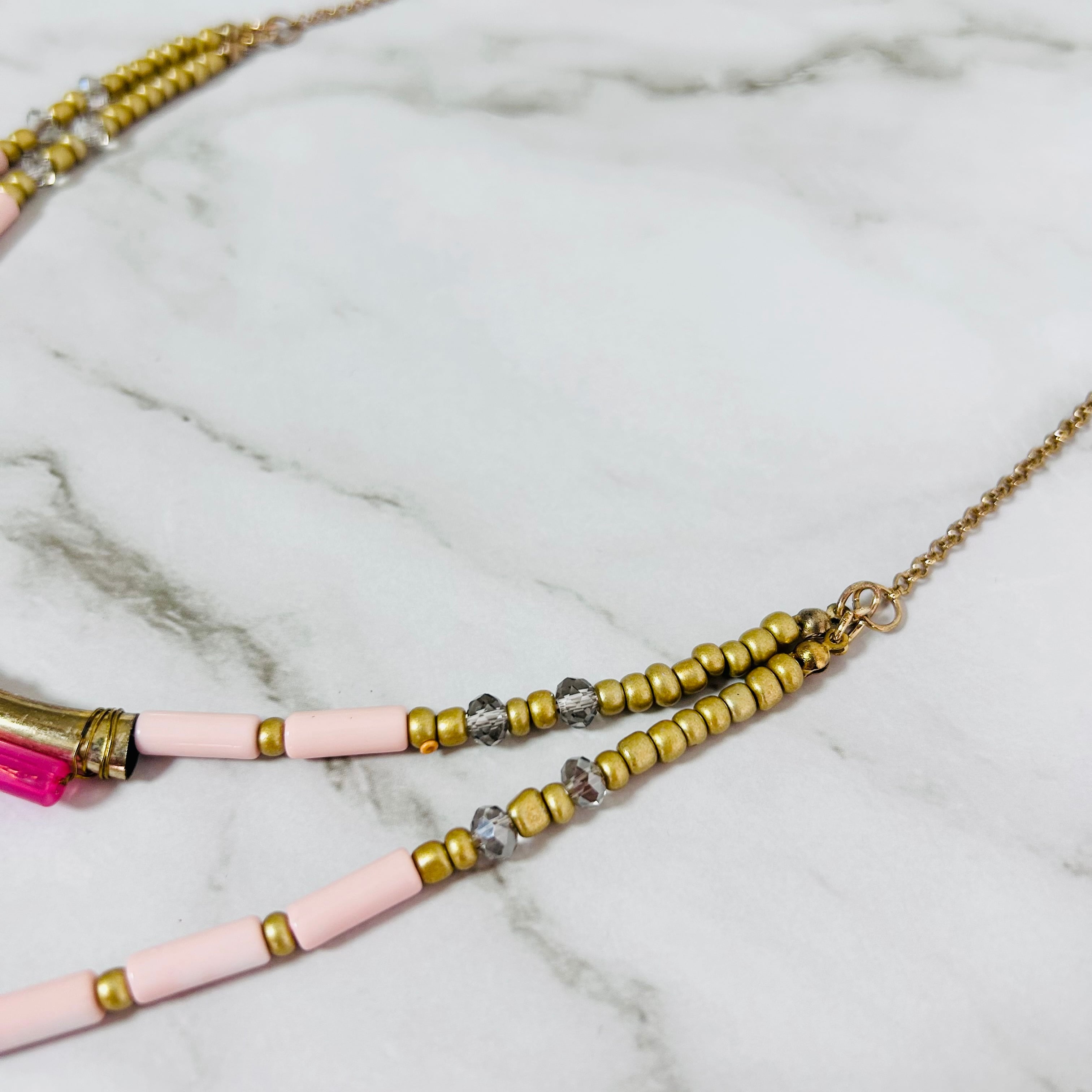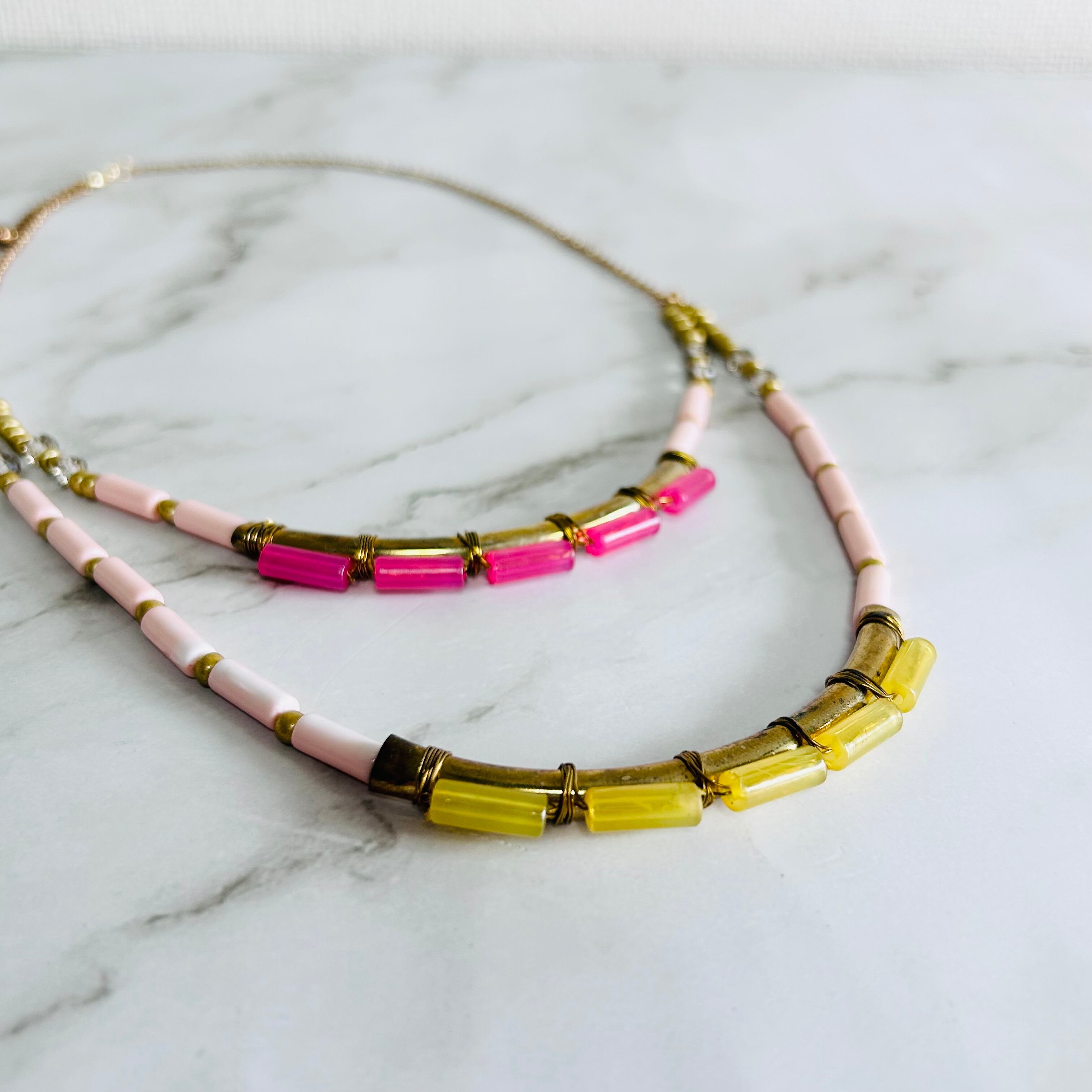 淡いピンクのスティックビーズ、ゴールドトーンの小さなビーズ、そしてアクセントとして配されたビビッドなピンクとイエローのクリアパーツが印象的なネックレスです。