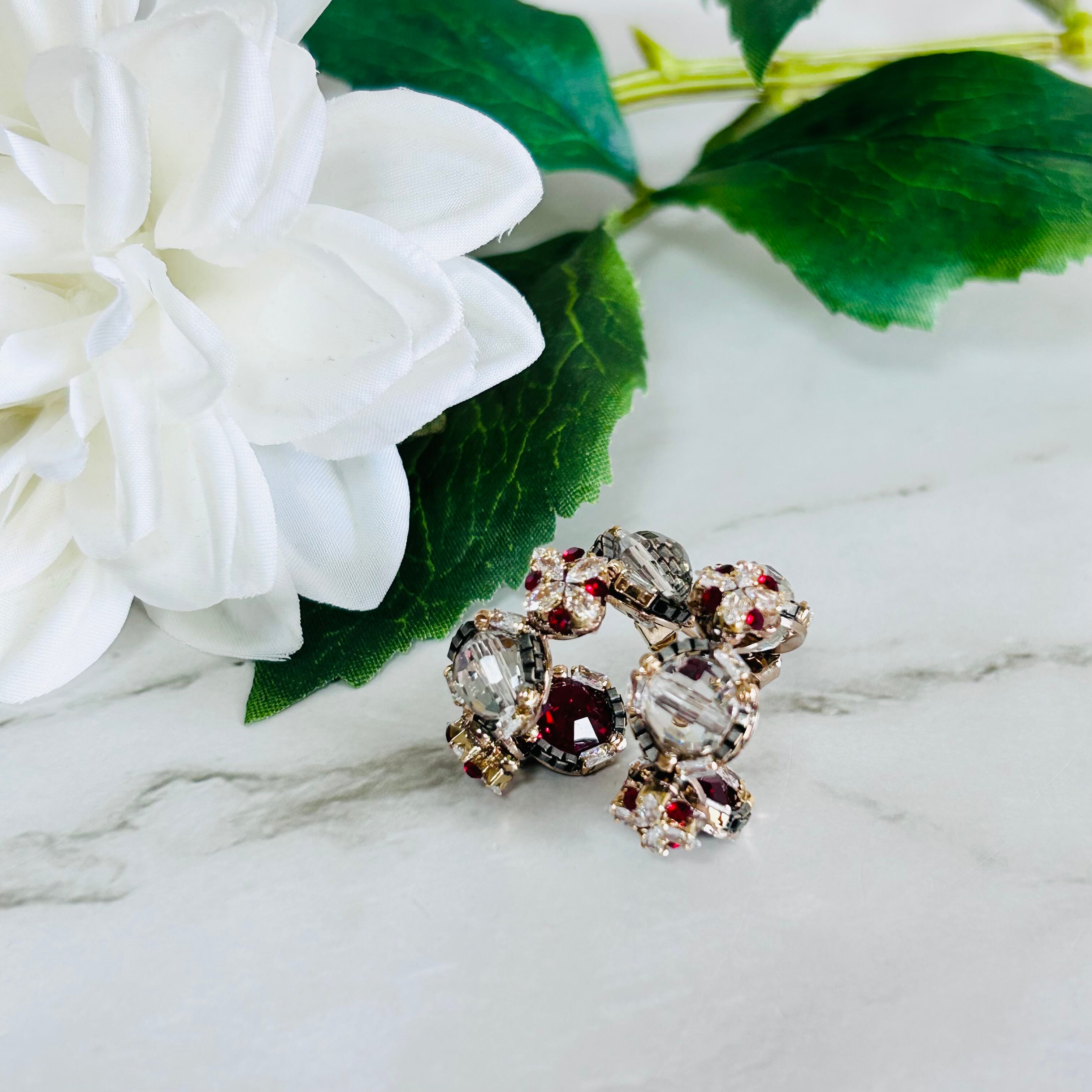 透明感のあるクリスタルカットビーズを中心に、深みのあるレッドビジューと繊細なパーツを重ねた、立体感のあるデザインのピアスです。