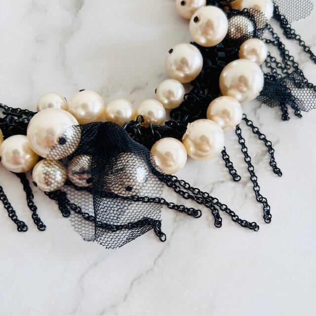 ブラックチェーンに大小のパールを贅沢にあしらい、繊細なチュールレースのチャームとフリンジチェーンをアクセントに添えたネックレスです。