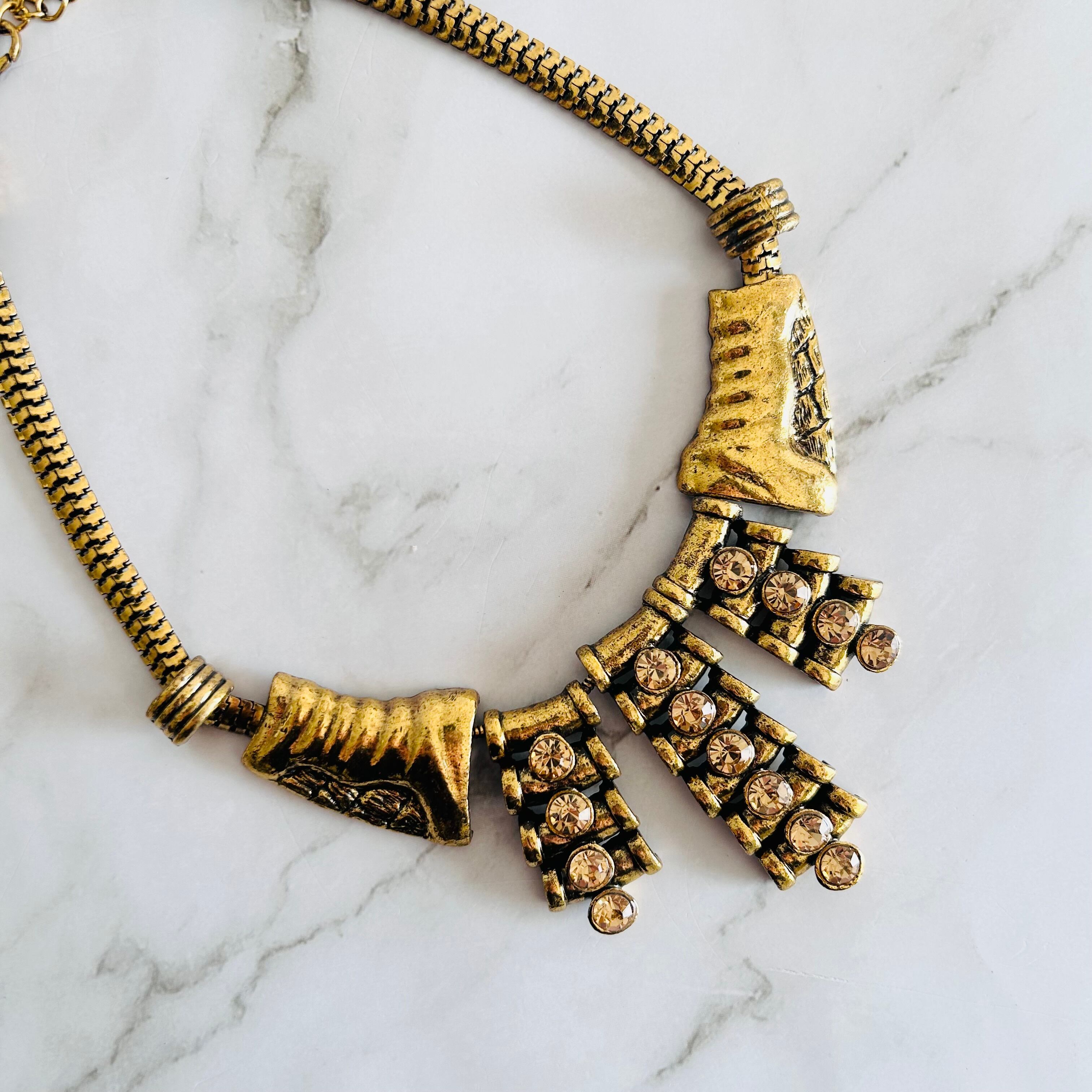 重厚感のあるアンティークゴールドのメタルパーツに、華やかなアンバーカラーのビジューを贅沢にあしらった存在感あふれるネックレスです。