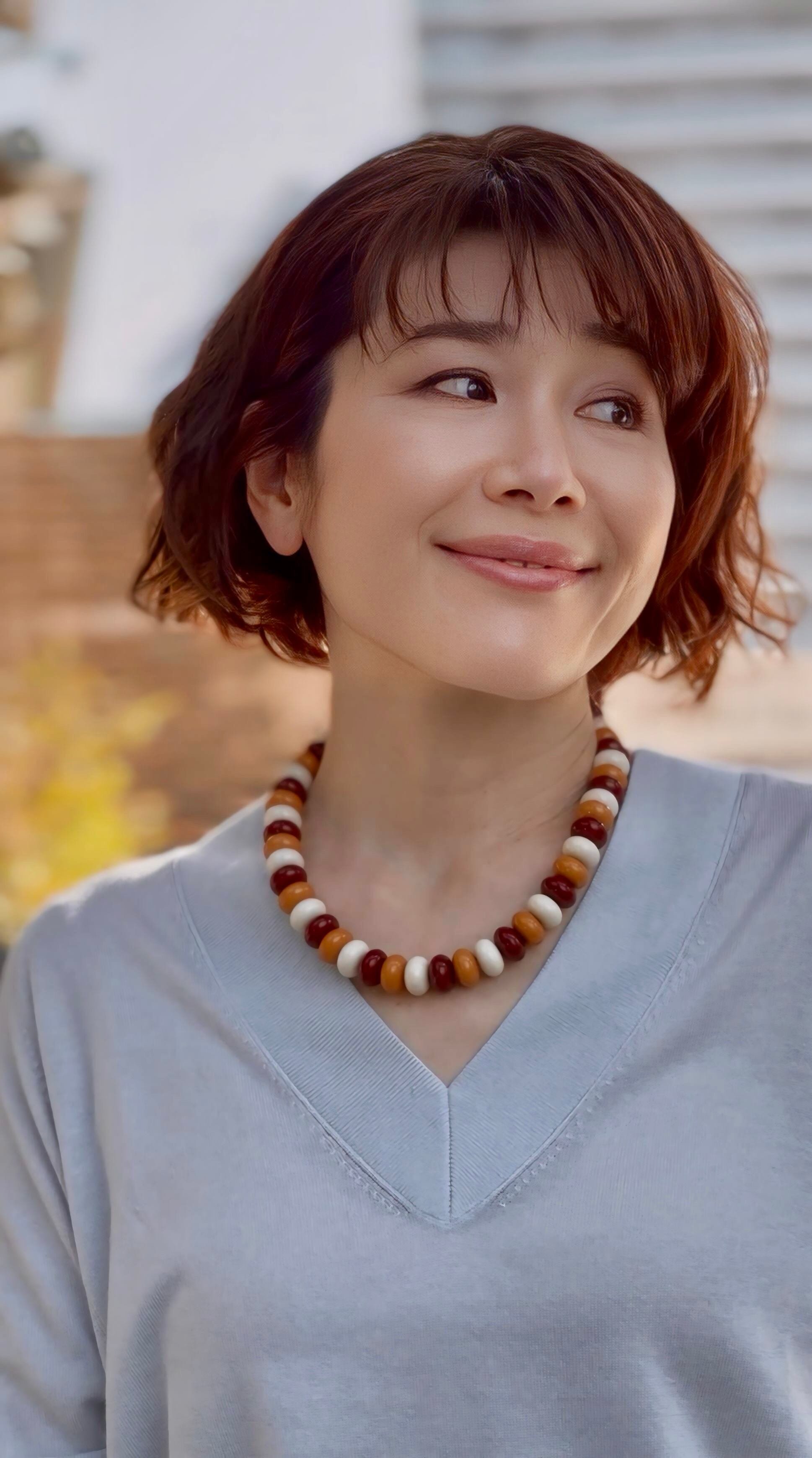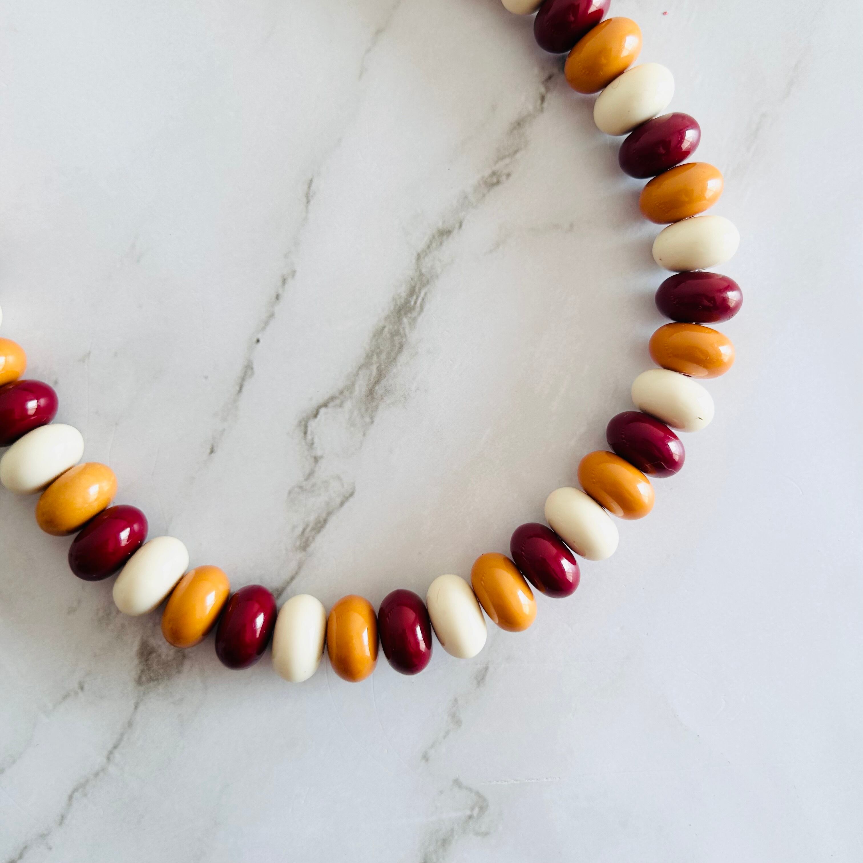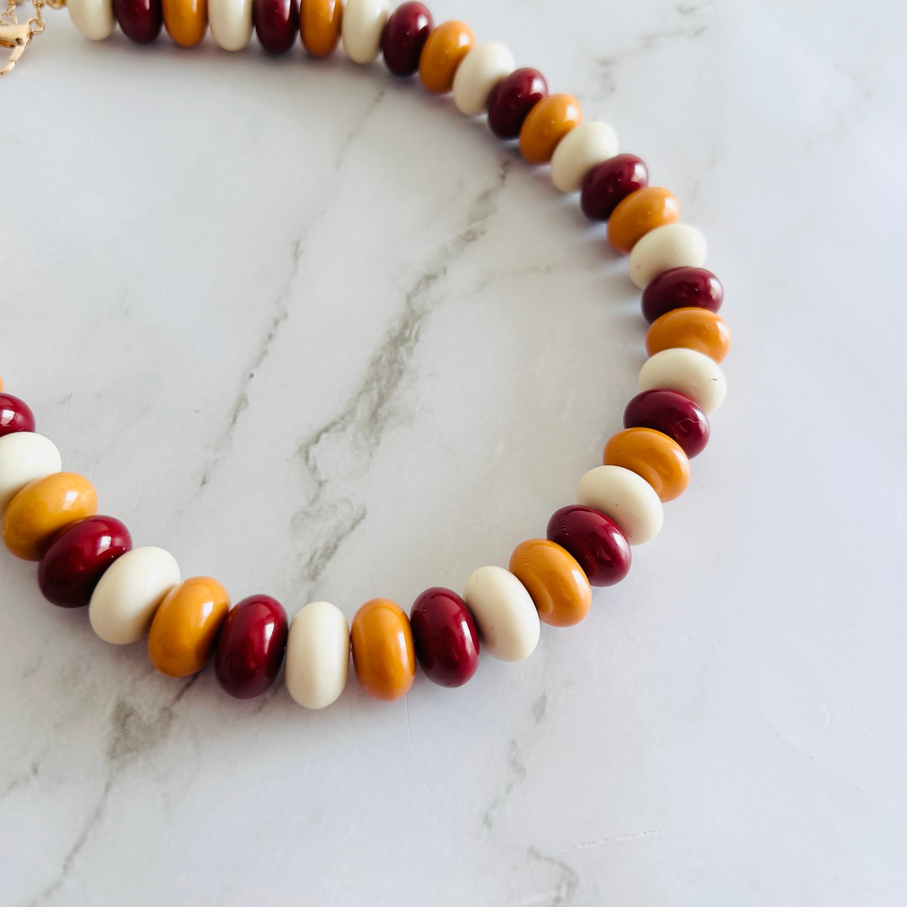 色の組み合わせが生み出す温かみと華やかさが、大人の装いに遊び心を添えてくれるネックレスです。