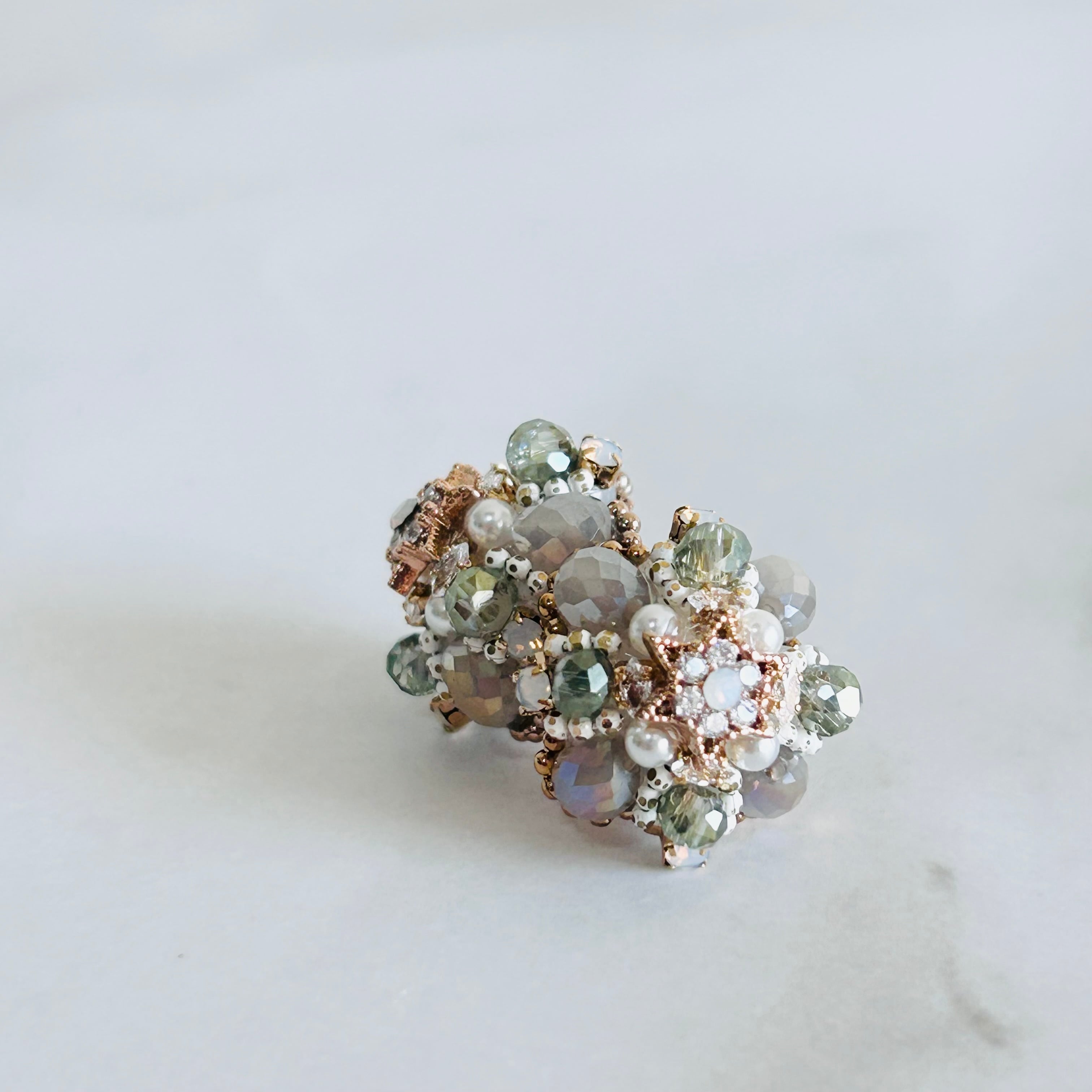 淡いグリーンやオーロラのように光を含むブルーグレーのクリスタルが重なり合い、中央には星のようなモチーフを配置。