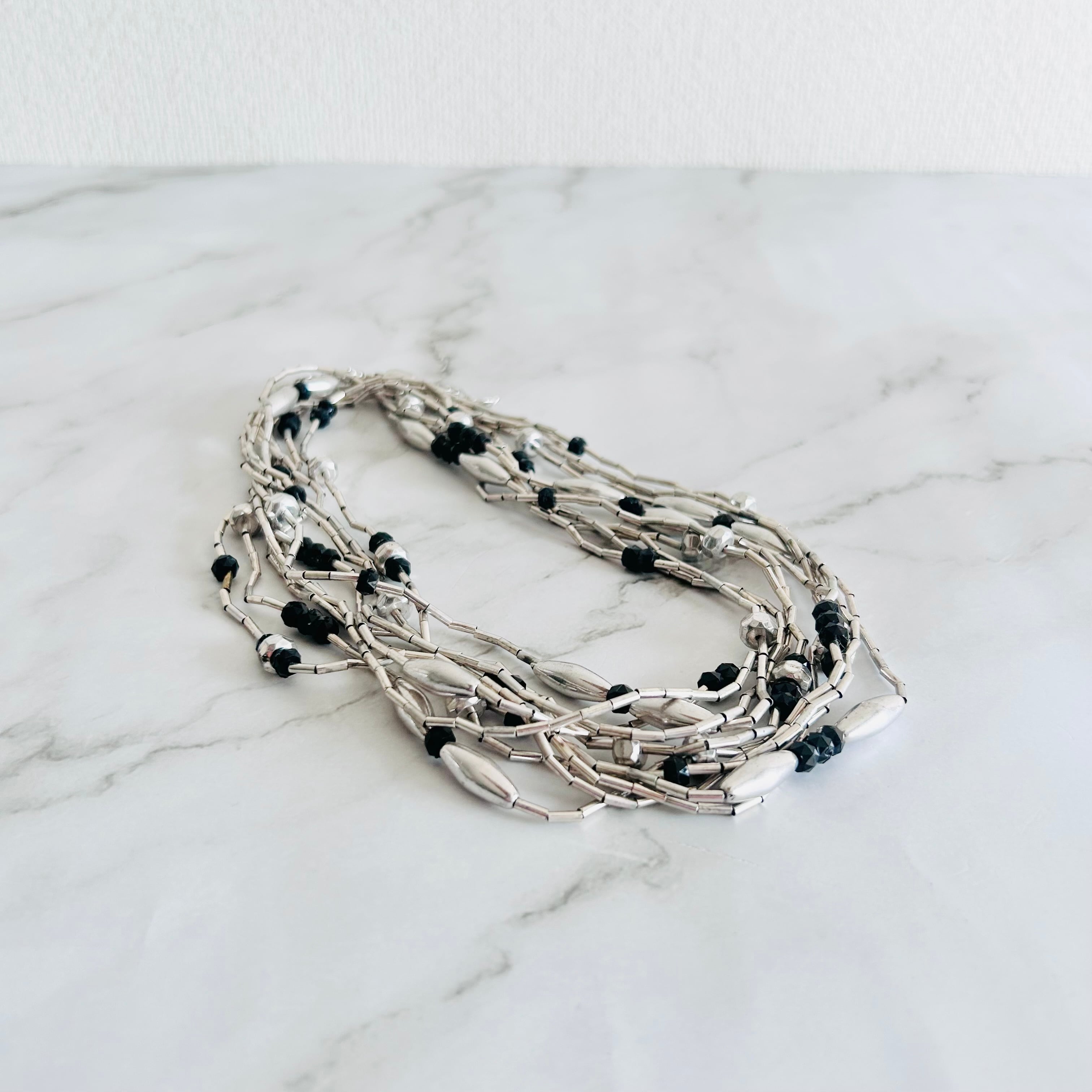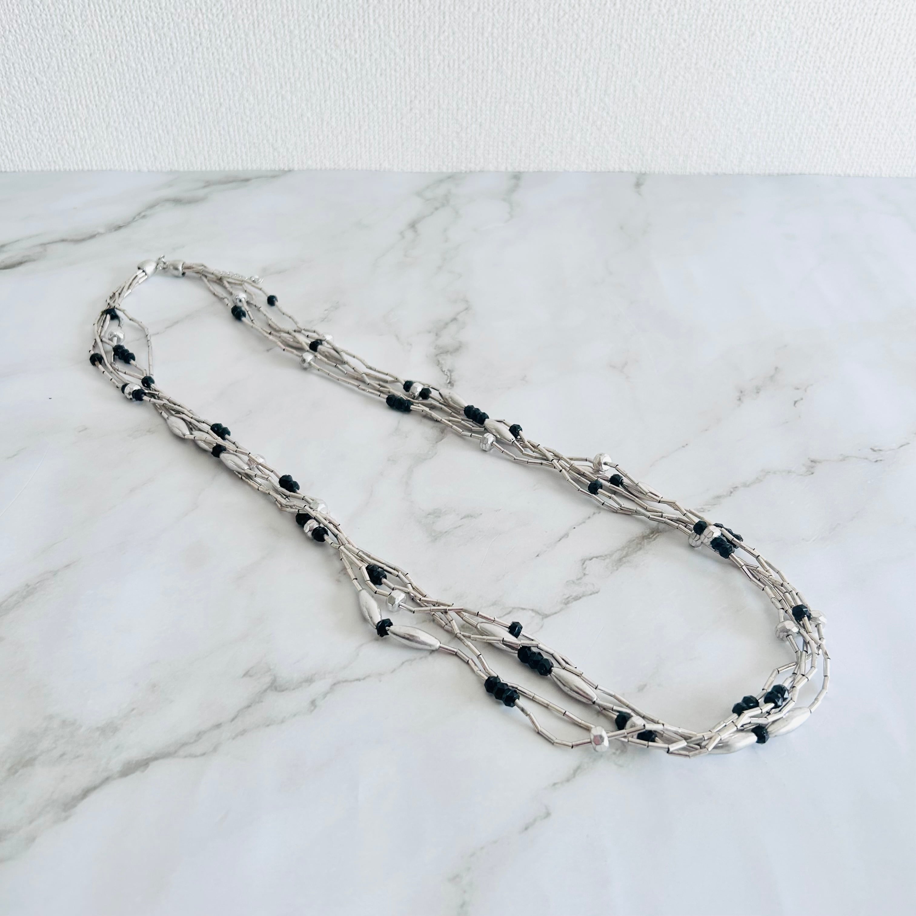 細やかなシルバービーズを幾重にも連ねた、存在感あふれるロングネックレスです。