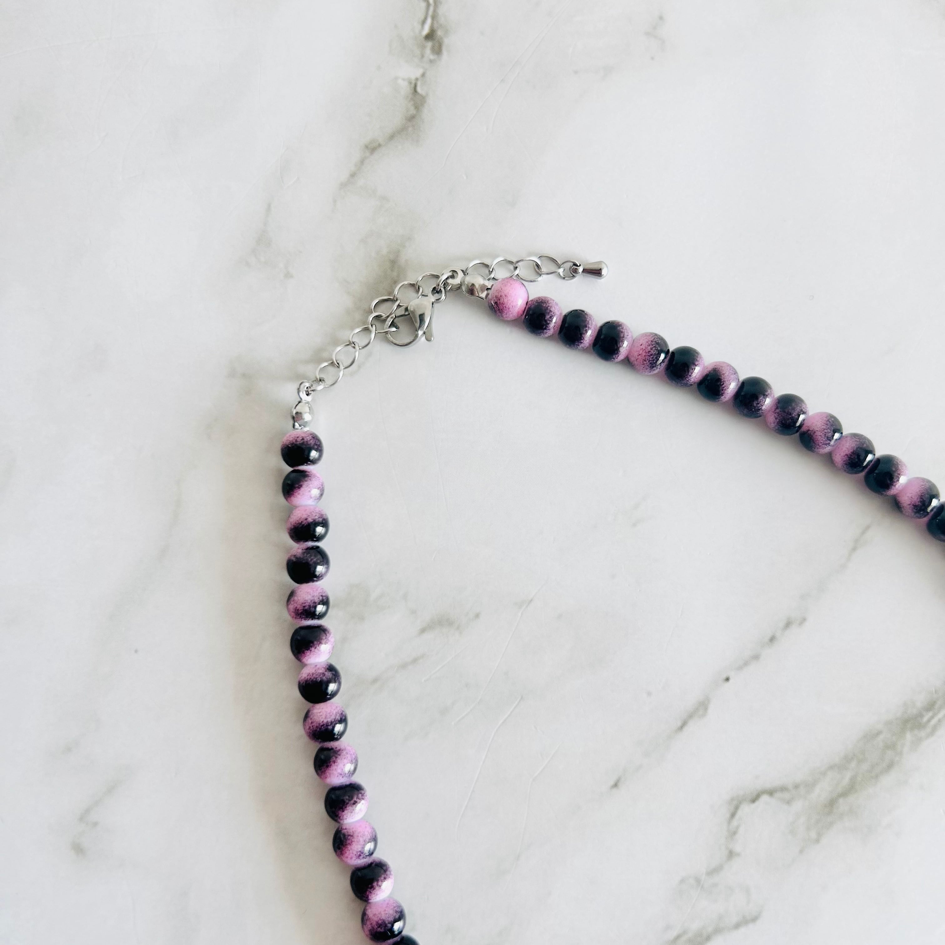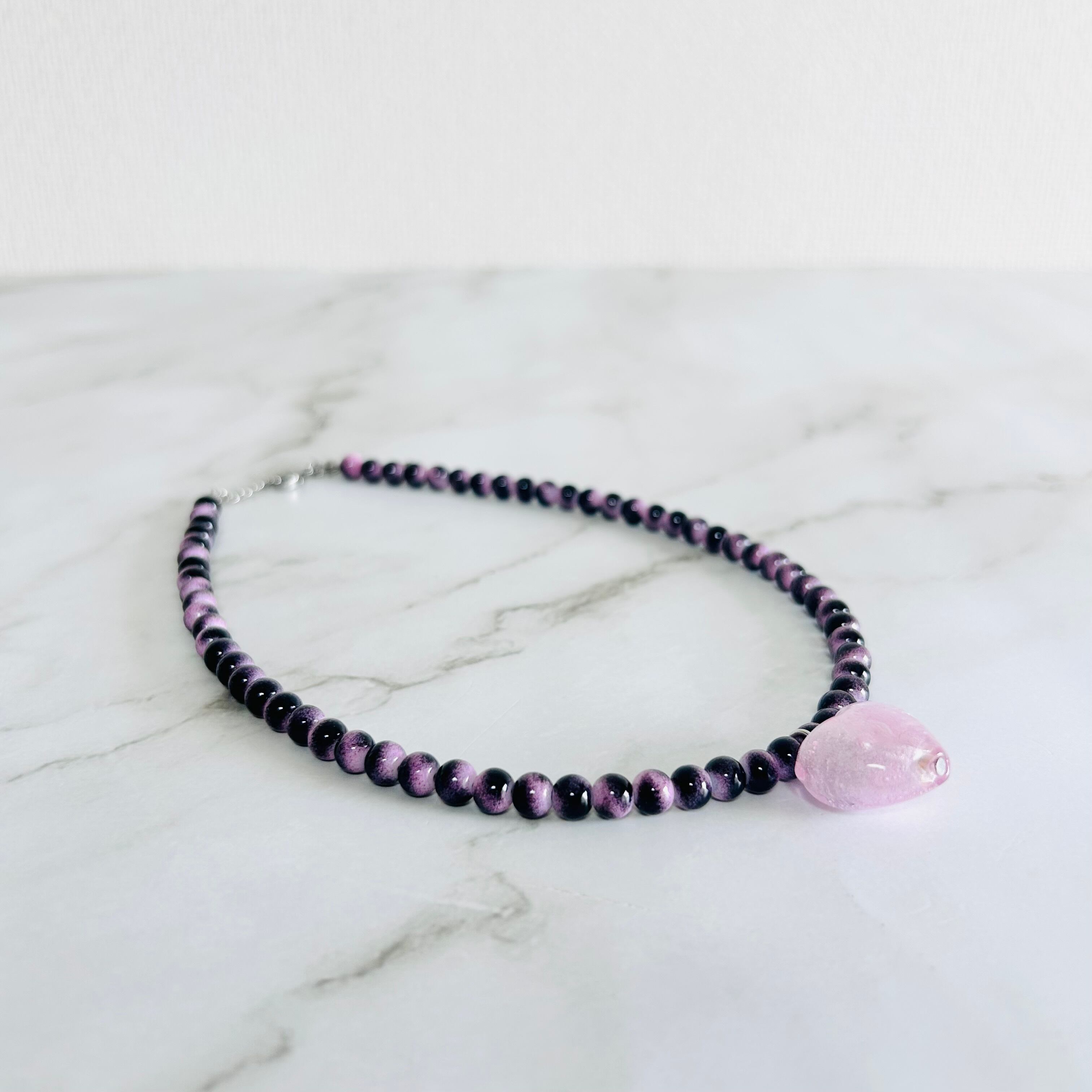ピンクとブラックが溶け合うようなグラデーションビーズに、やわらかなローズピンクのハートモチーフをあしらったネックレスです。