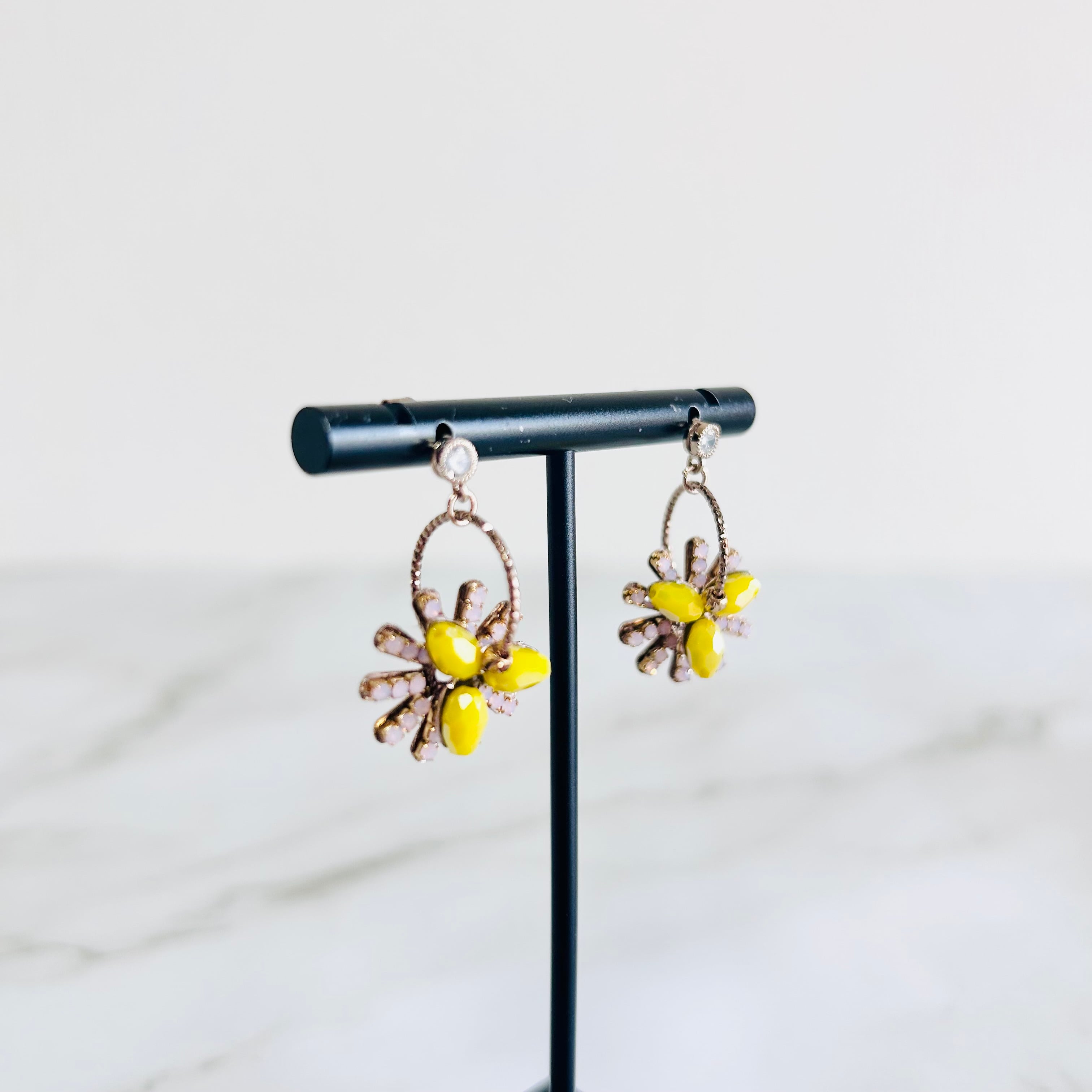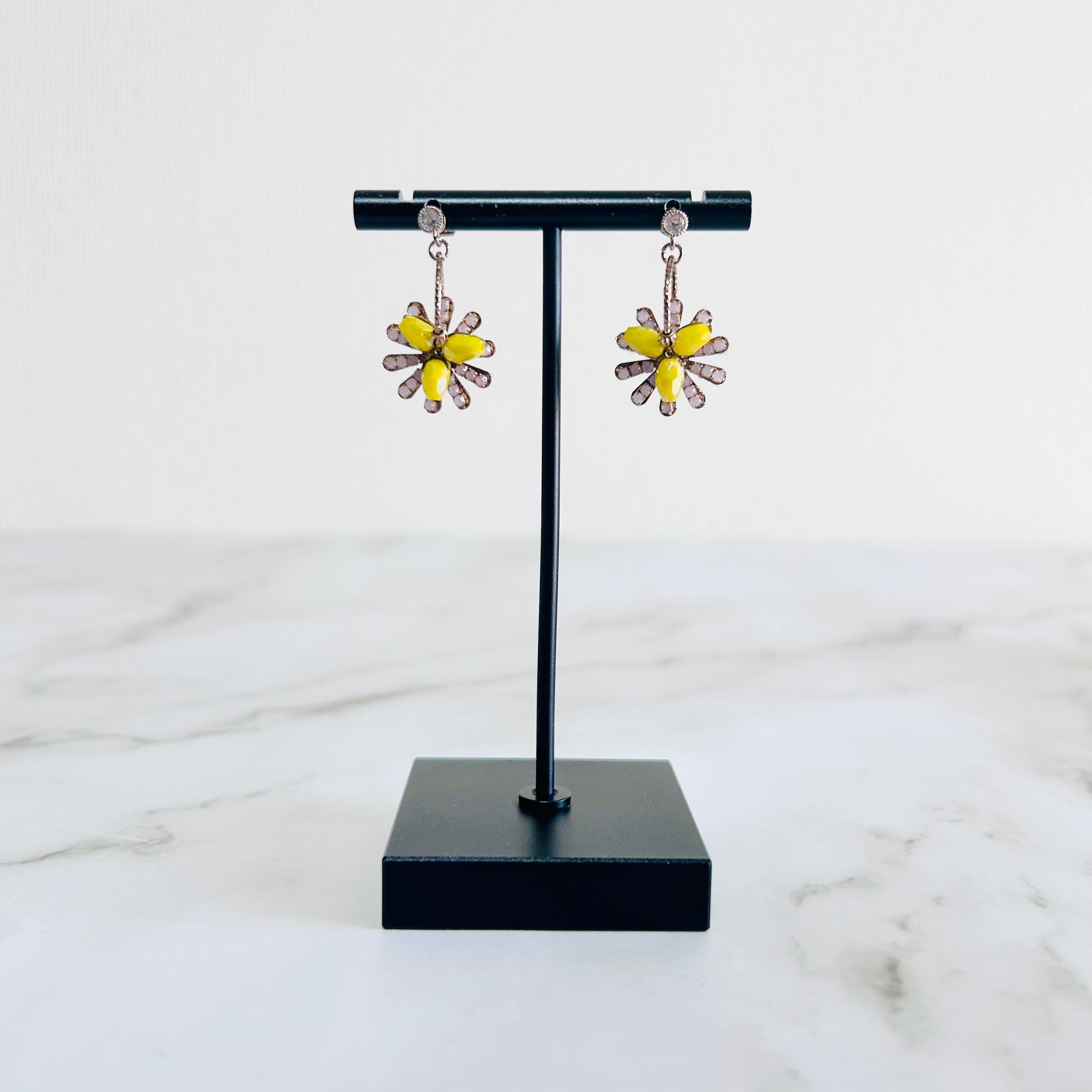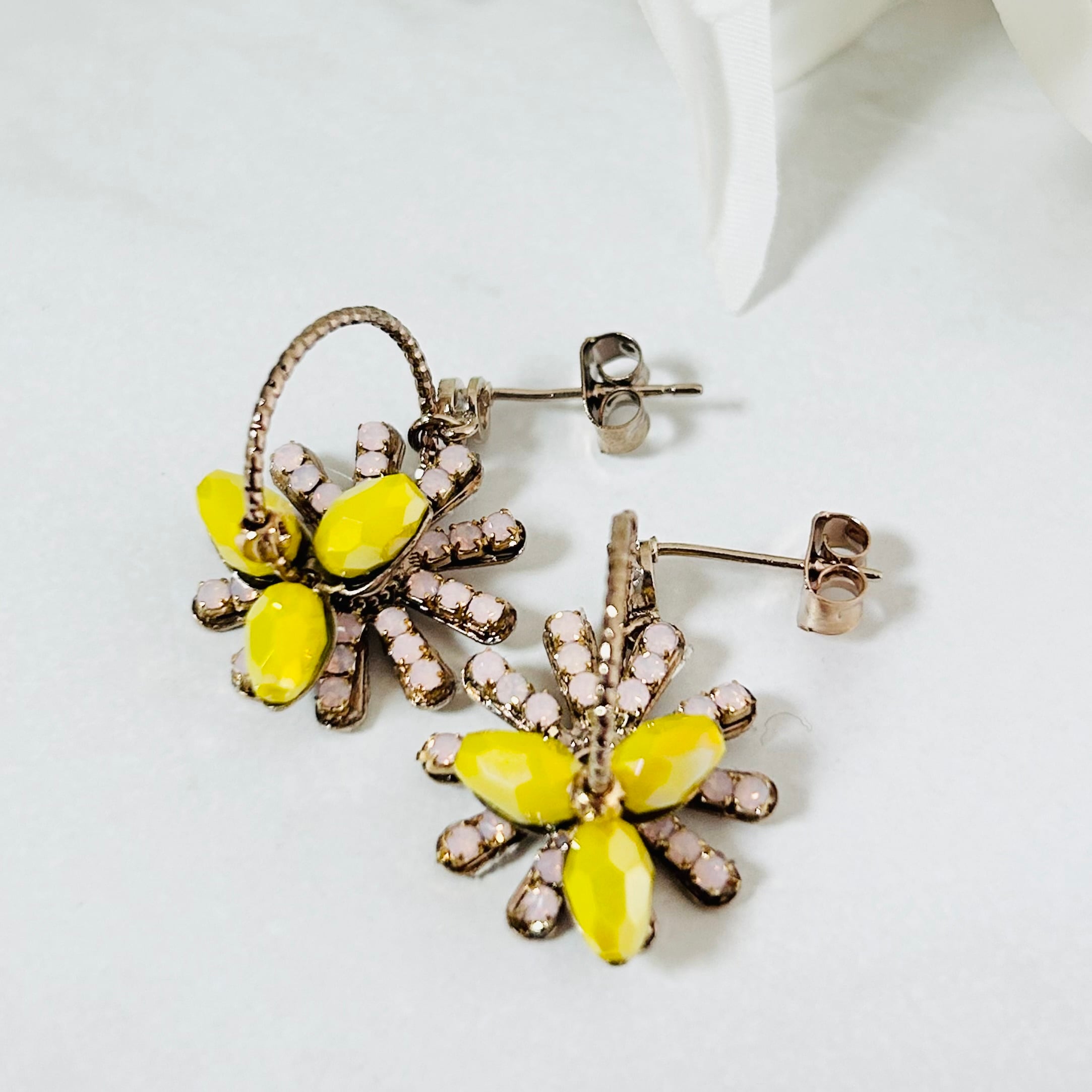 淡いピンクのフラワーモチーフに、鮮やかなレモンイエローのビジューをあしらったクリスタルピアスです。
