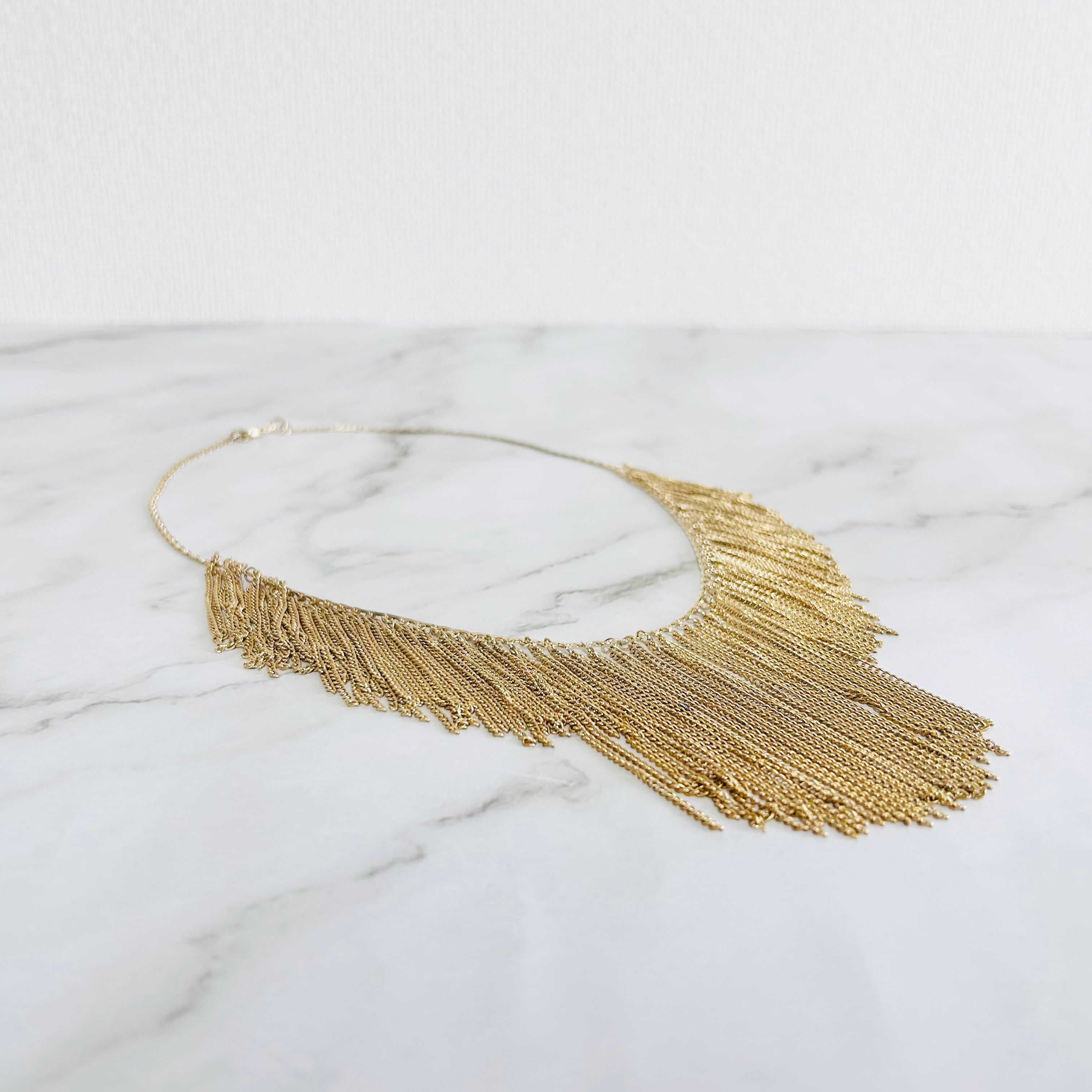 しなやかなゴールドチェーンをひとつひとつ丁寧に取り付けた、フリンジデザインのネックレスです。