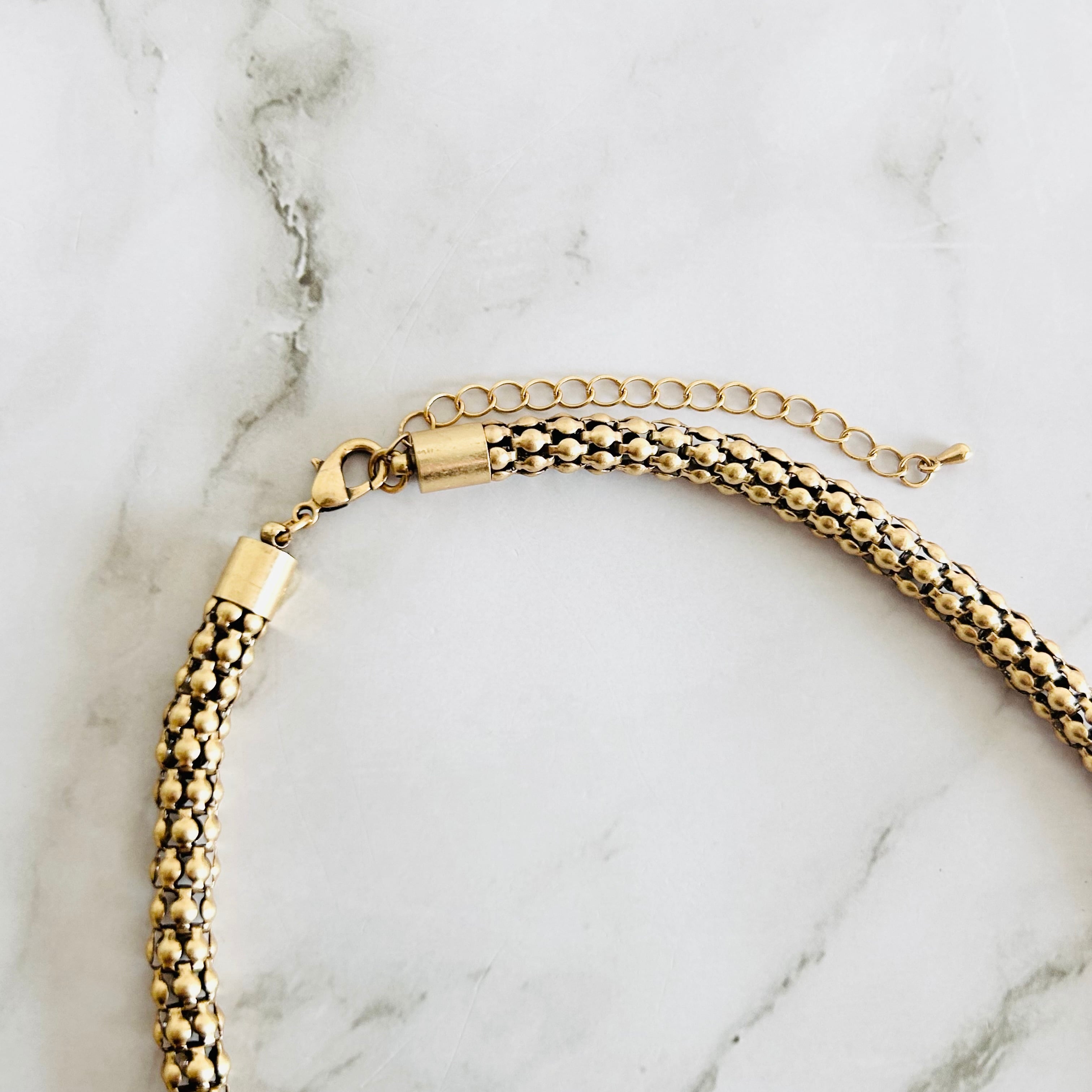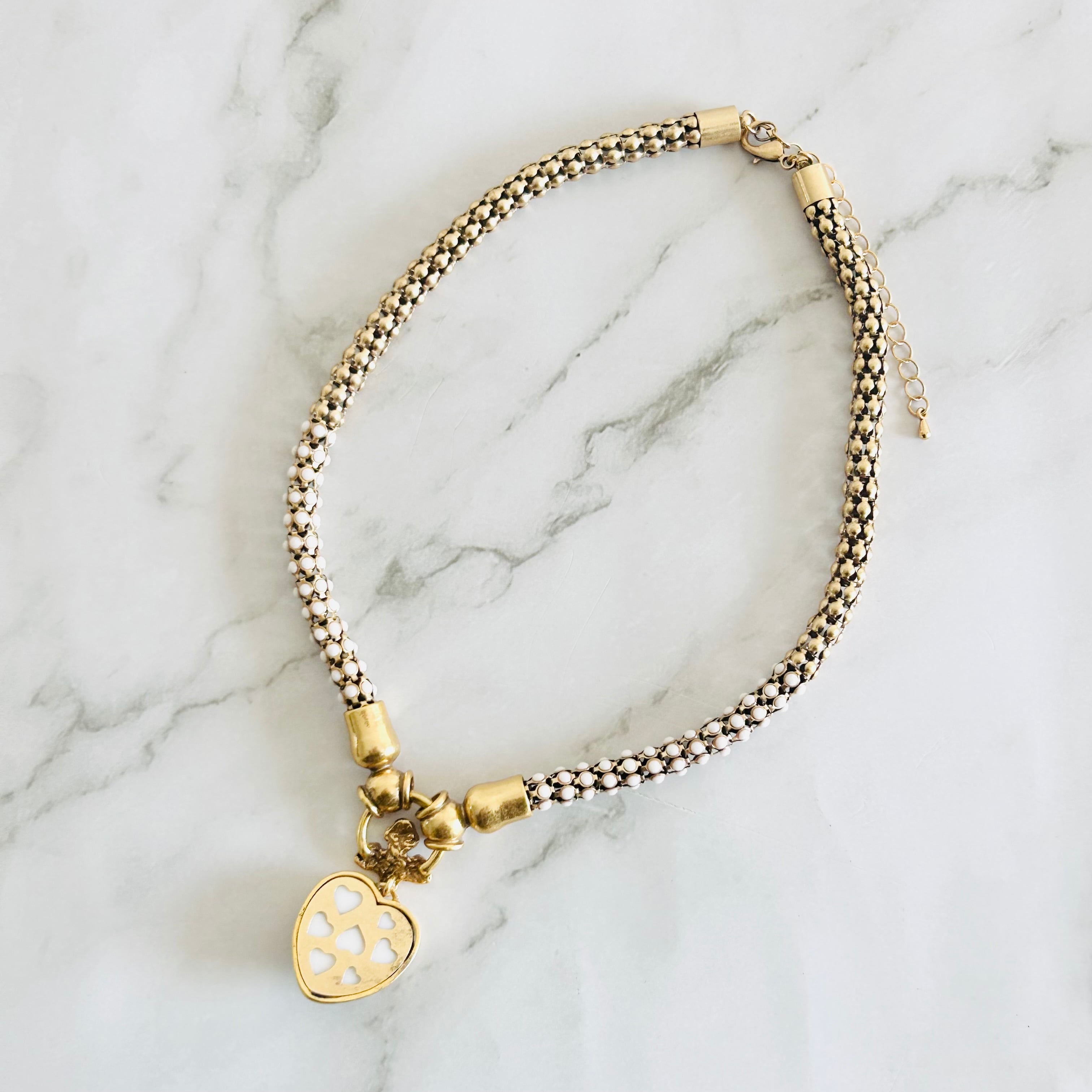 ゴールドを基調に、繊細に編み込まれたメッシュチェーンに、ビジューをあしらったハートモチーフを添えたネックレスです。