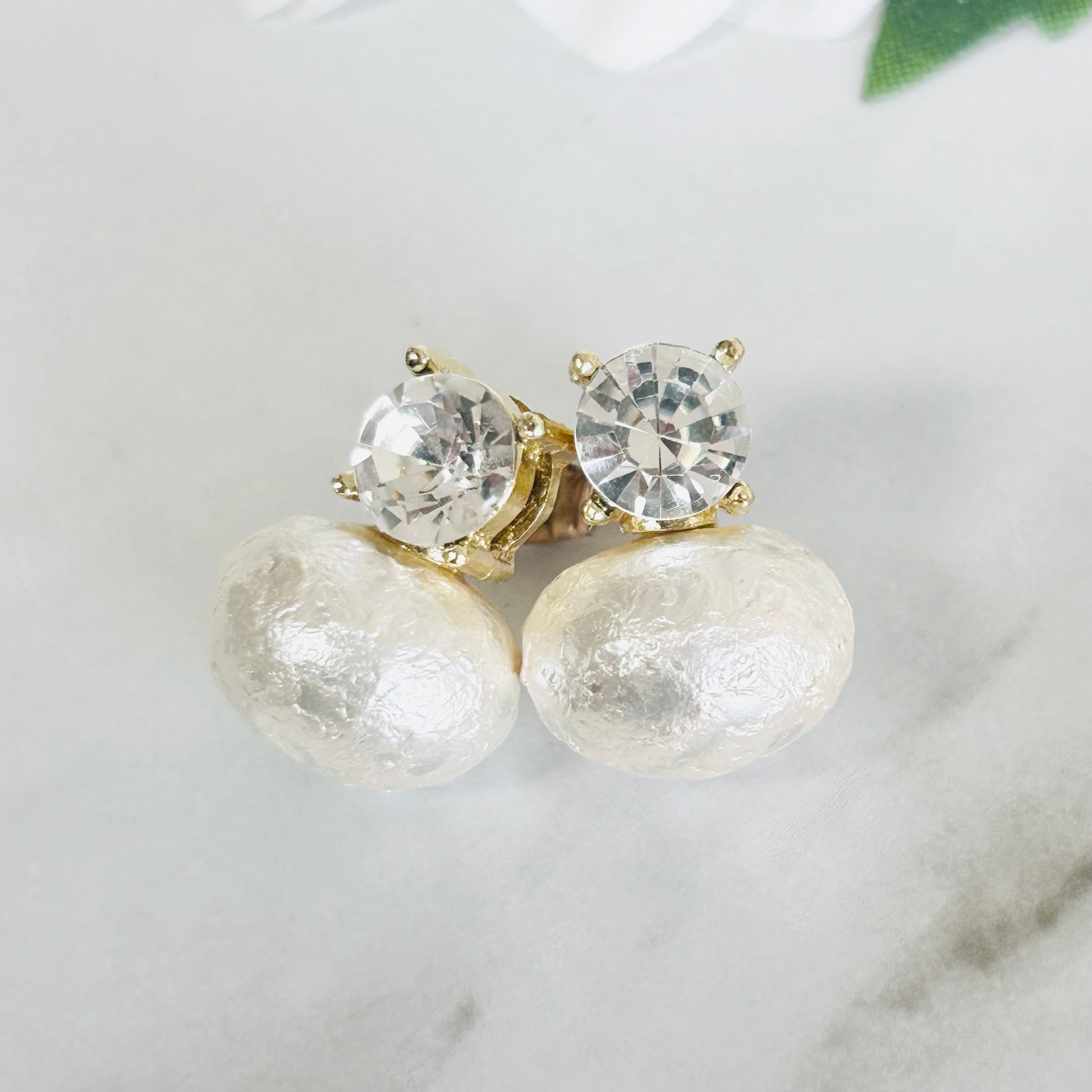 艶やかな大粒コットンパールに、上部には輝きの美しいクリアストーンをあしらったデザインです。