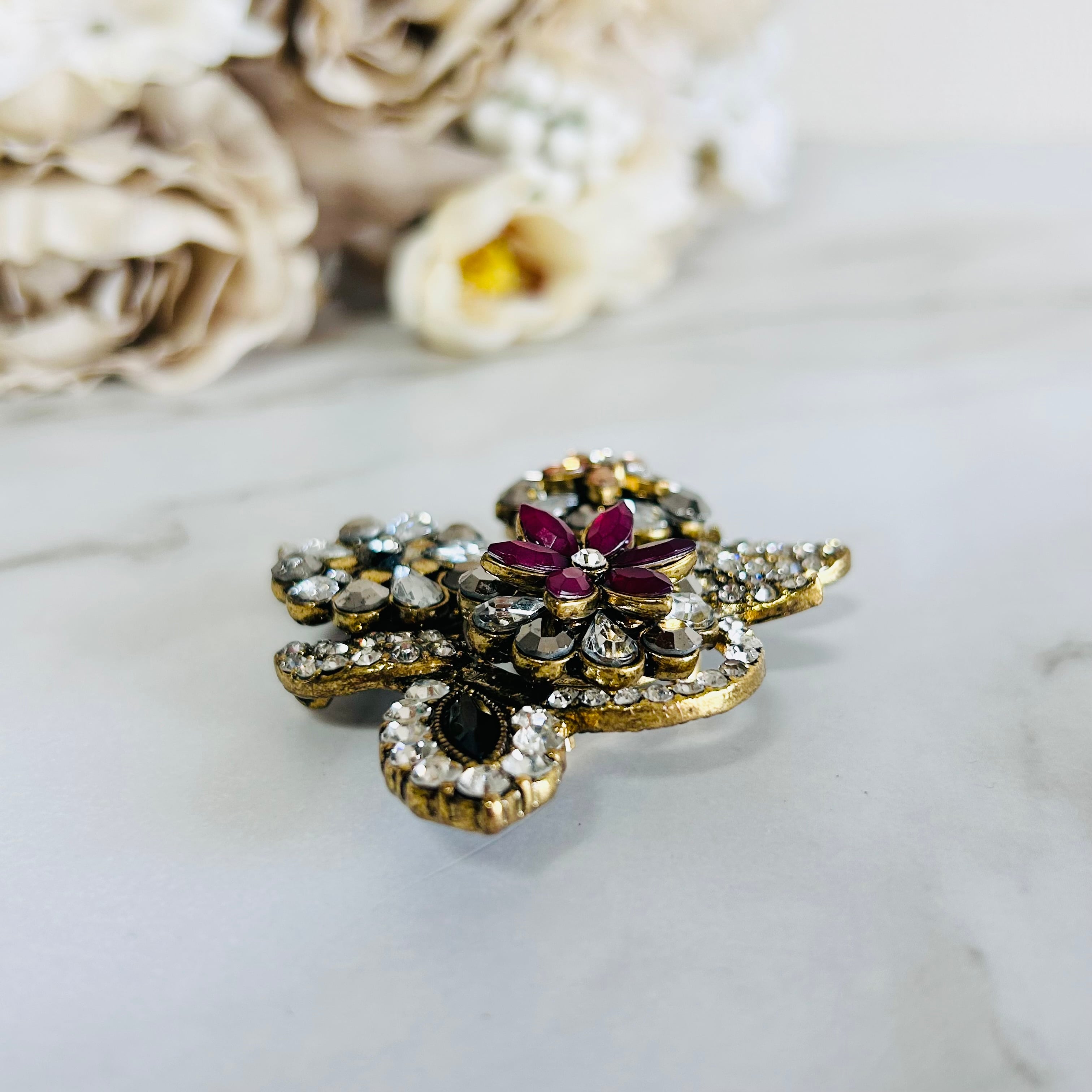 中央のルビーカラーのフラワーが華やかなアクセントとなり、周囲を囲む大小さまざまなストーンが光を受けて美しく輝きます。