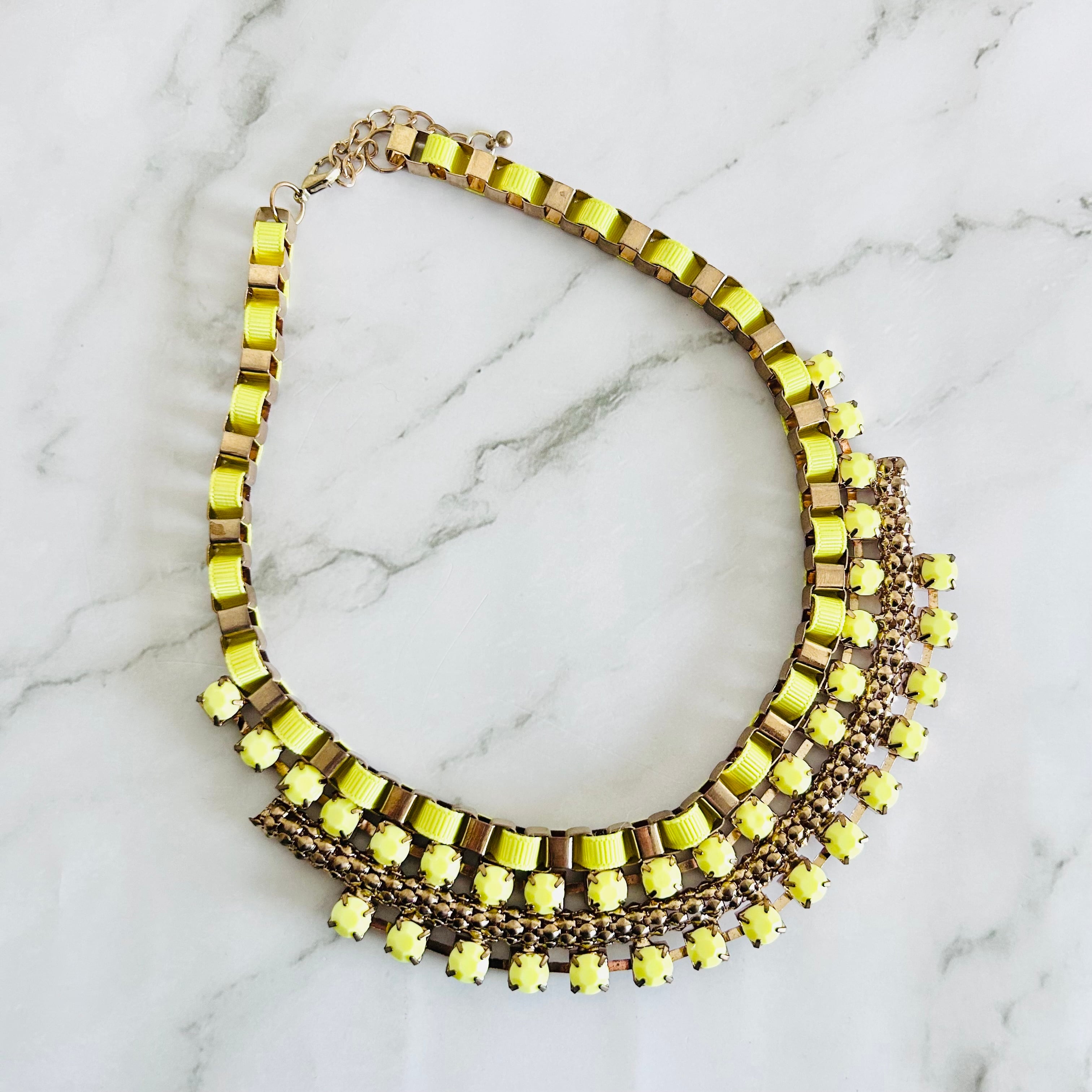 鮮やかなレモンイエローのストーンと、アンティークゴールドのスクエアチェーンを組み合わせた、ネックレスです。