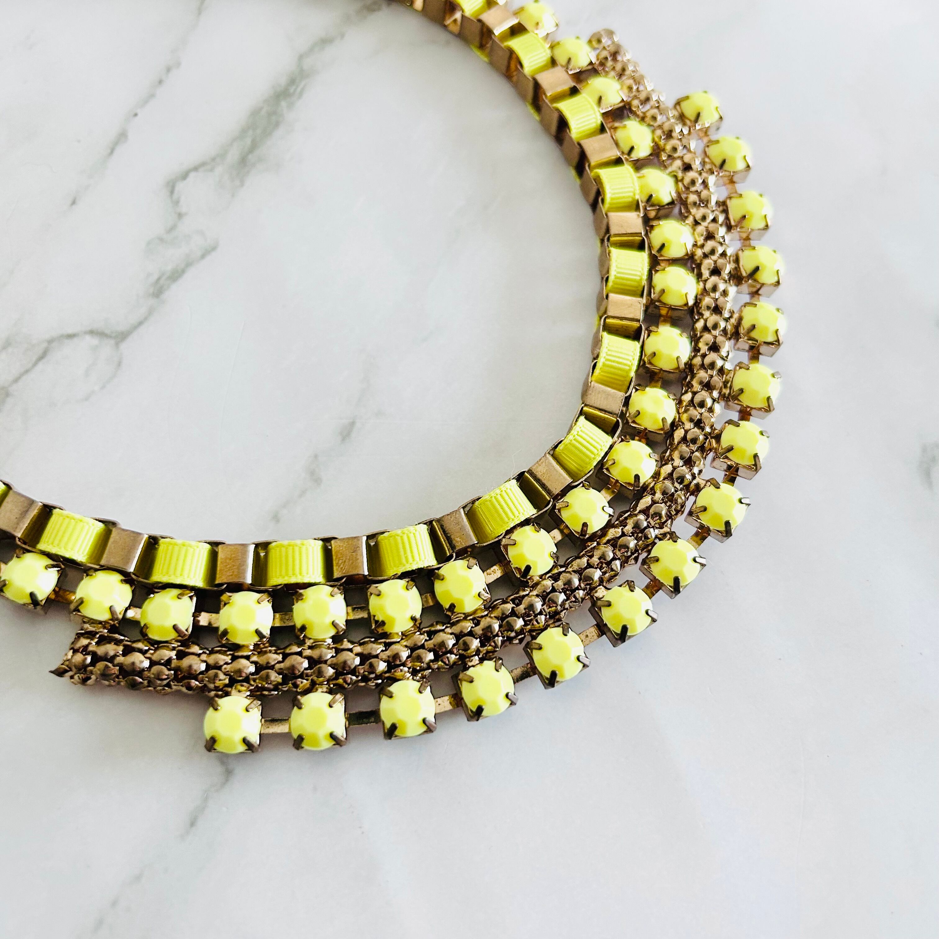 上段には、チェーンにコードを編み込み、リズミカルに並ぶレモンイエローのビジューパーツ。