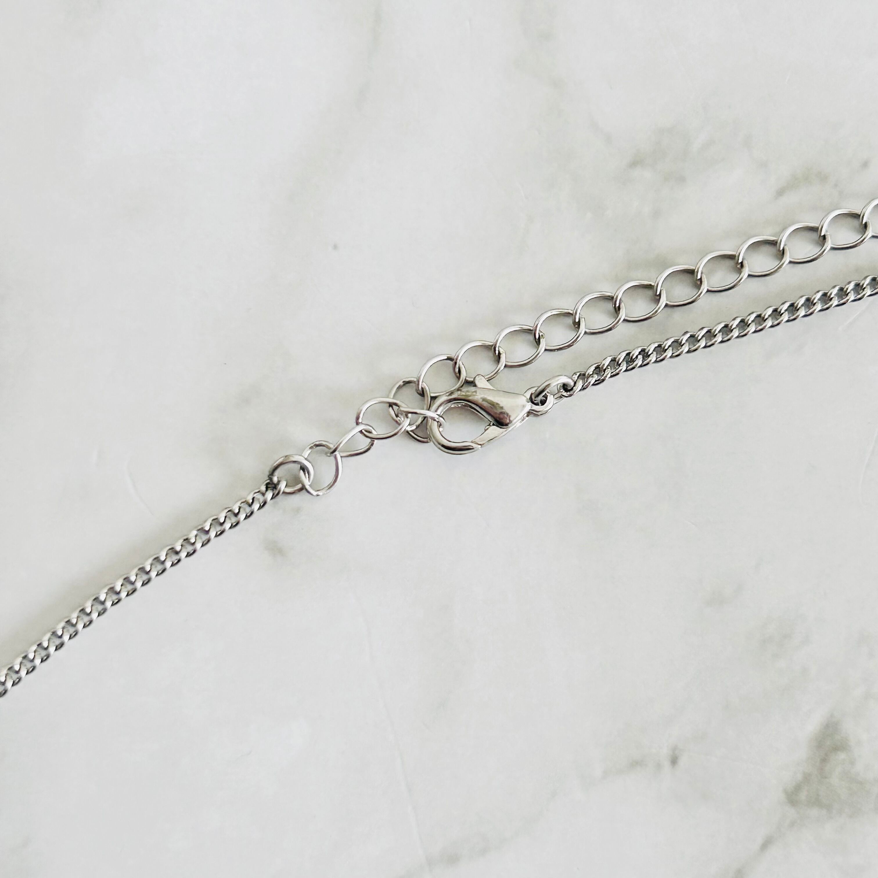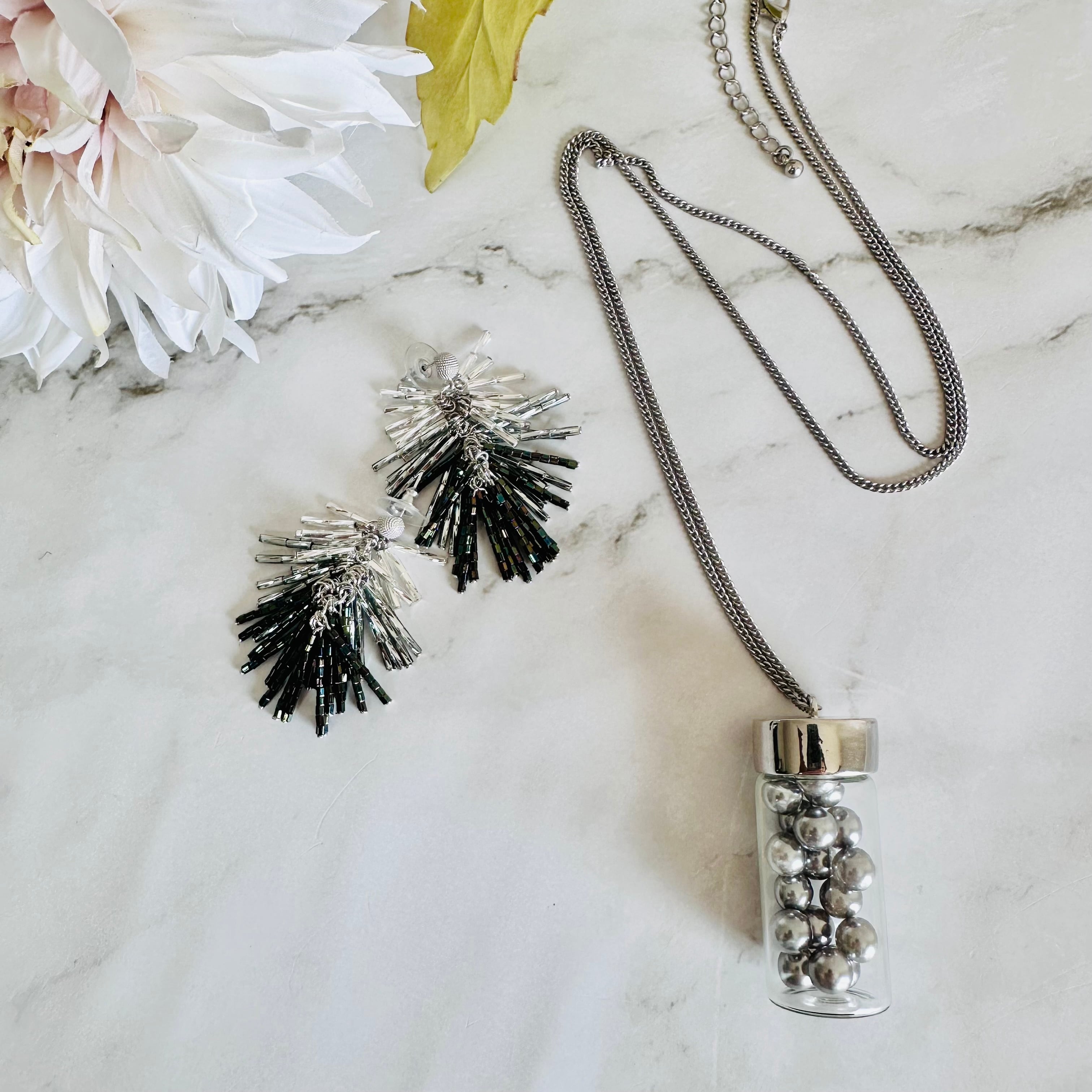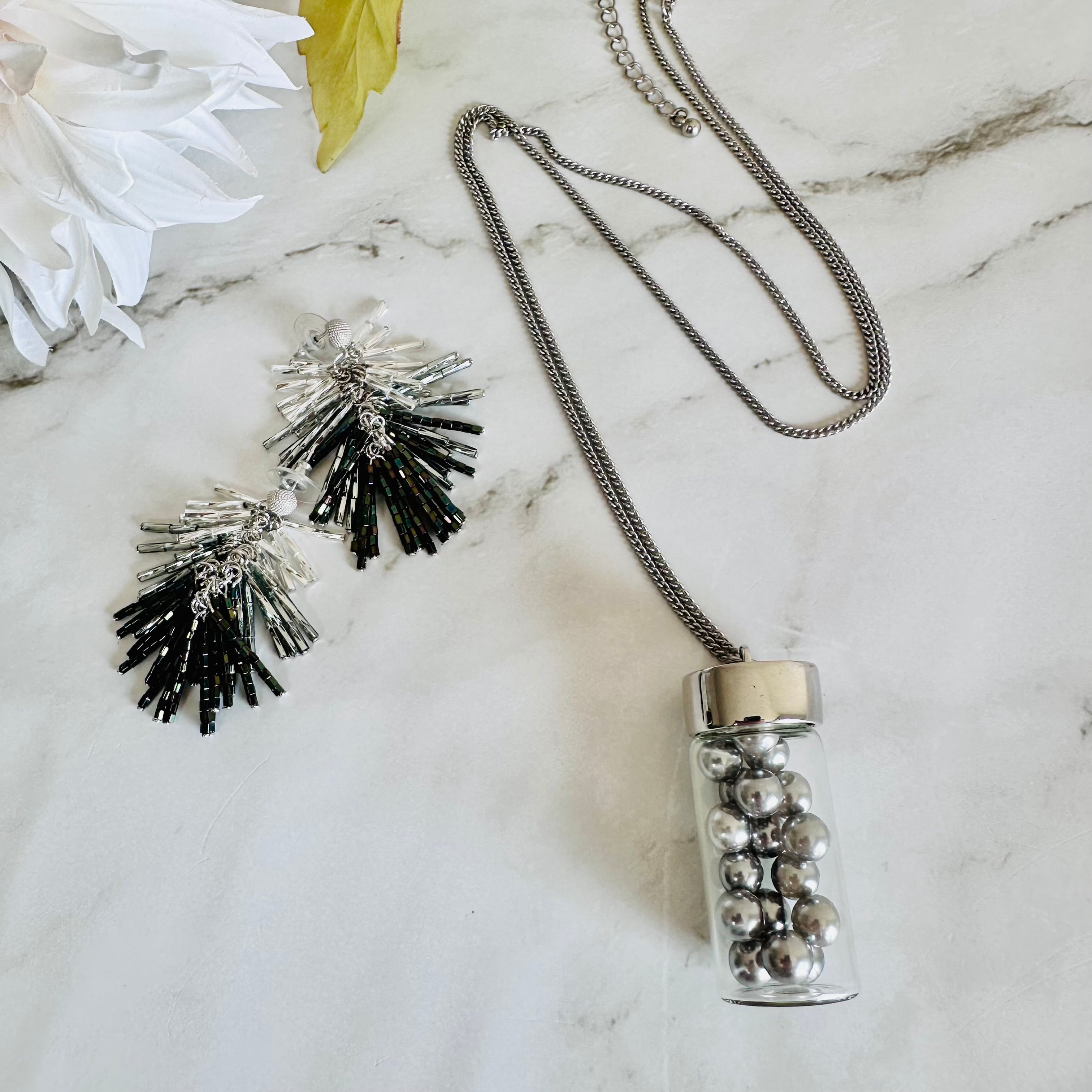 透明感のあるガラスボトルの中に、艶やかなシルバーパールを閉じ込めたペンダントネックレスです。