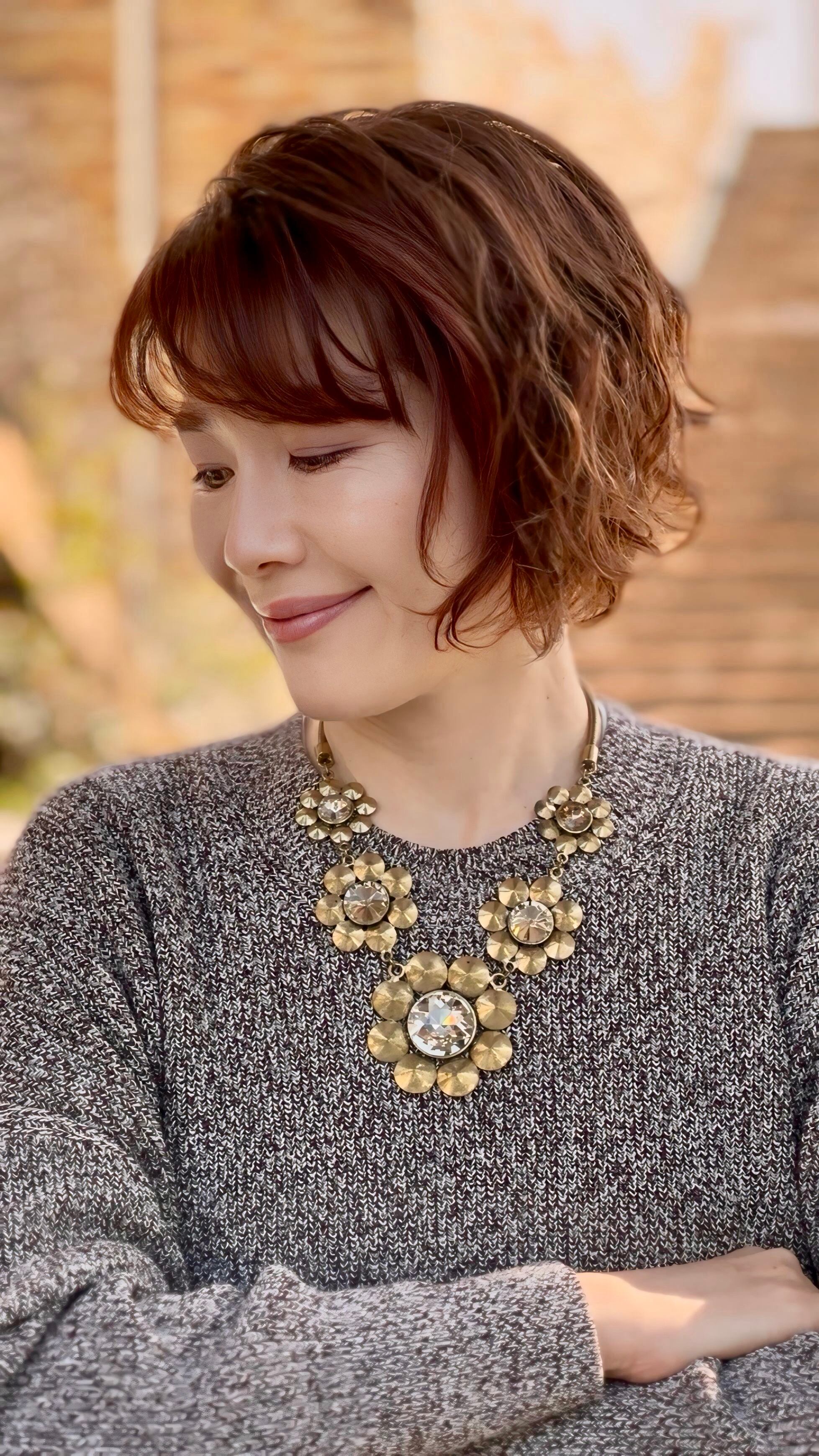 胸元に咲くような華やかさが、自然と背筋を伸ばし、自信と高揚感をそっと引き出してくれるネックレスです。
